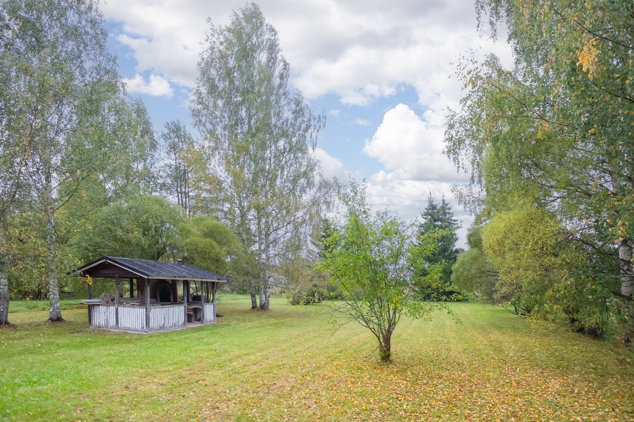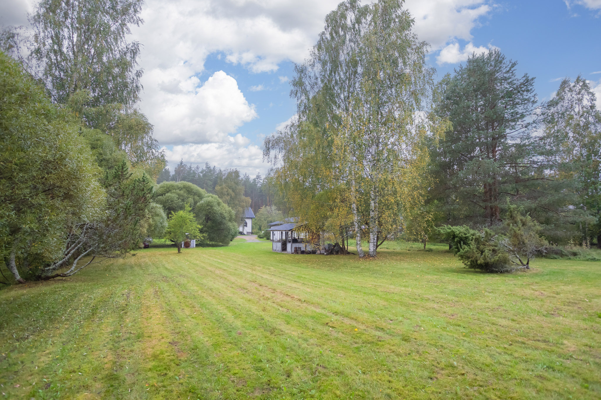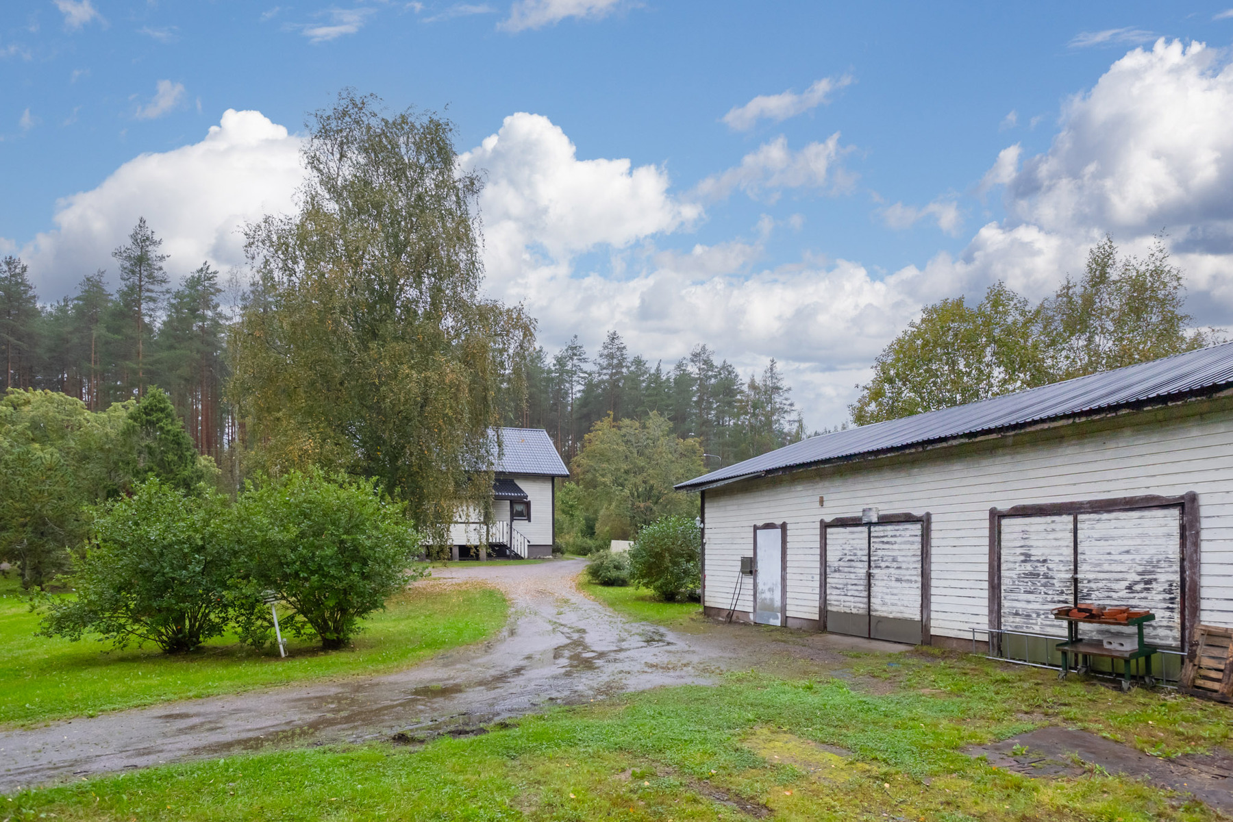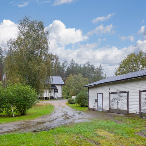 Suuri tasainen pihapiiri on pääosin nurmea ja rajoittuu osittain peltoon. Noin 100 m²:n ulkovarasto soveltuu korkeutensa ja leveiden oviensa ansiosta monenlaiseen käyttöön.