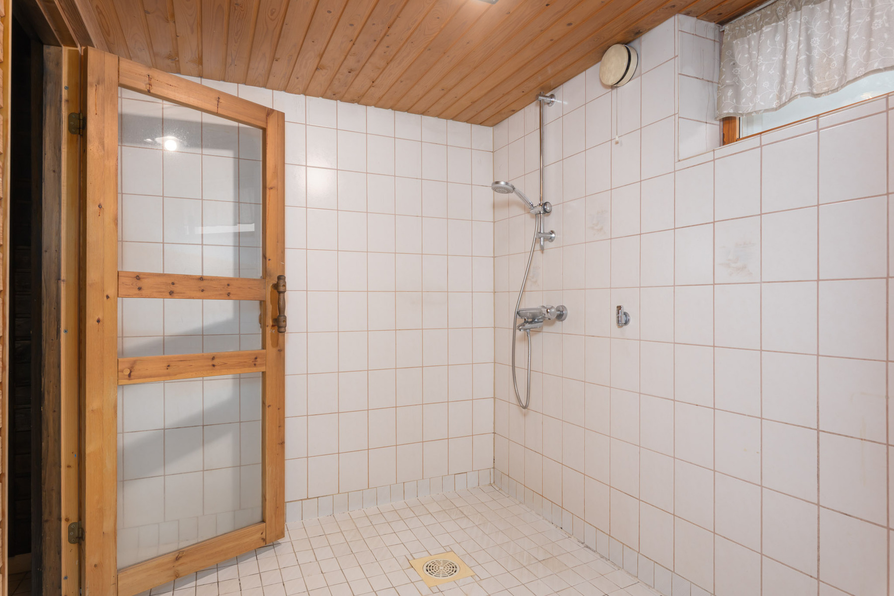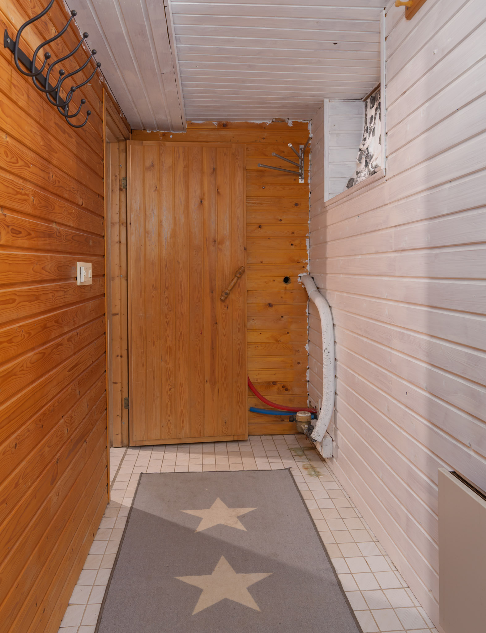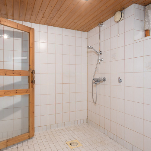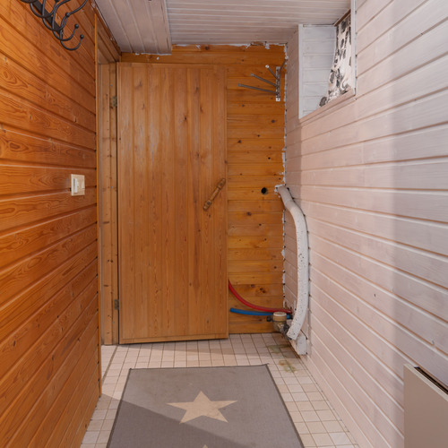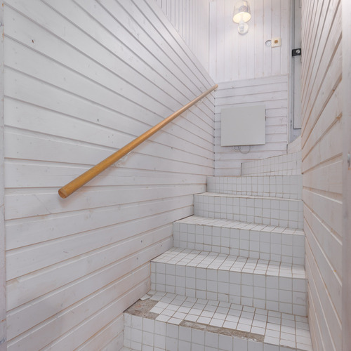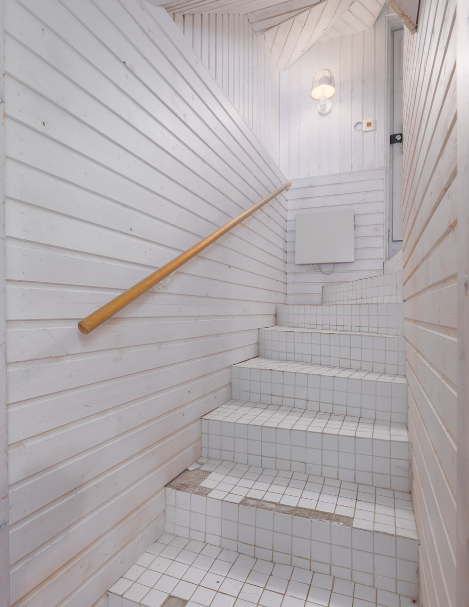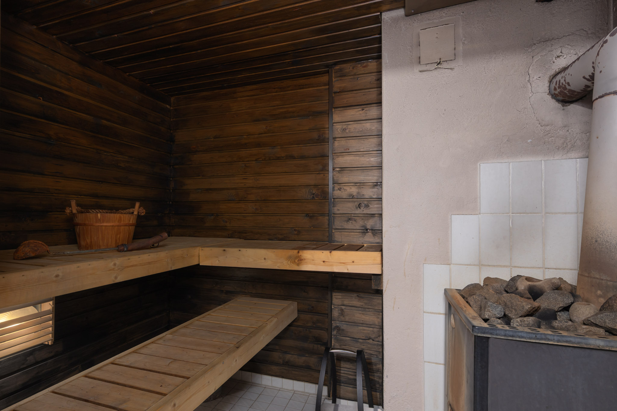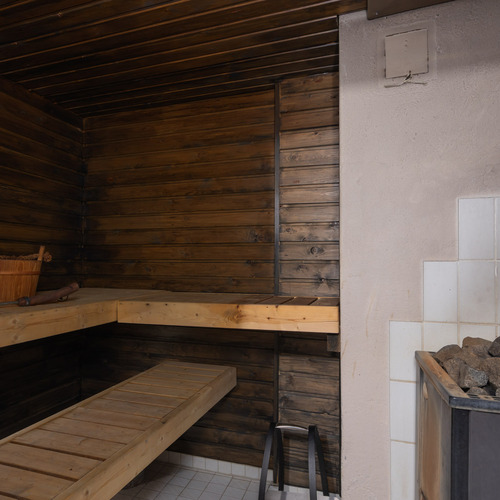 Puulämmitteinen sauna. Lattia: laatta. Seinät: puupaneeli.