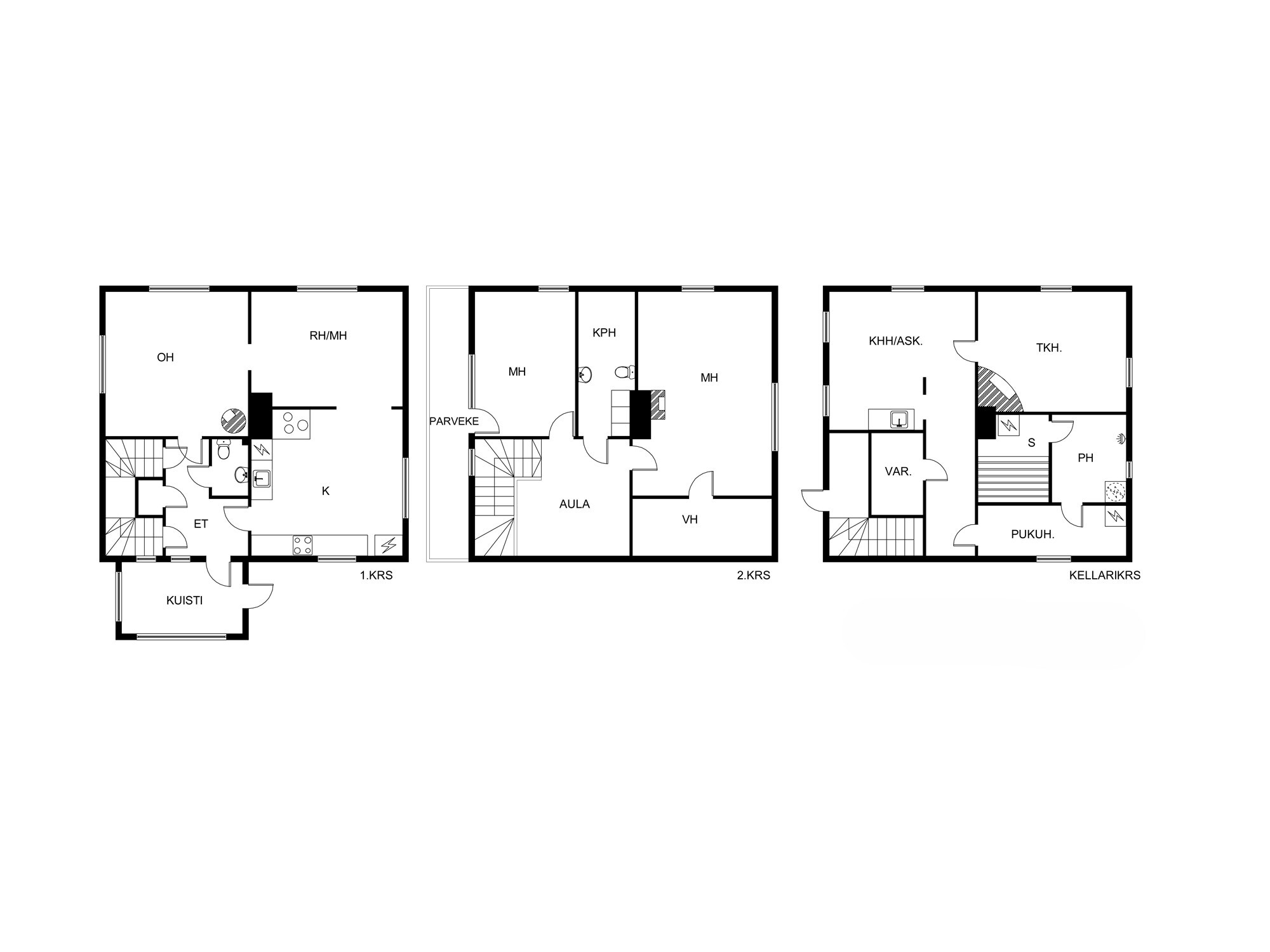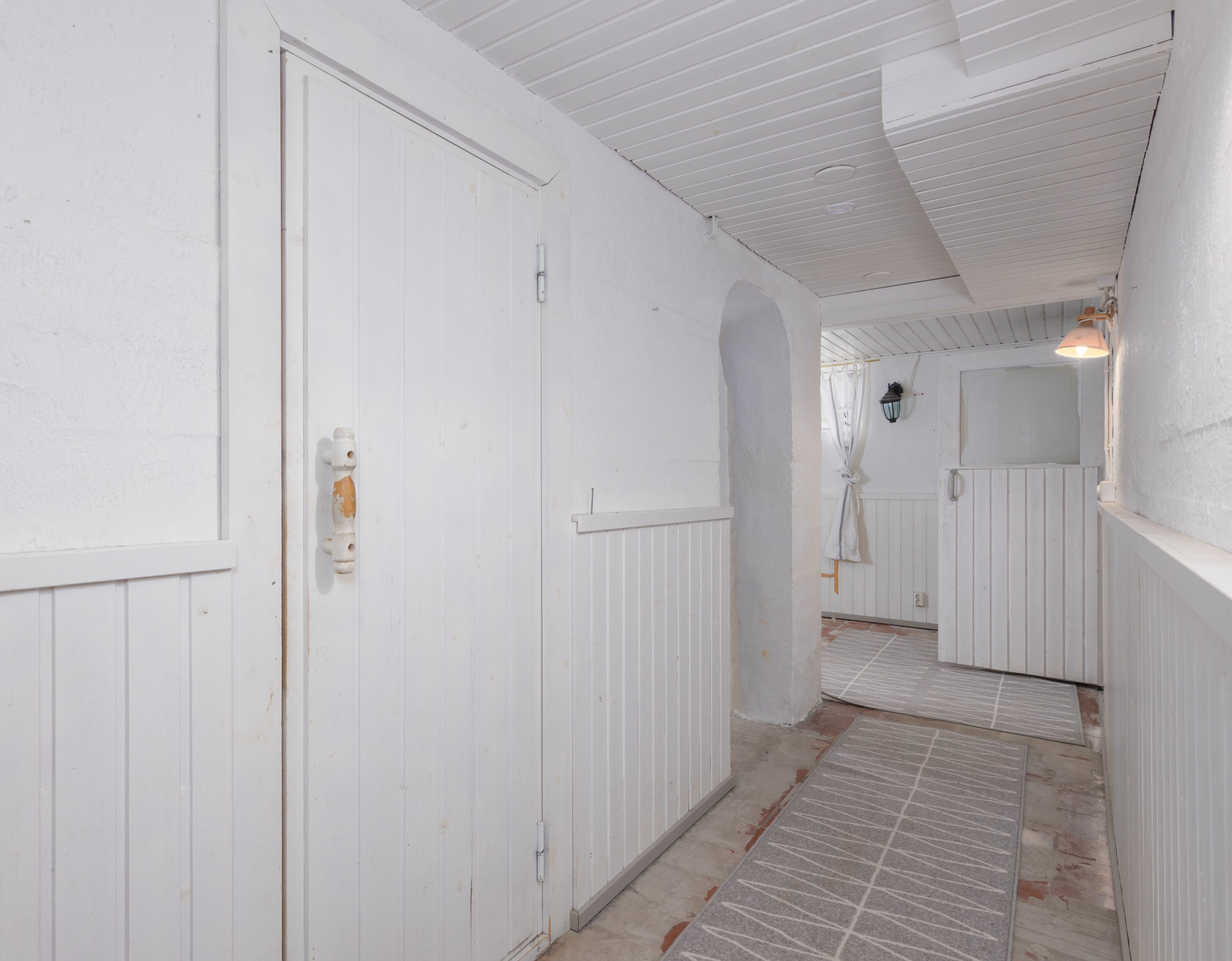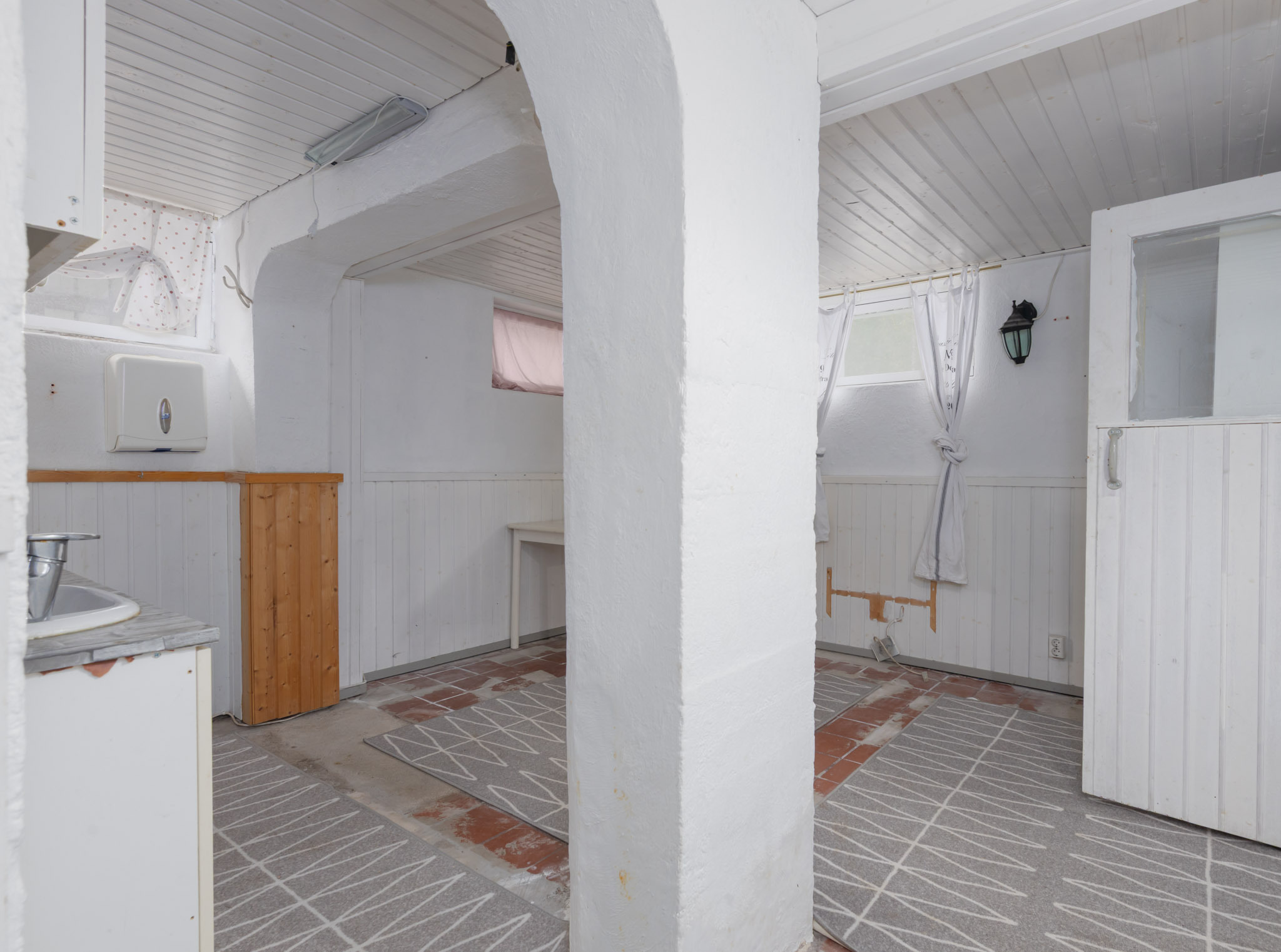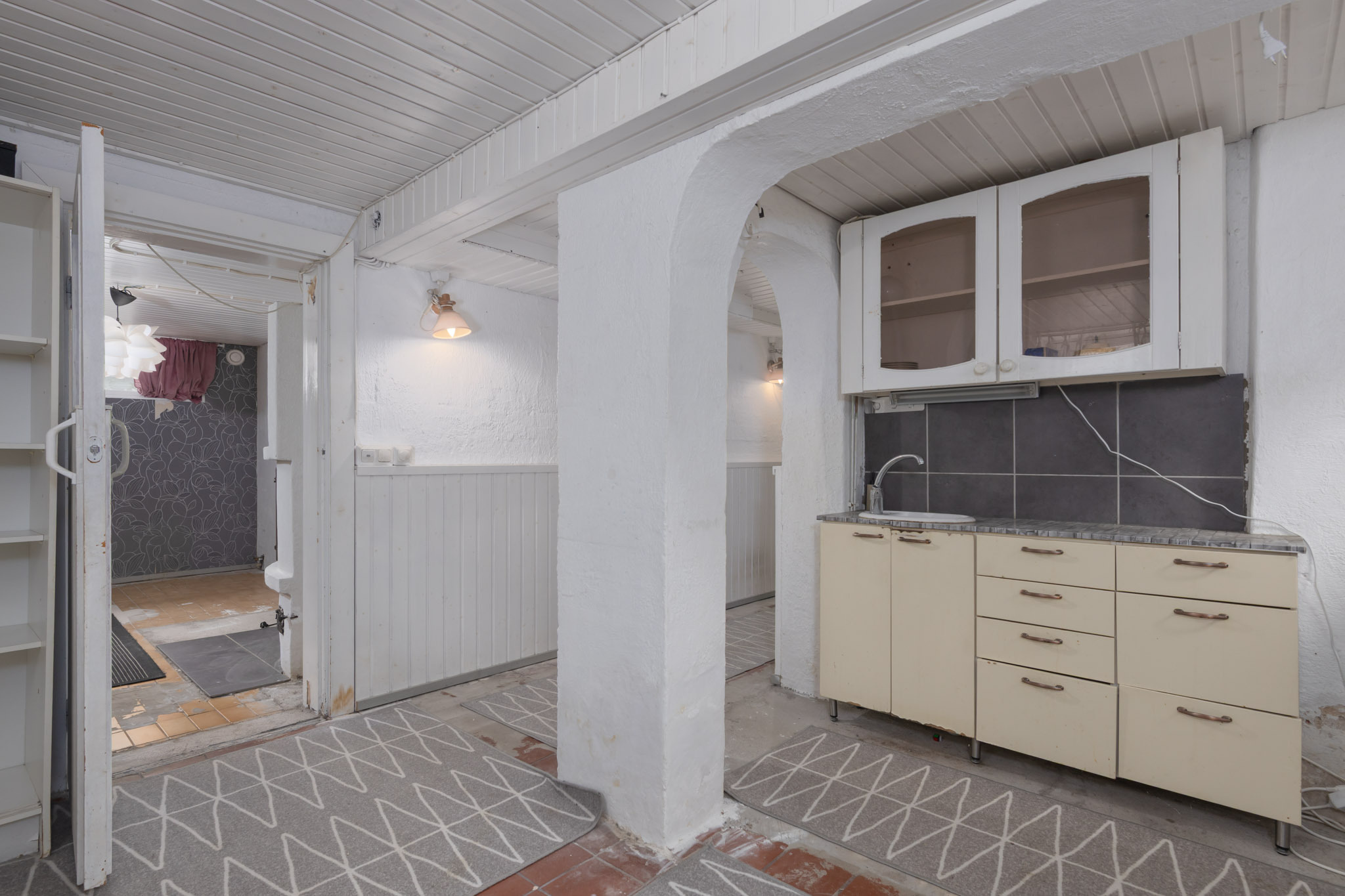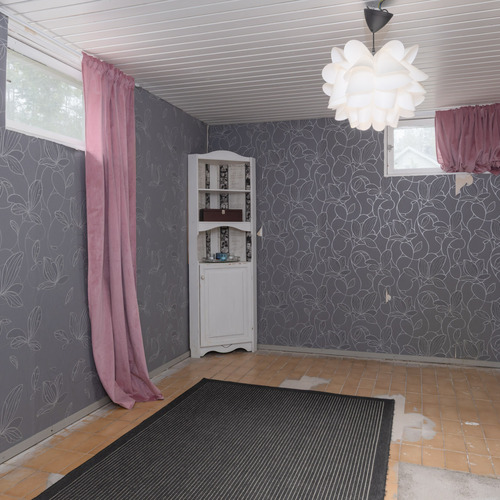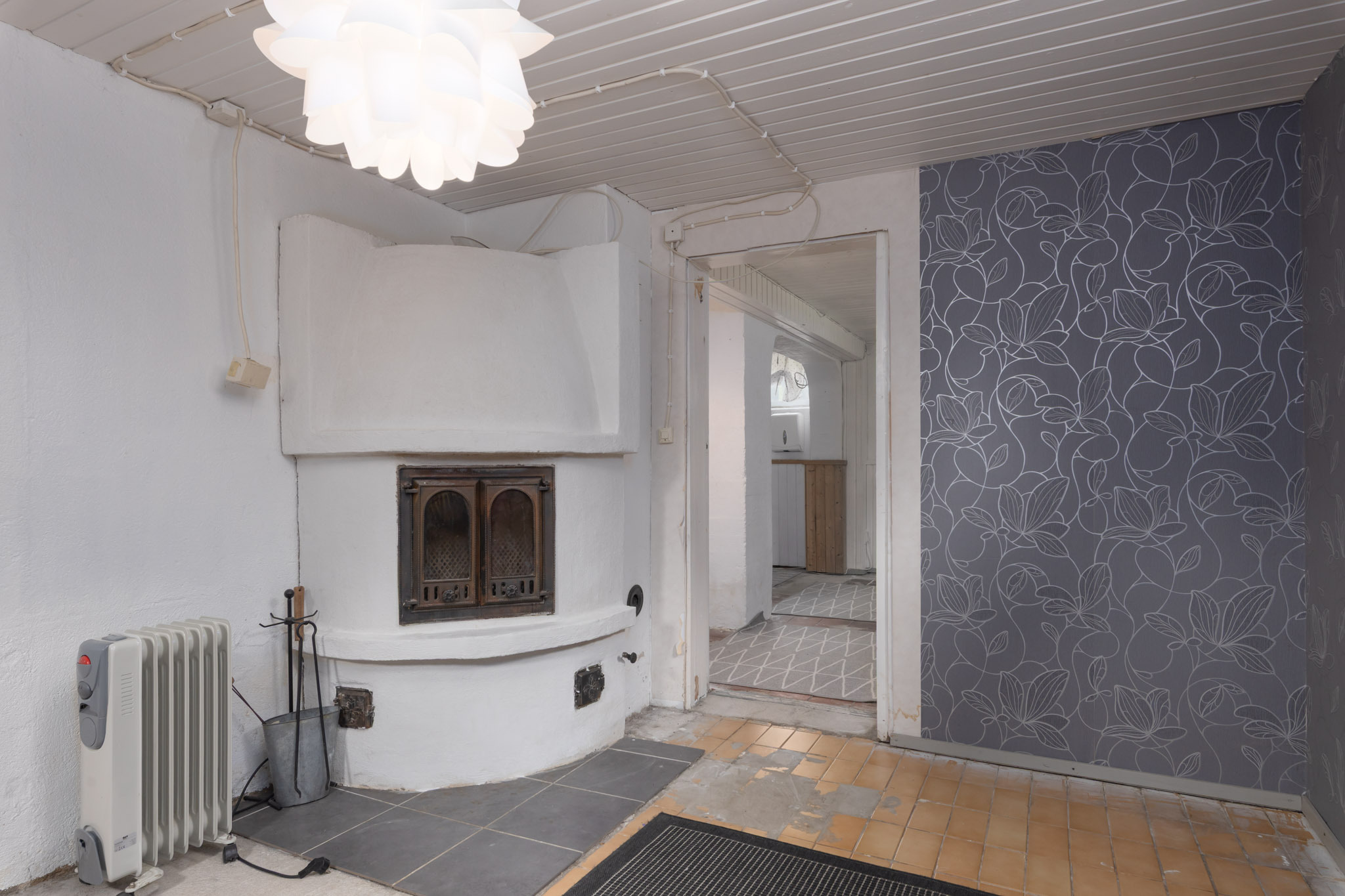 tapetti/maali. Lattia: lauta. Kellarin takkahuone on viimeksi käytetty makuuhuoneena.