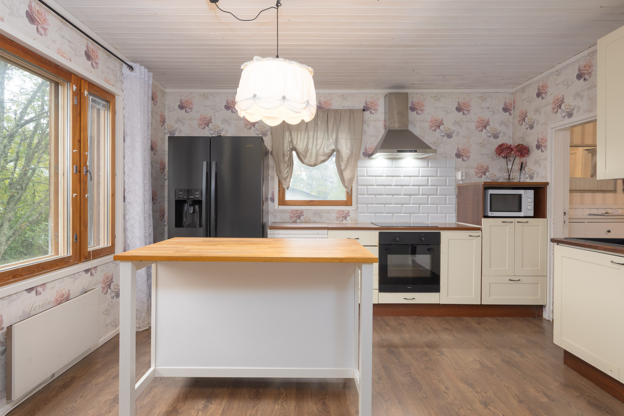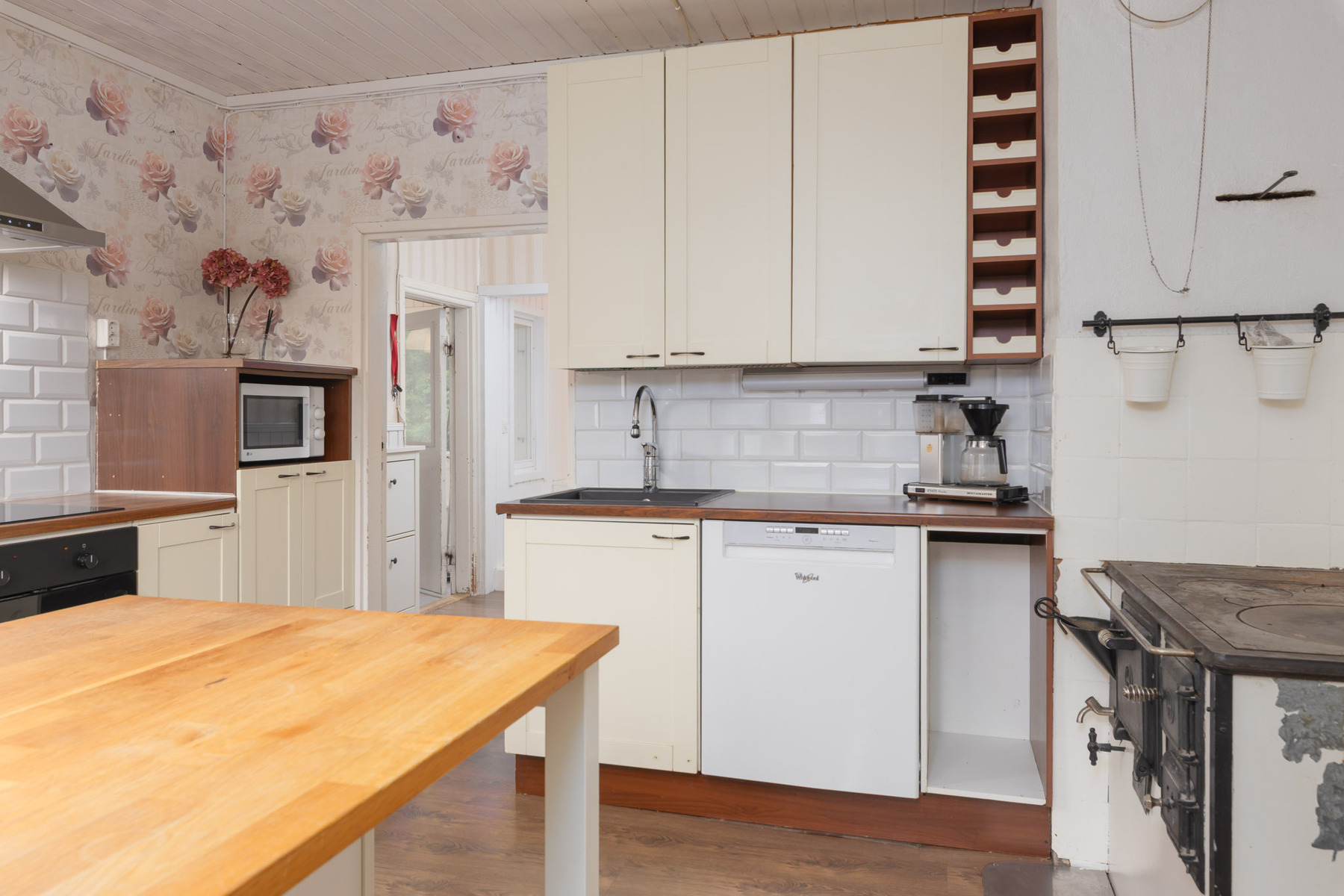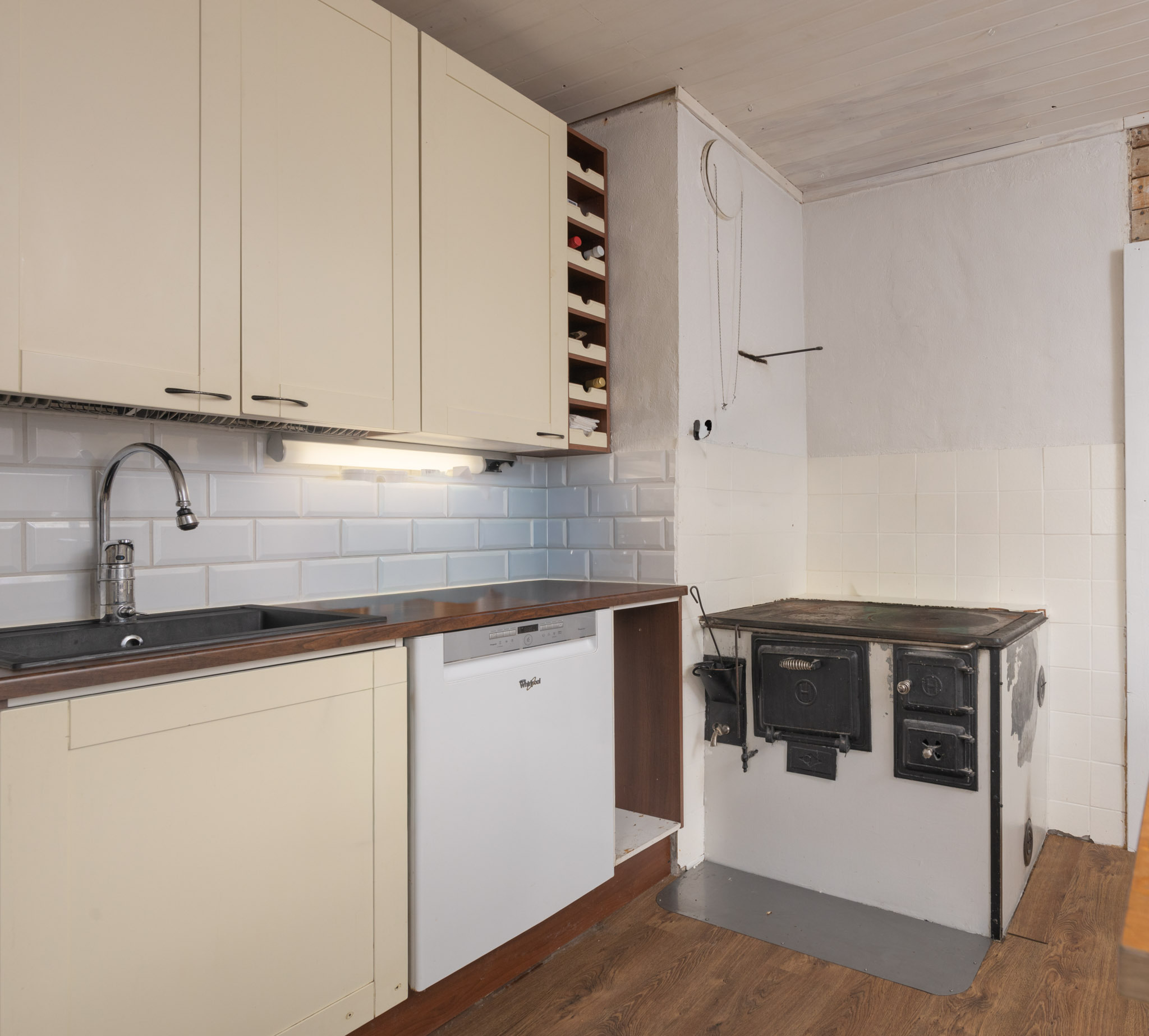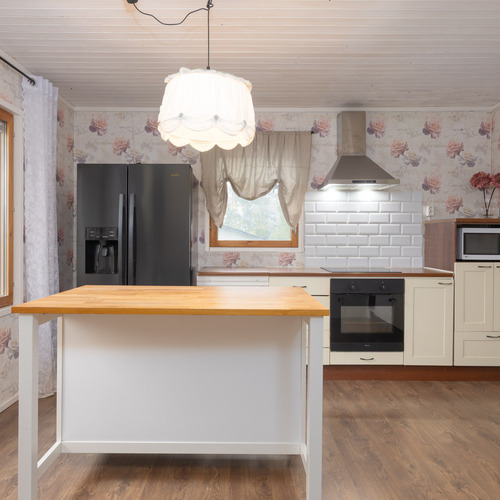Keittiö remontoitu (ulkoseinien lisäeristys sisäpuolelta, uretaani-kipsilevy,