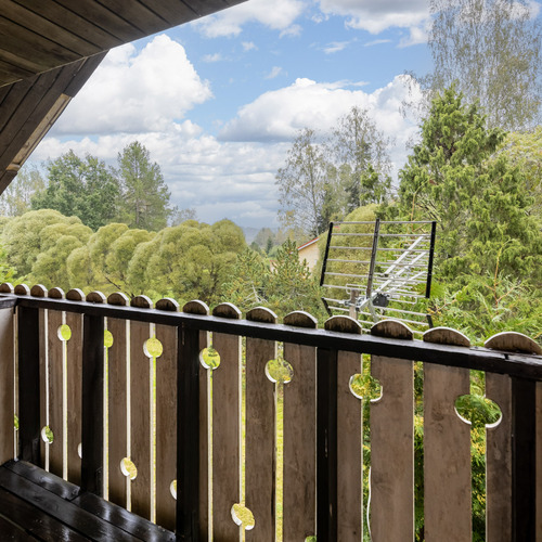 Koko talon levyinen parveke, jolta kulku portaita pitkin terassille/ulos.