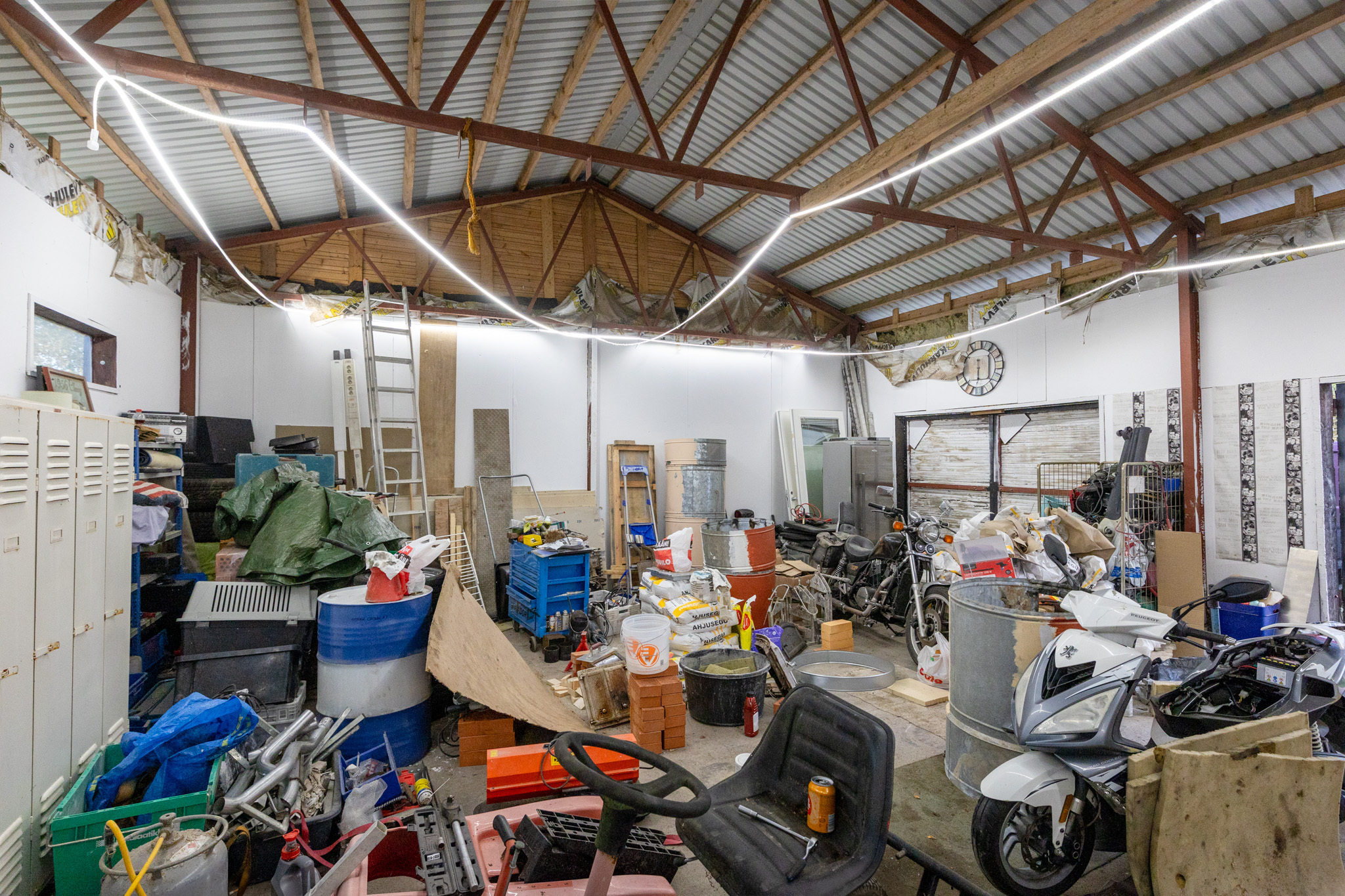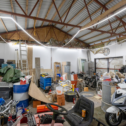 Erillinen n. 100 m² kylmä ulkovarasto, jonka sisäkorkeus n. 3 m, kaksi leveää ja yksi kapeampi käyntiovi.