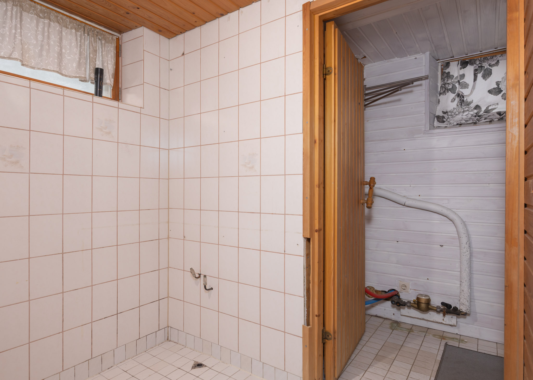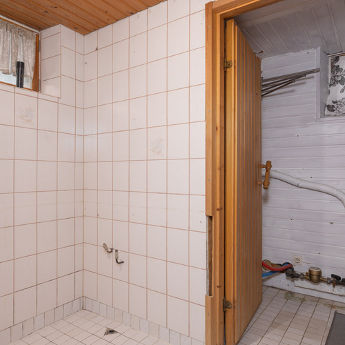 Yläkerran kylpyhuoneen takaosan laatoitus (seinät vanhan laatoituksen päälle, uusi vesieristys vanhan laatan päällä, lattiasta poistettu vanha laatta ja tehty uusi vesieristys) v. 2016.