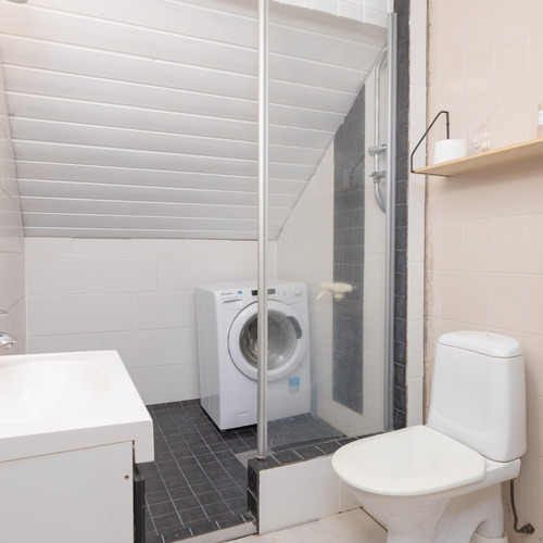 Toinen wc yläkerran kylpyhuoneen yhteydessä. Lattia: laatta. Seinät: laatta.
