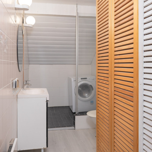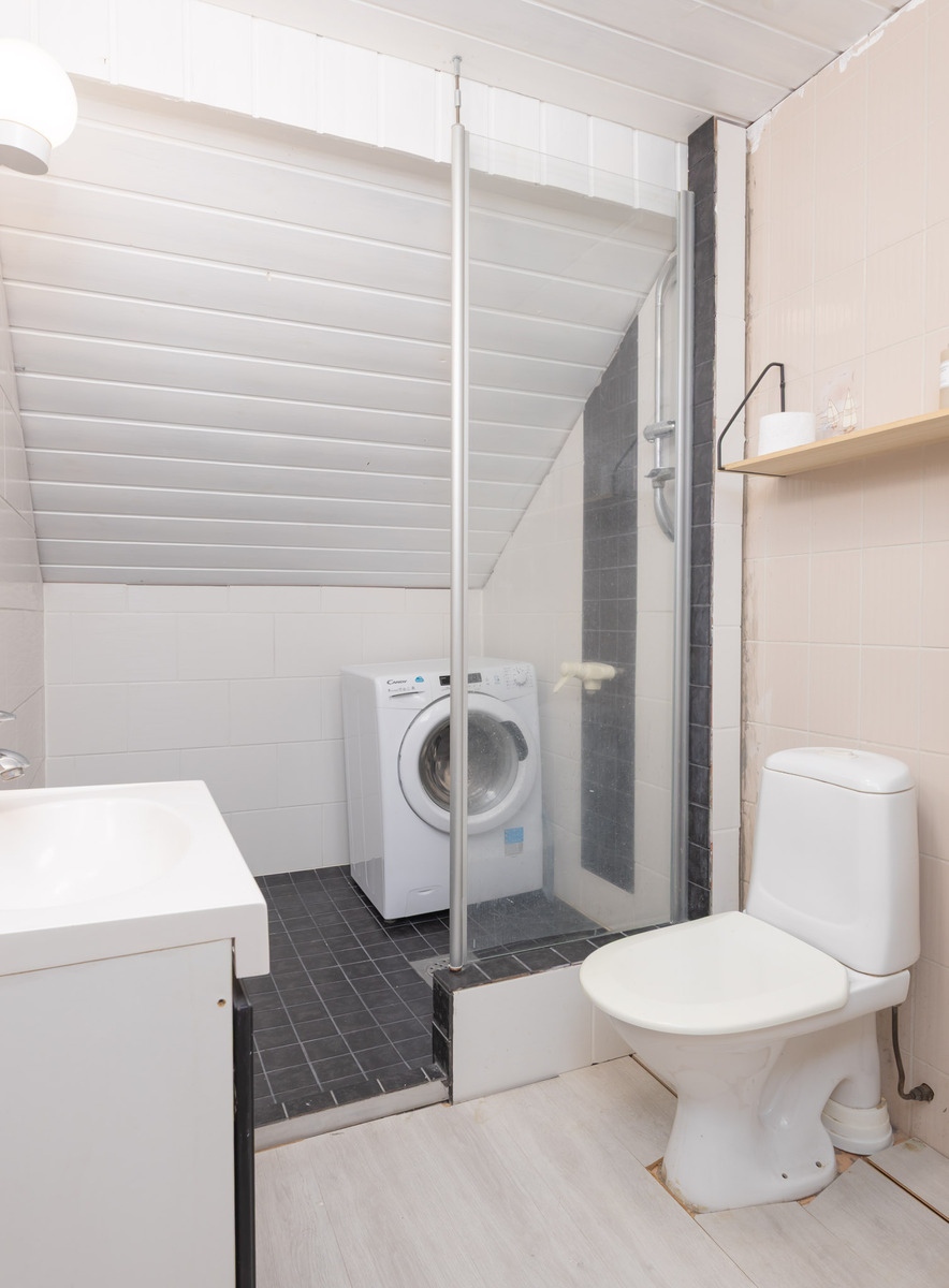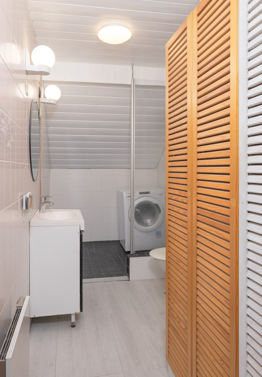 Yläkerran kylpyhuoneessa suihkuvaraus, wc-istuin, peili, pesuallas, allaskaappi, kaapistot. Seinät: laatta. Lattia: laminaatti/laatta.