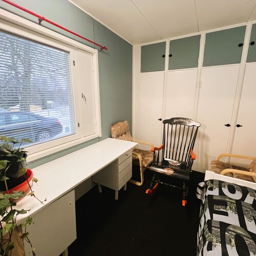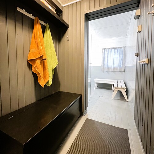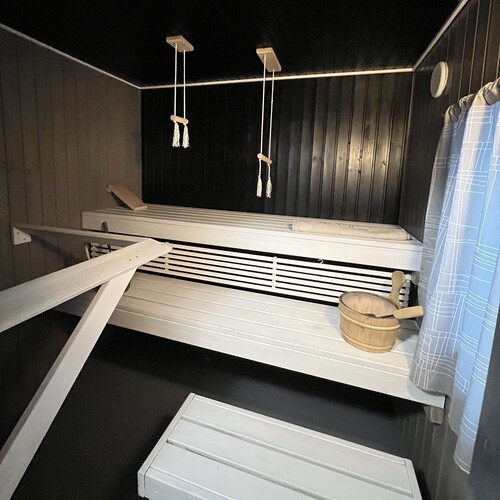 Lattia laatta. Seinät paneeli. Sähkökiuas. Mahdollisuus vaihtaa puukiukaaseen, koska talossa on piippu. Sauna päivitetty kauttaaltaan 2024. Katto ja takaseinä musta. Muut seinät harmaa. Lauteet valkoiset. Katossa saunatrapetsi, jolla jalat saa makuulla ihanaan saunan lämpöön.