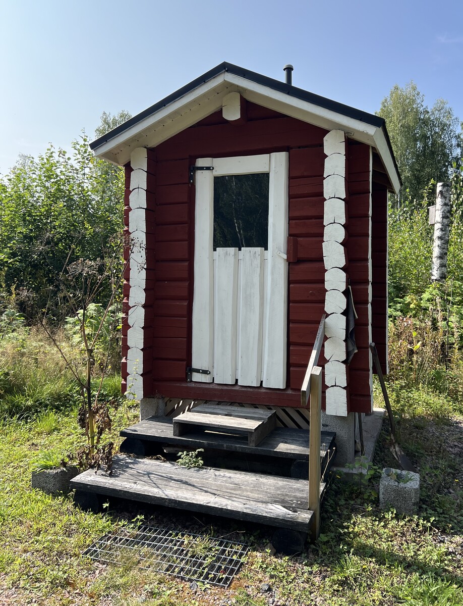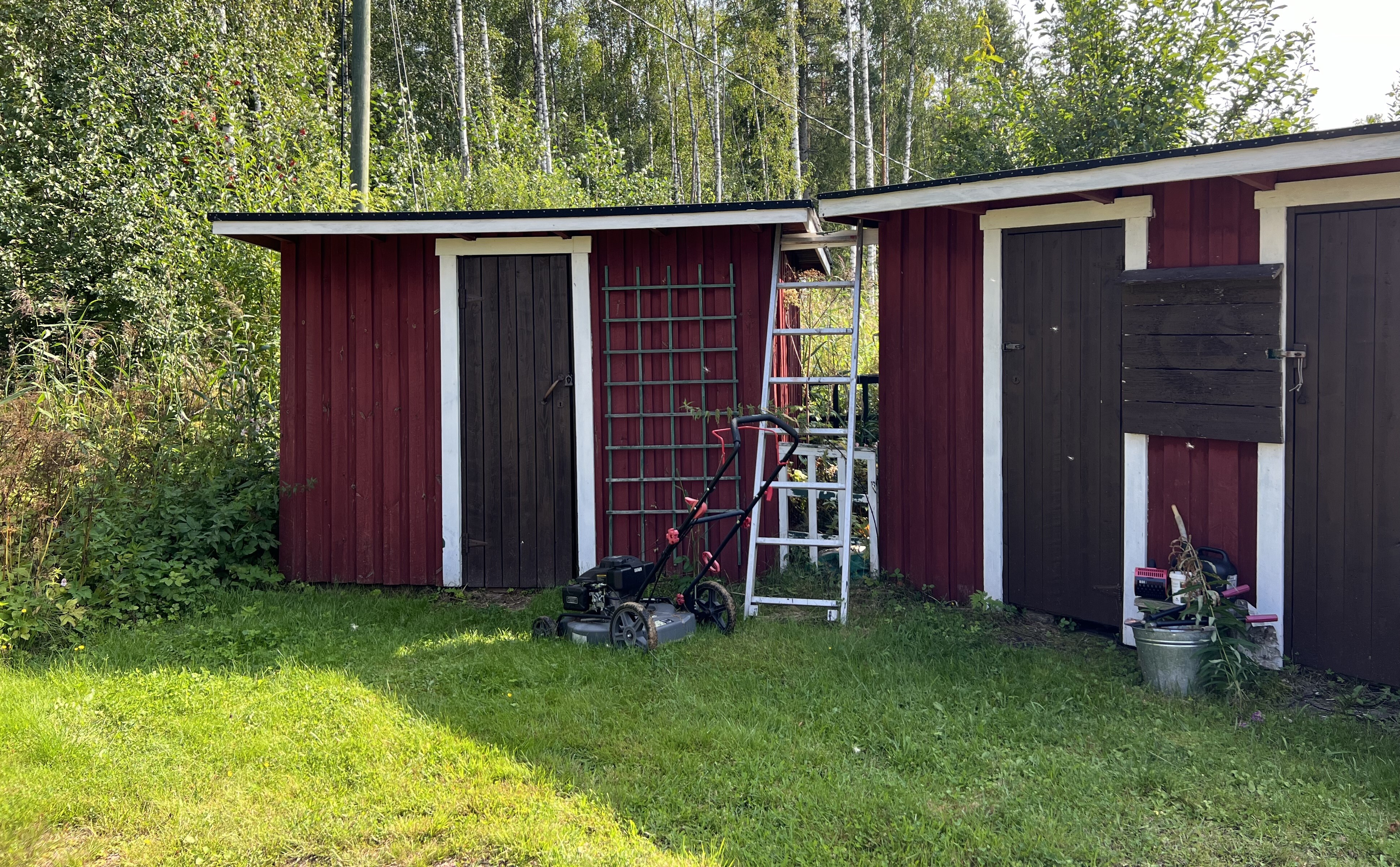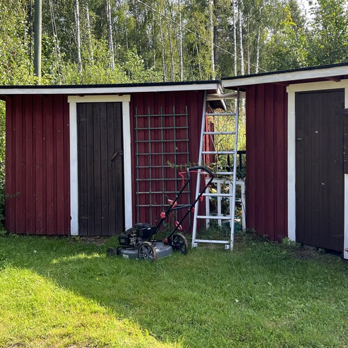 Pihapiirissä sijaitsee lisäksi kaksi hirsiaittaa, joihin mahtuu niin vieraita kuin varusteitakin. Tasainen, hoidettu piha tekee oleskelusta vaivatonta — oli kyseessä sitten pihapelit, oleskelu terassilla tai rauhallinen lukuhetki aitan portailla.