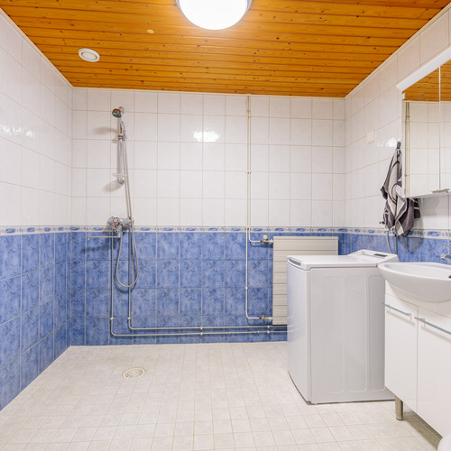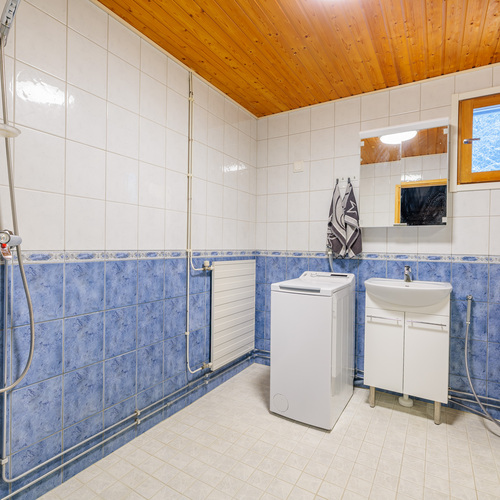 Varusteet: lattiaan asennettu WC, bidee, lattialämmitys, lattiakaivo, allaskaappi, peilikaappi, pesukoneliitäntä