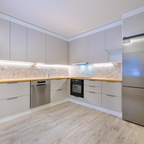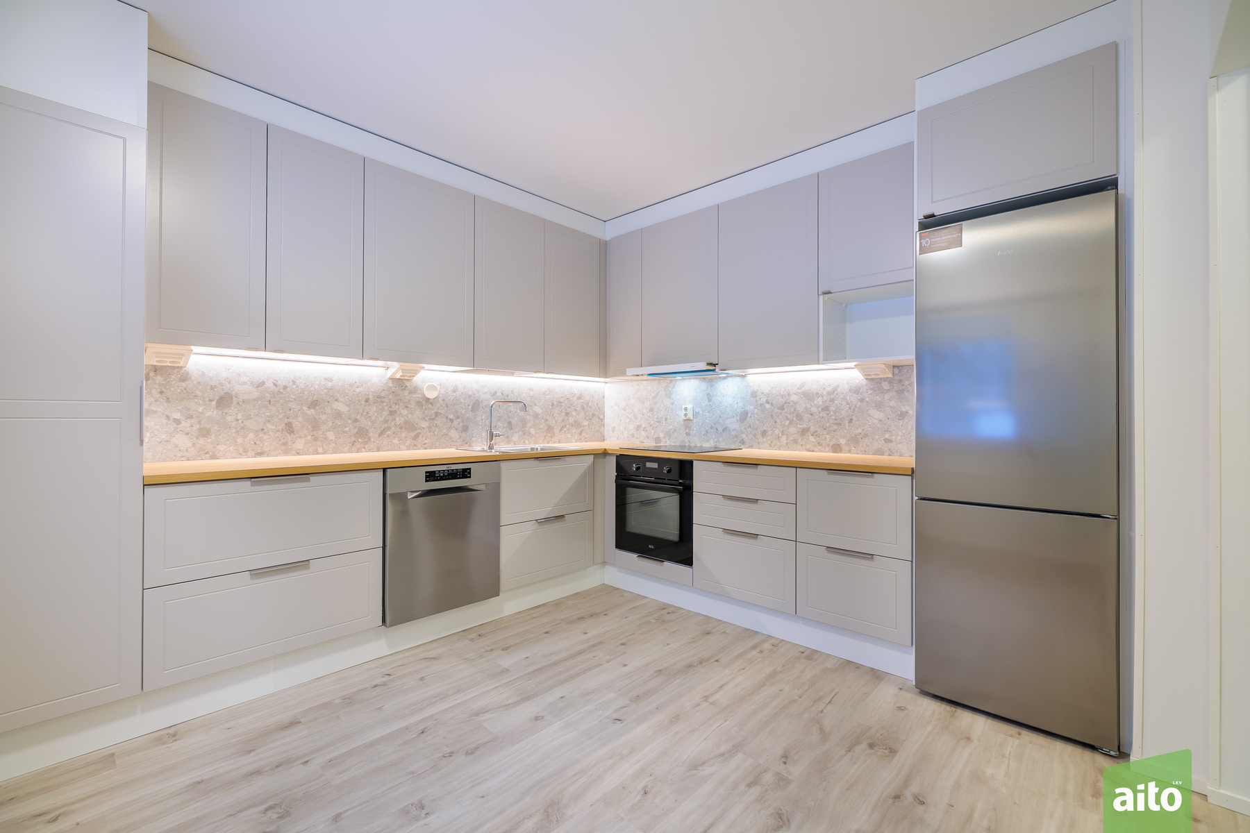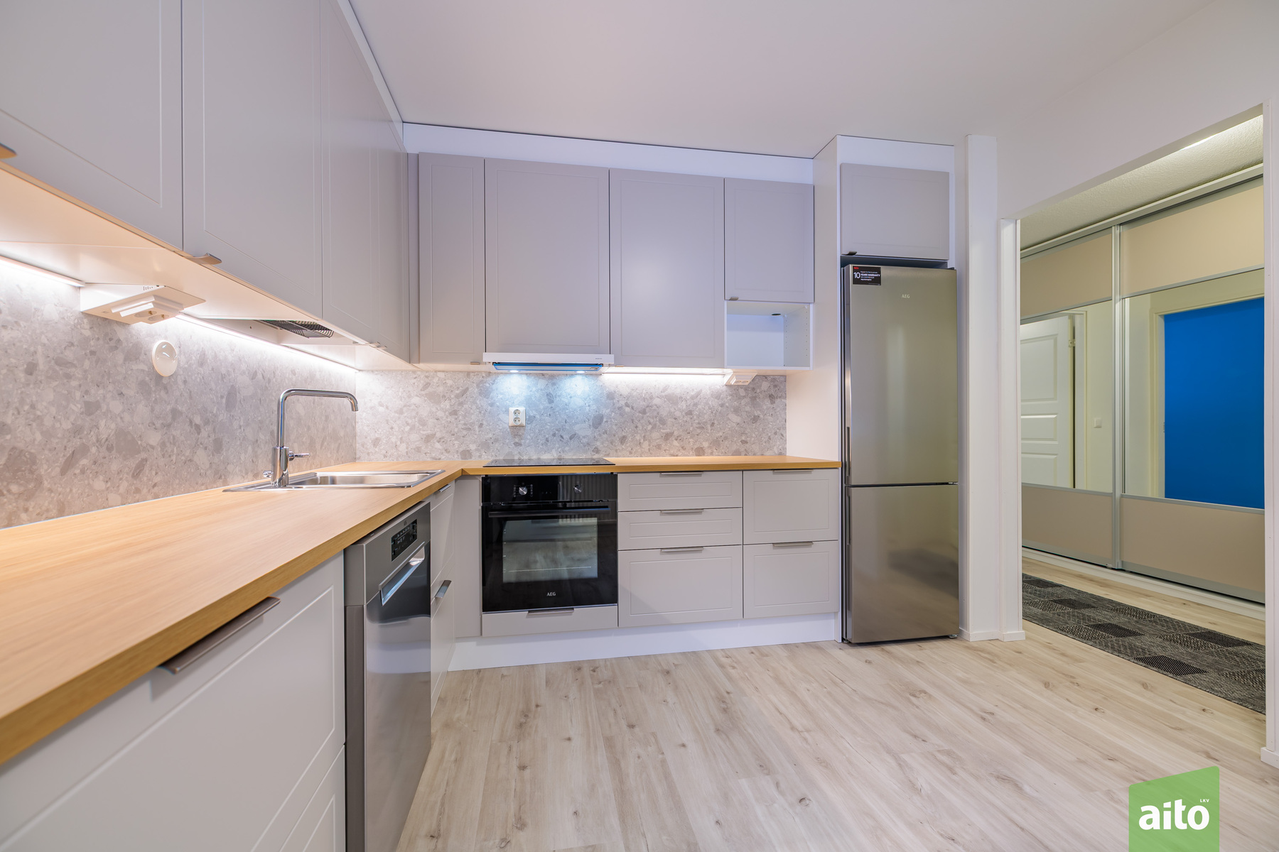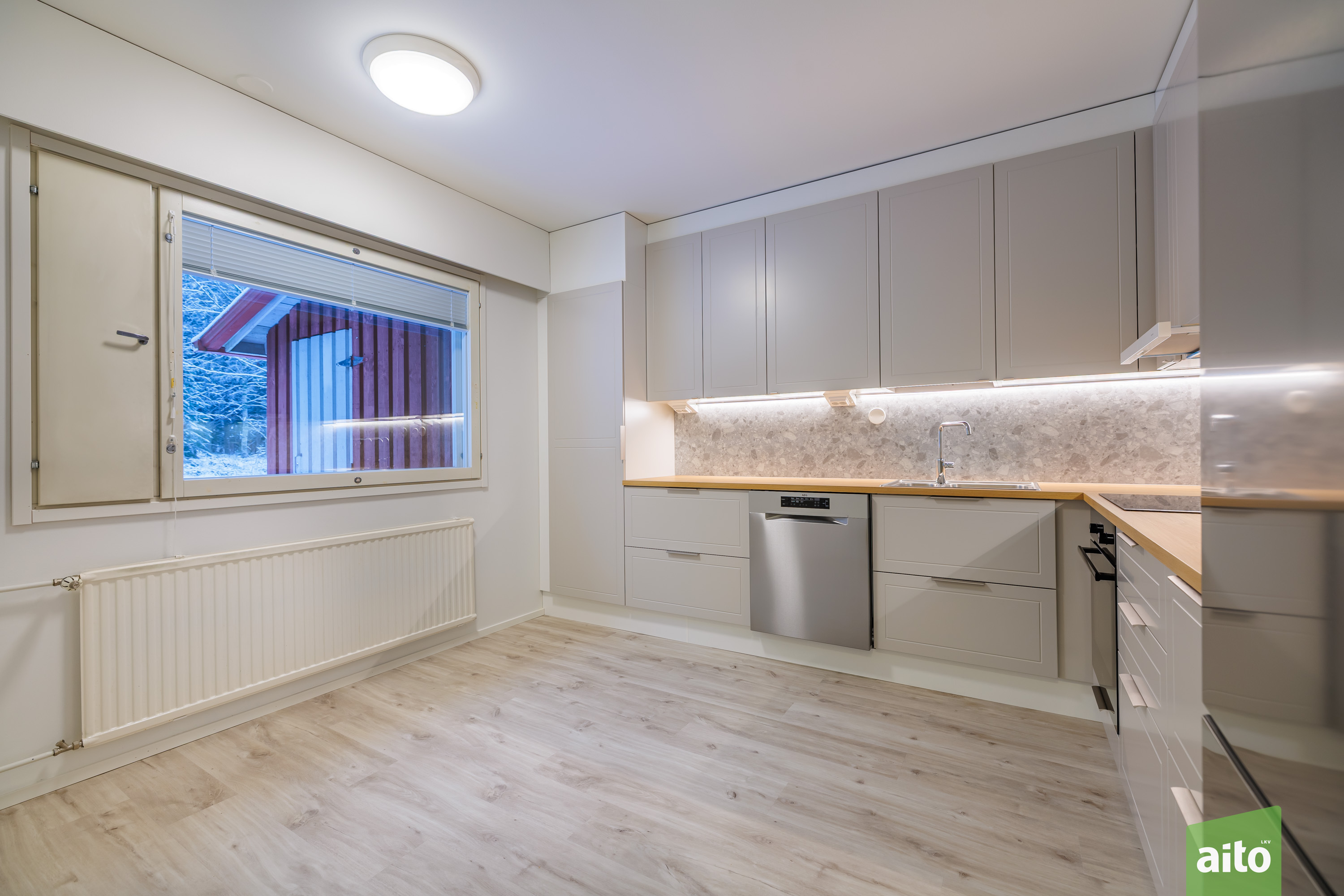 Keittiön kuvaus Varusteet: jääkaappipakastin, astianpesukone, induktioliesi, erillisuuni