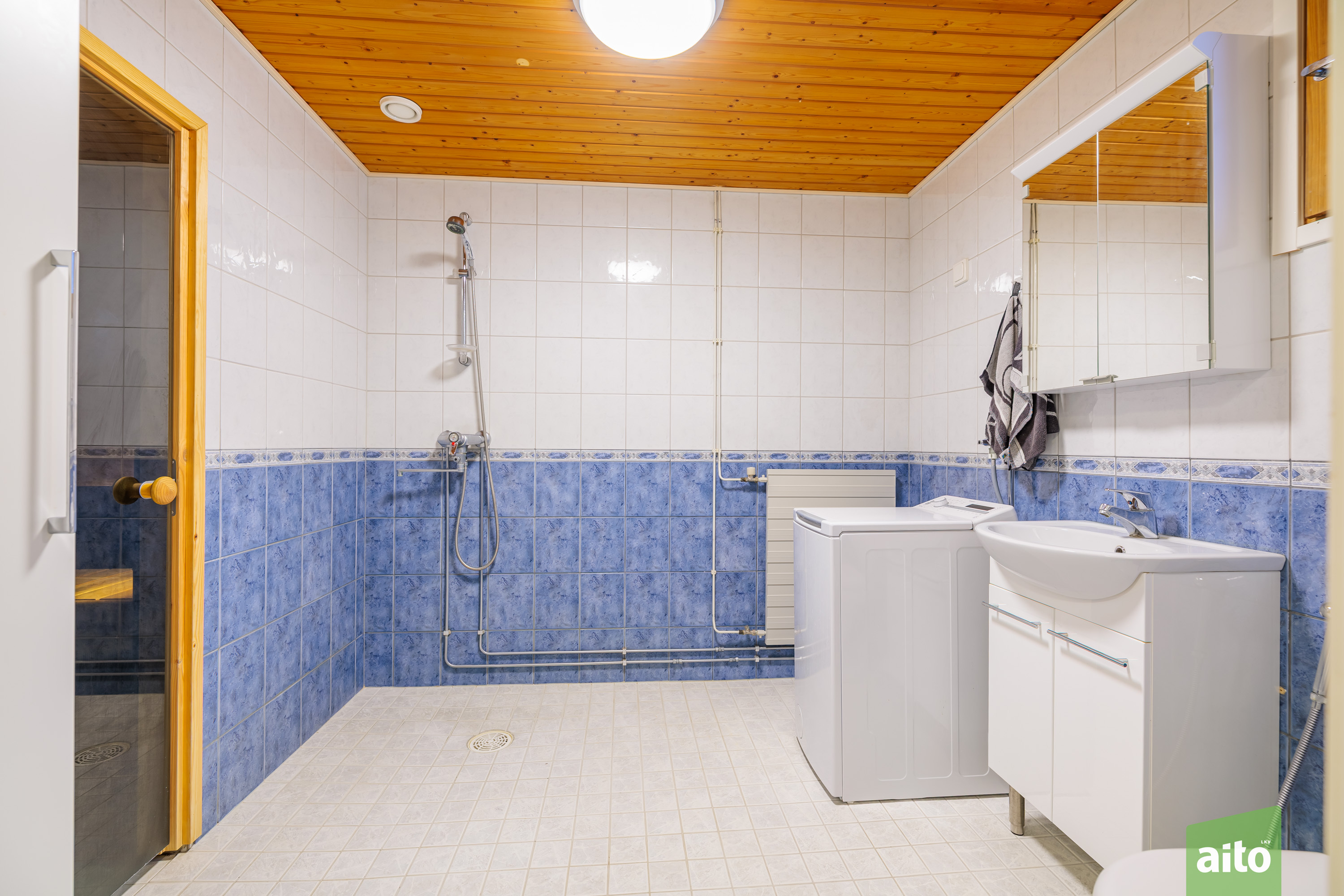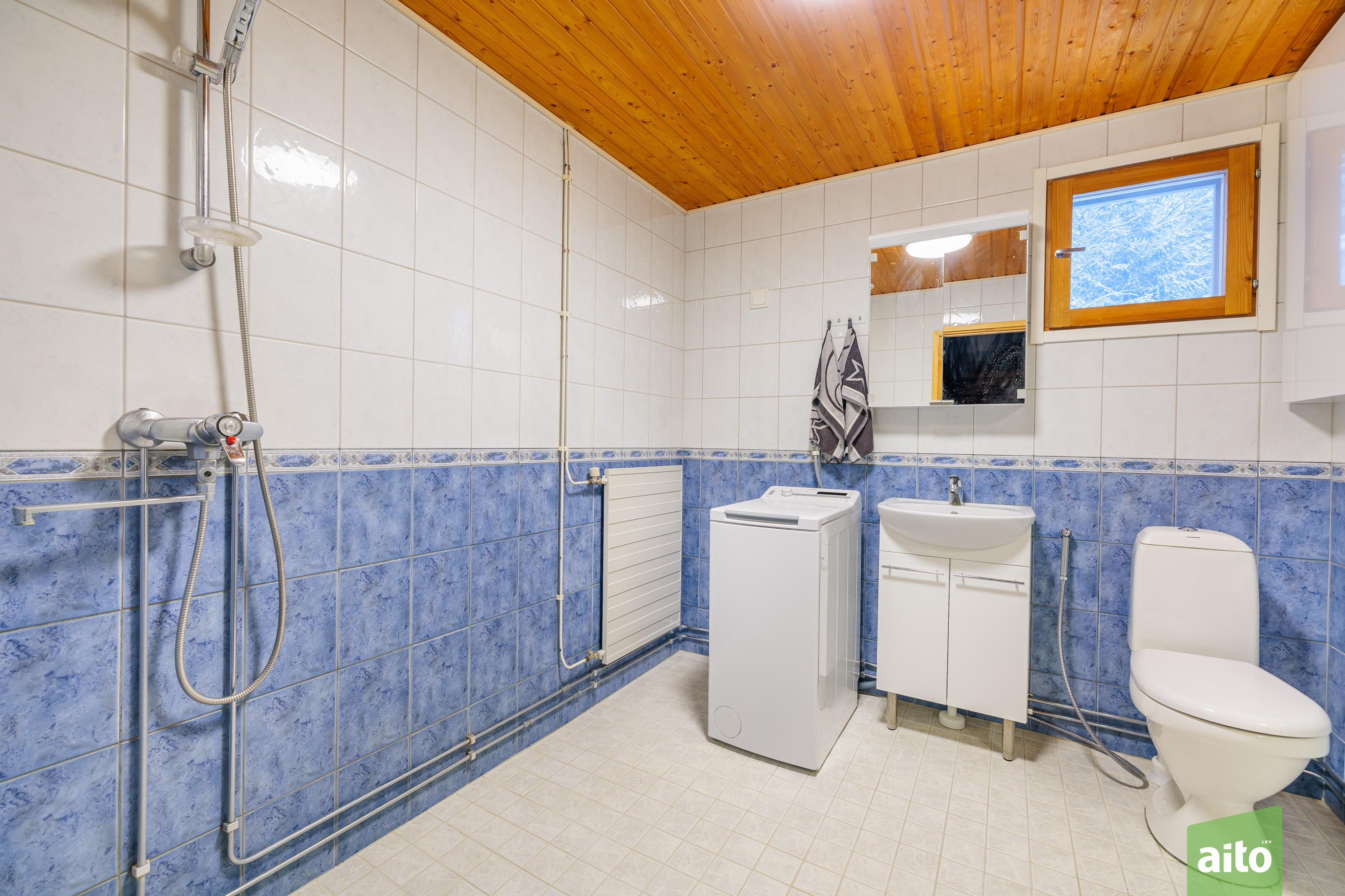 Kylpyhuoneen kuvaus Varusteet: suihku, allaskaappi, peilikaappi, pesukoneliitäntä