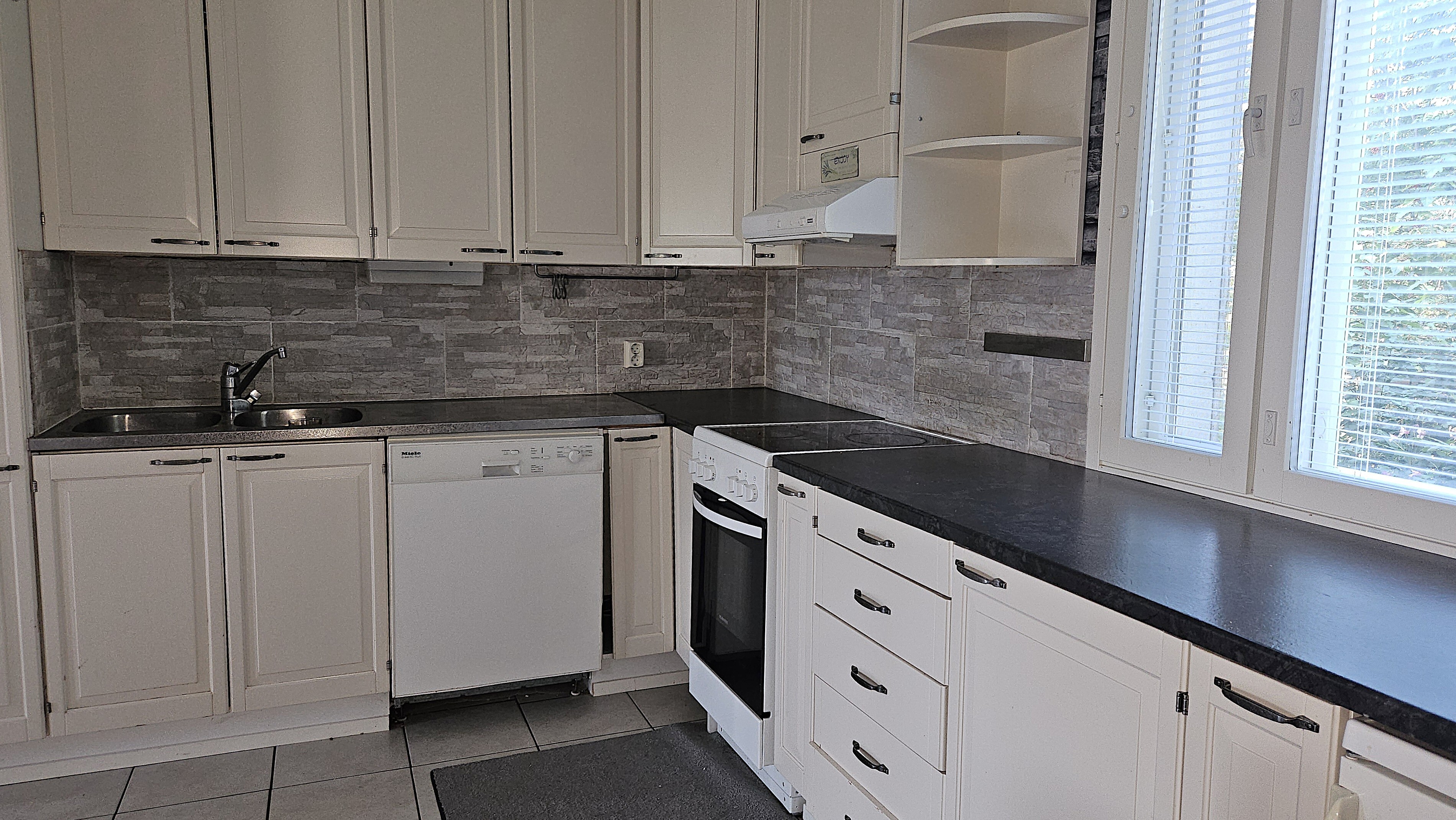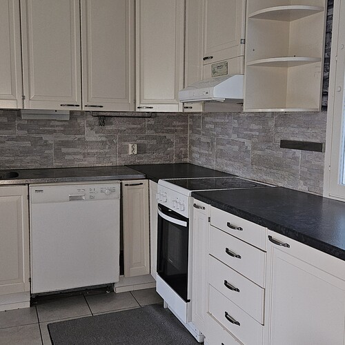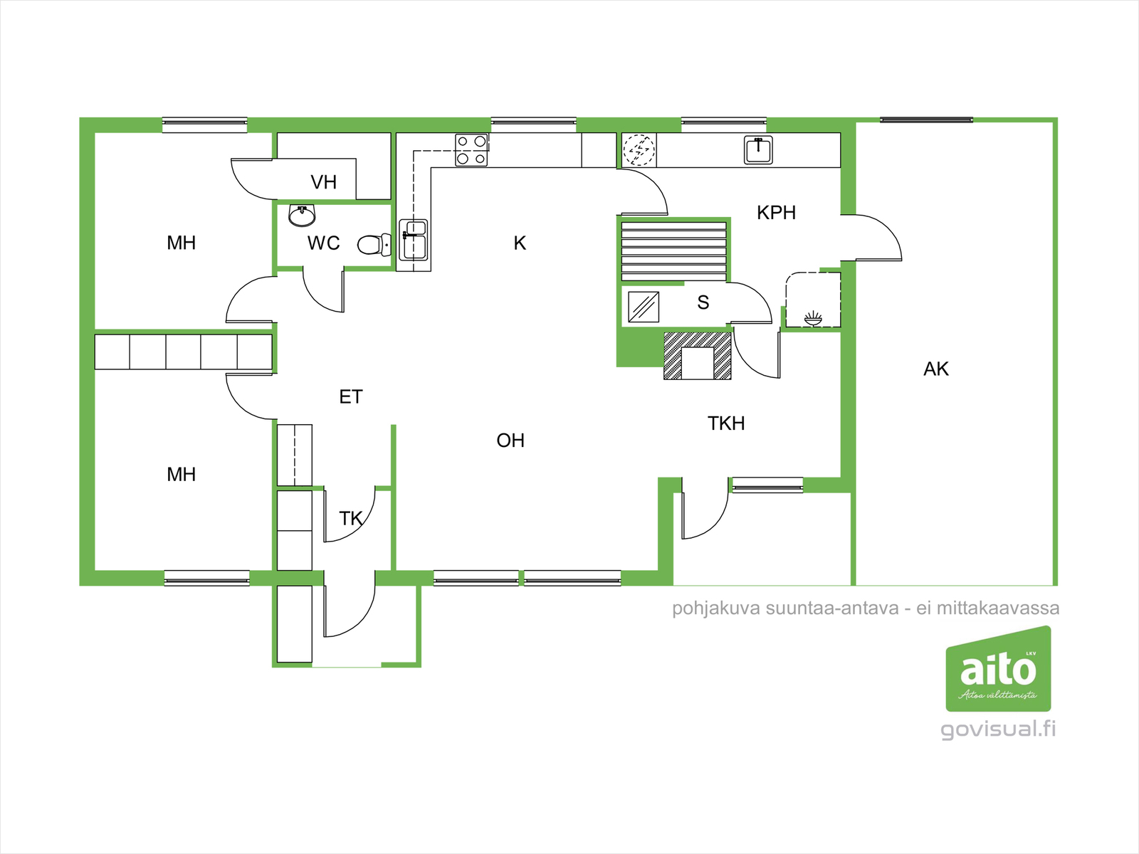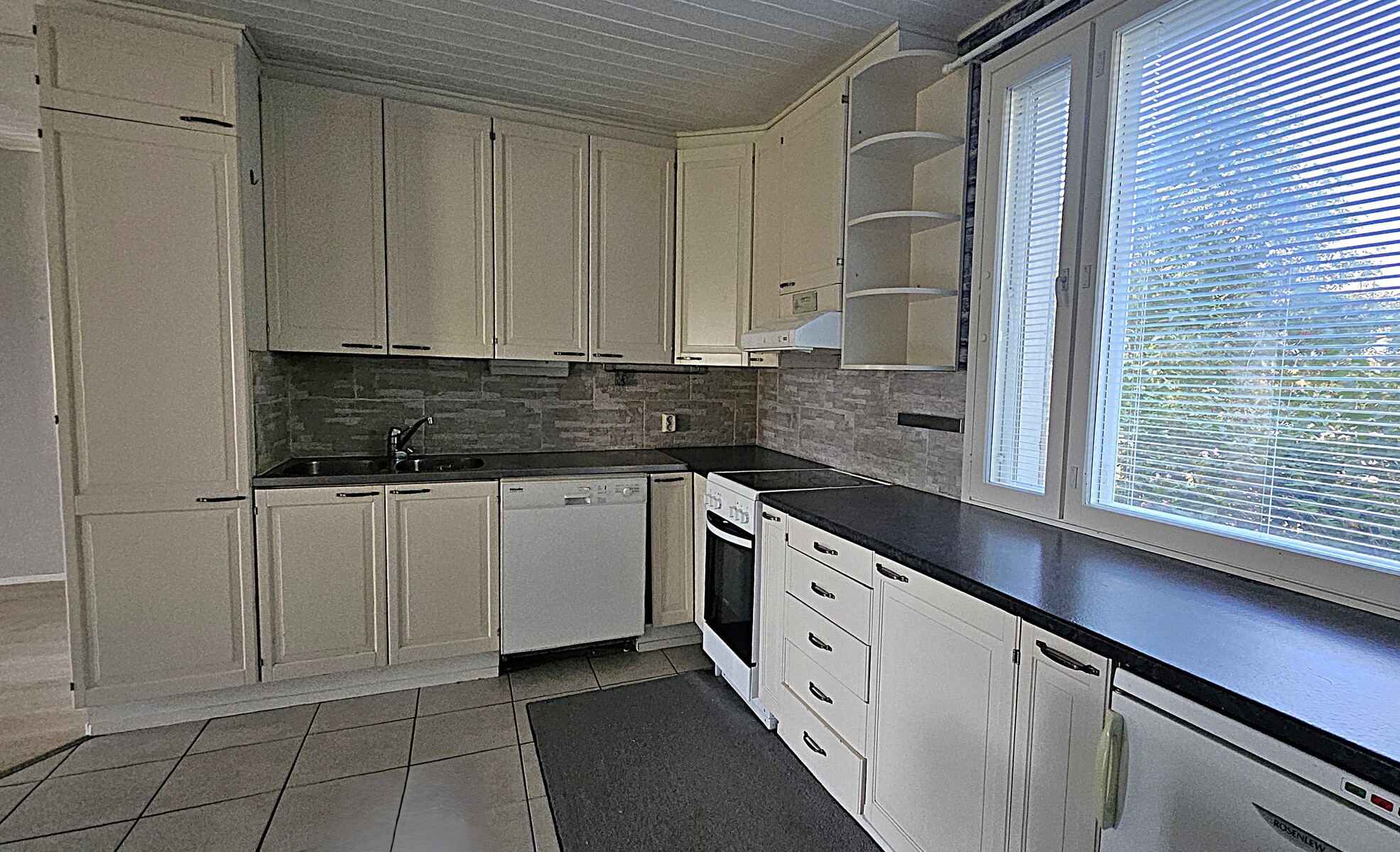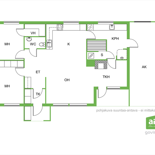 Varusteina jääkaappi, pakastin, astianpesukone, sähköliesi, liesituuletin. Hormissa varaus leivinuunille/puuhellalle.