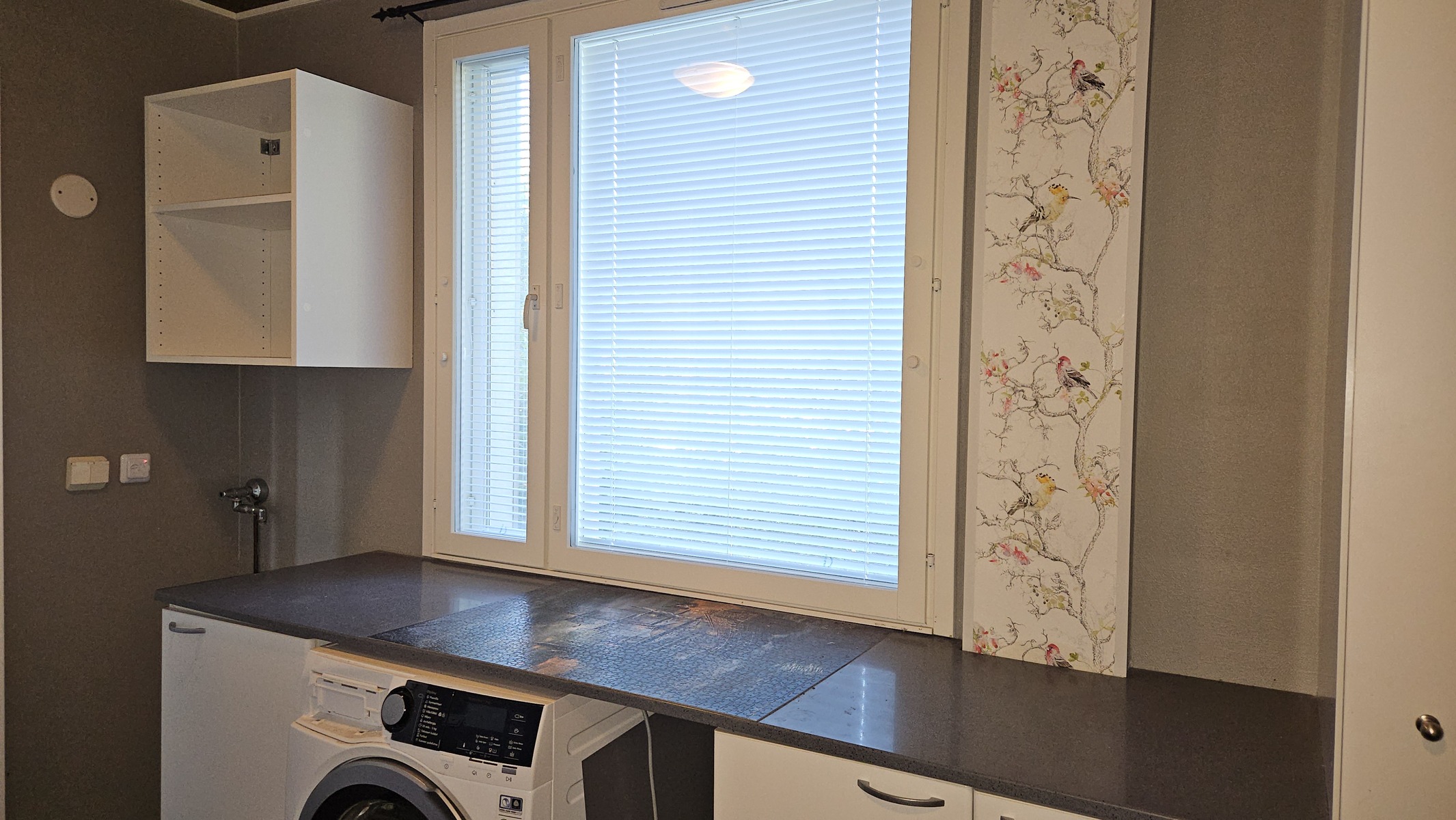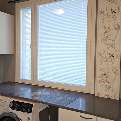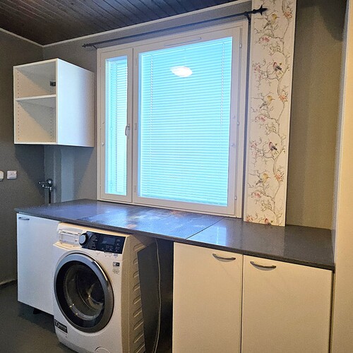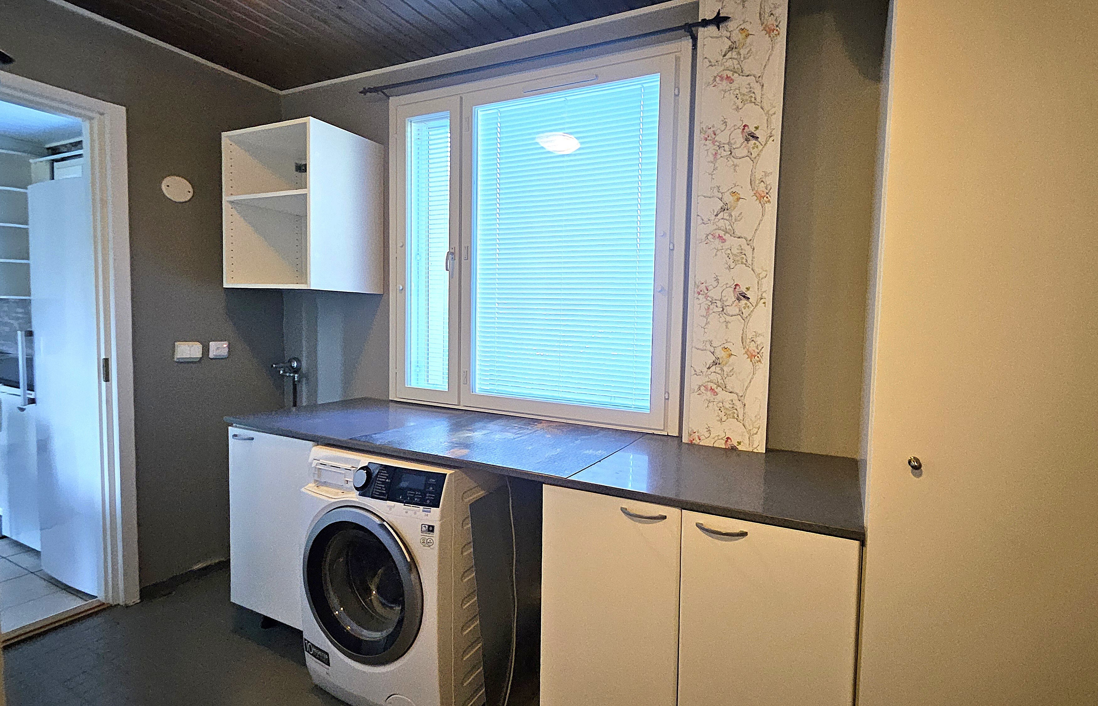 – Kodinhoitotilassa on varaus pyykinpesukoneelle ja kuivausrummulle, taso pyykkien käsittelylle.