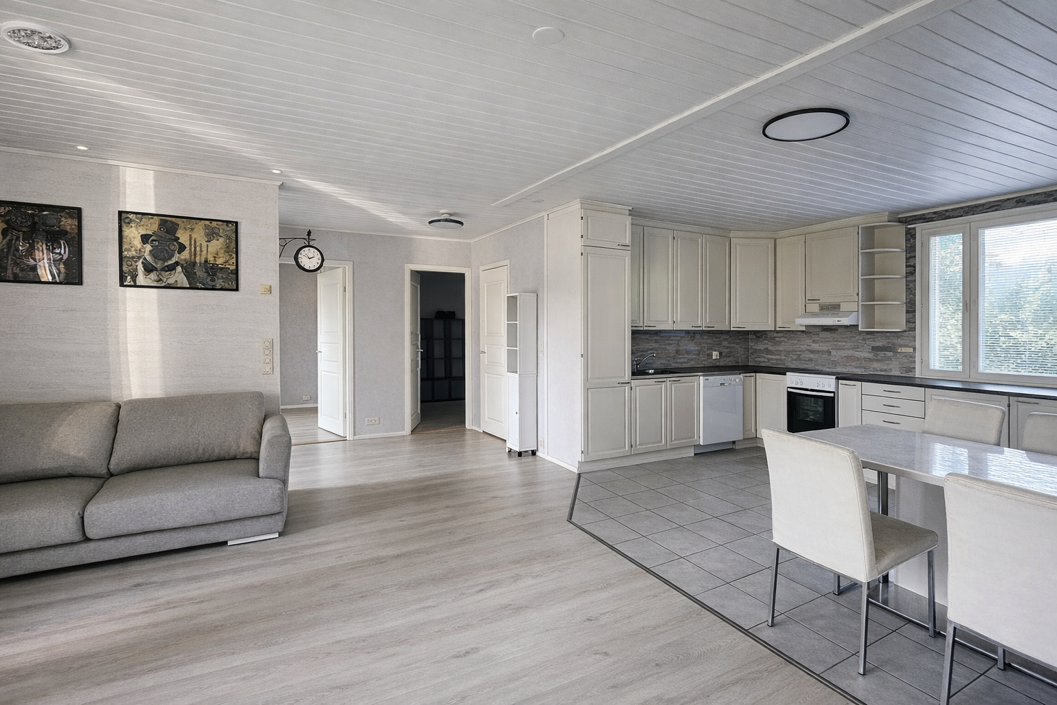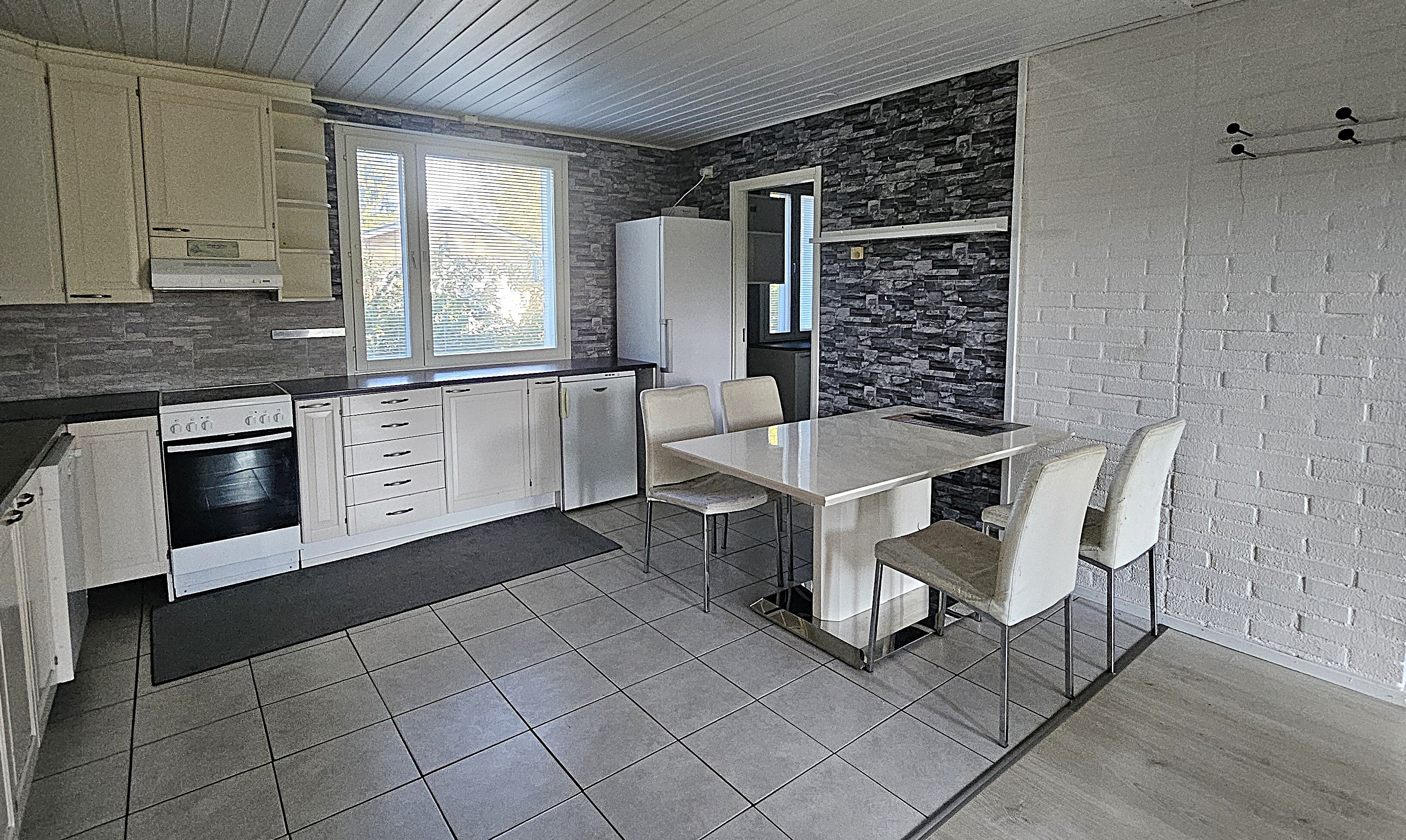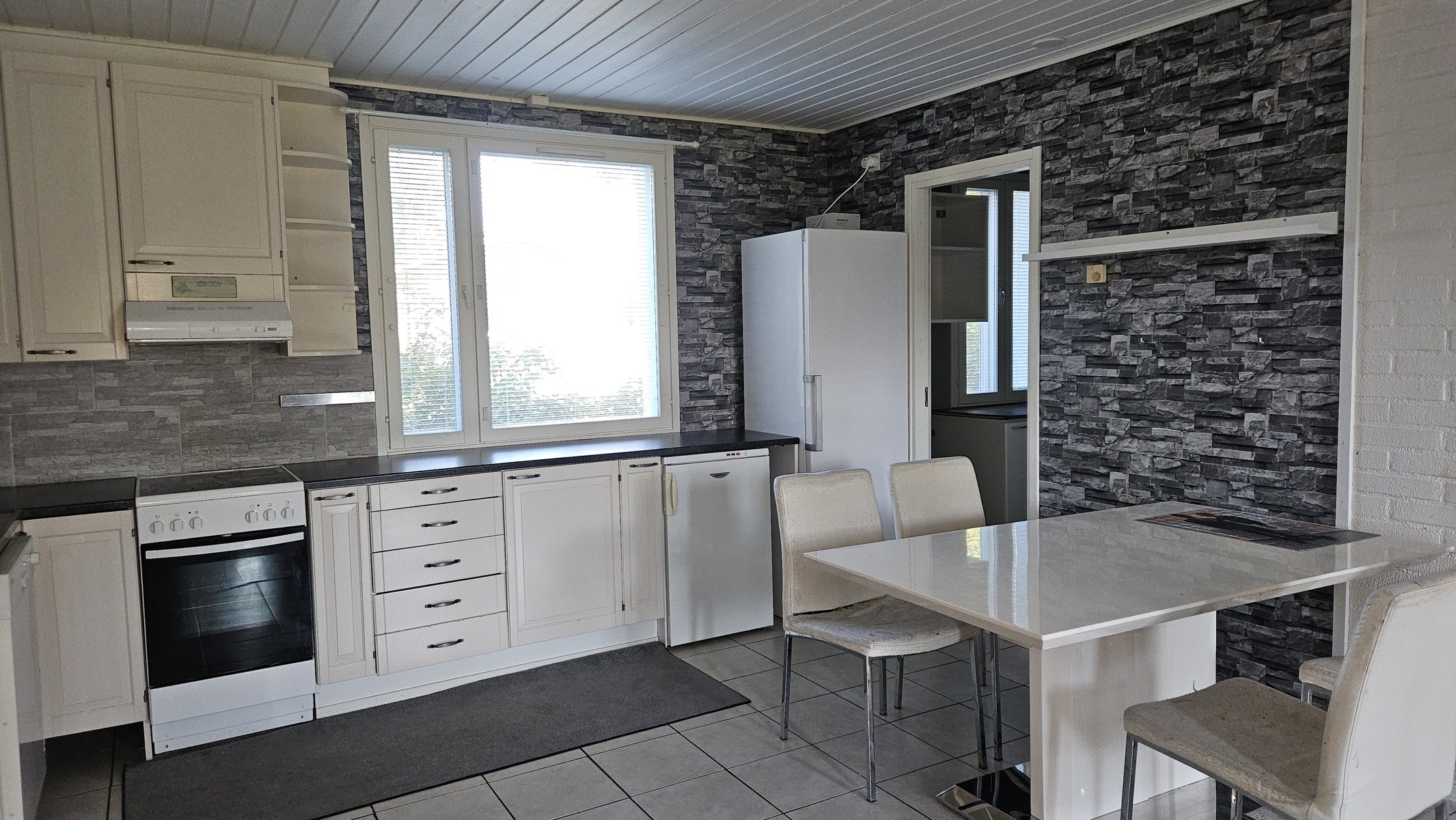 Hyvin kaappi- ja laskutilaa. Tila suurelle ruokapöydälle.