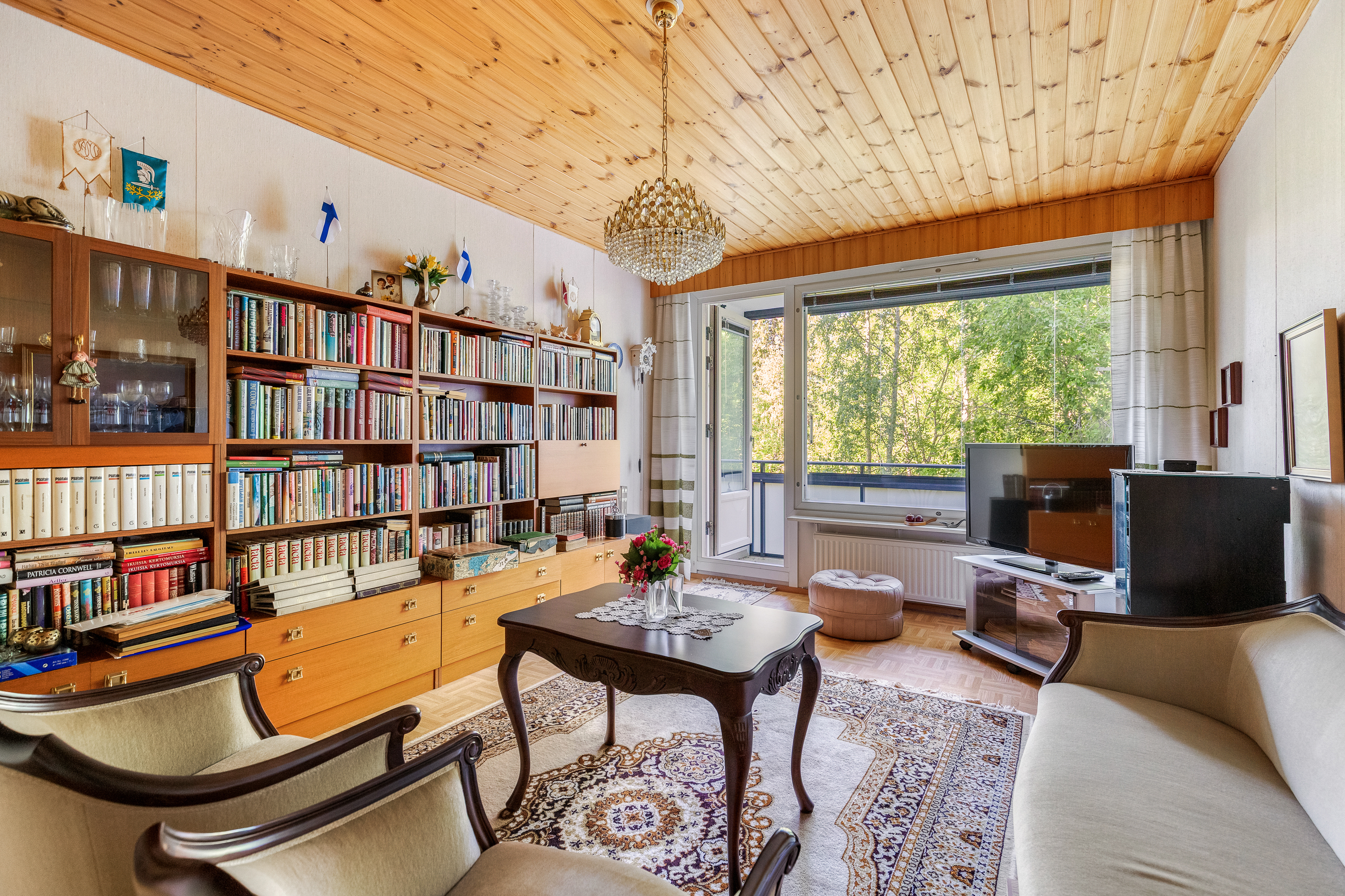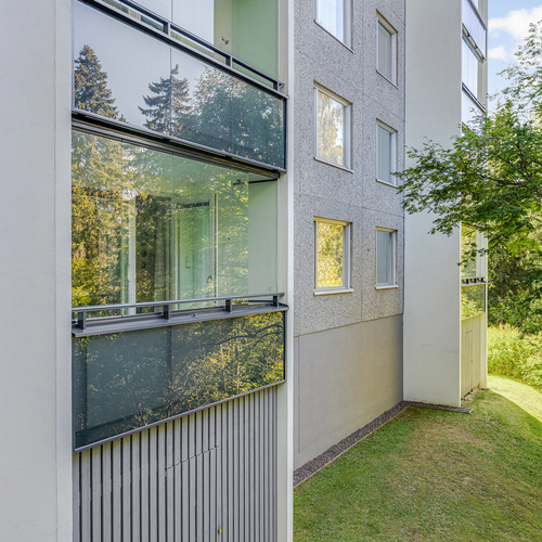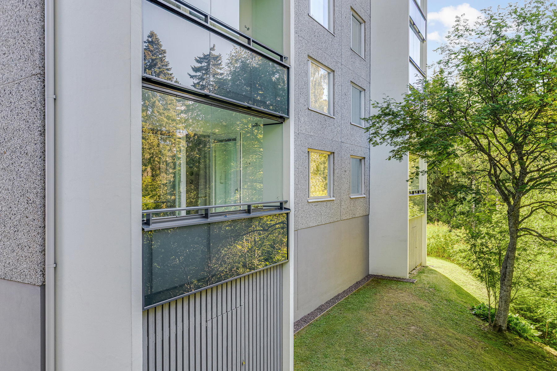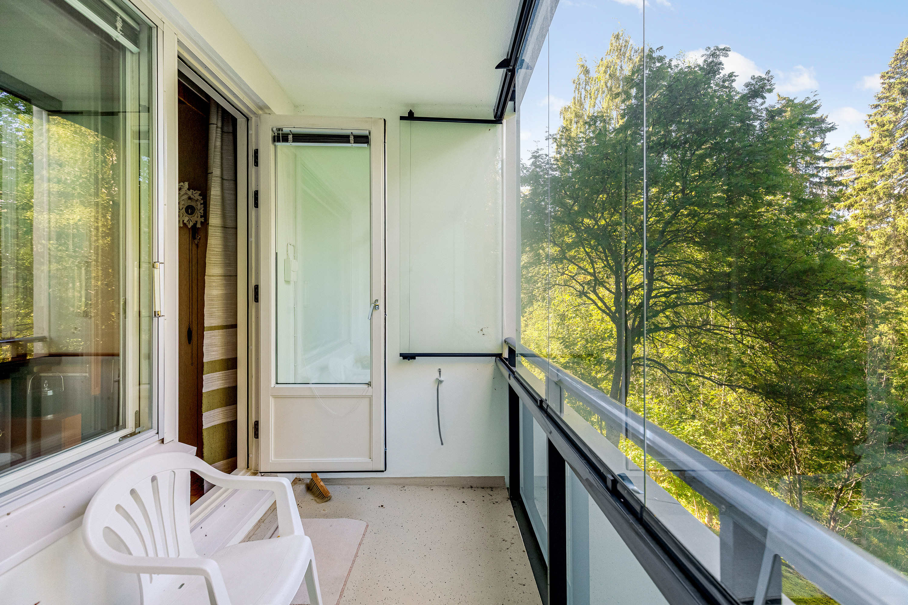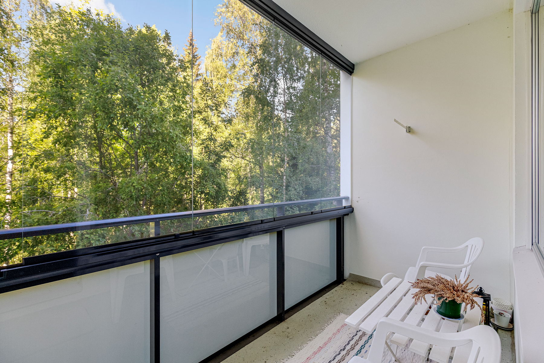 Tämä valoisa asunto tarjoaa selkeät ja tilavat huoneet, jotka luovat avaran ja viihtyisän tunnelman. Asunnon ikkunoista sekä parvekkeelta avautuvat kauniit, metsäiset maisemat, jotka tuovat luonnon lähelle arkea.