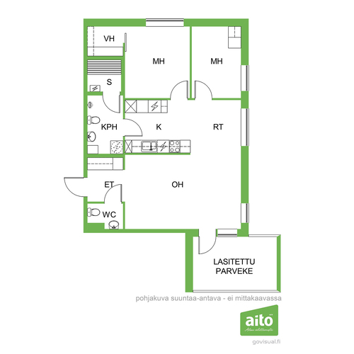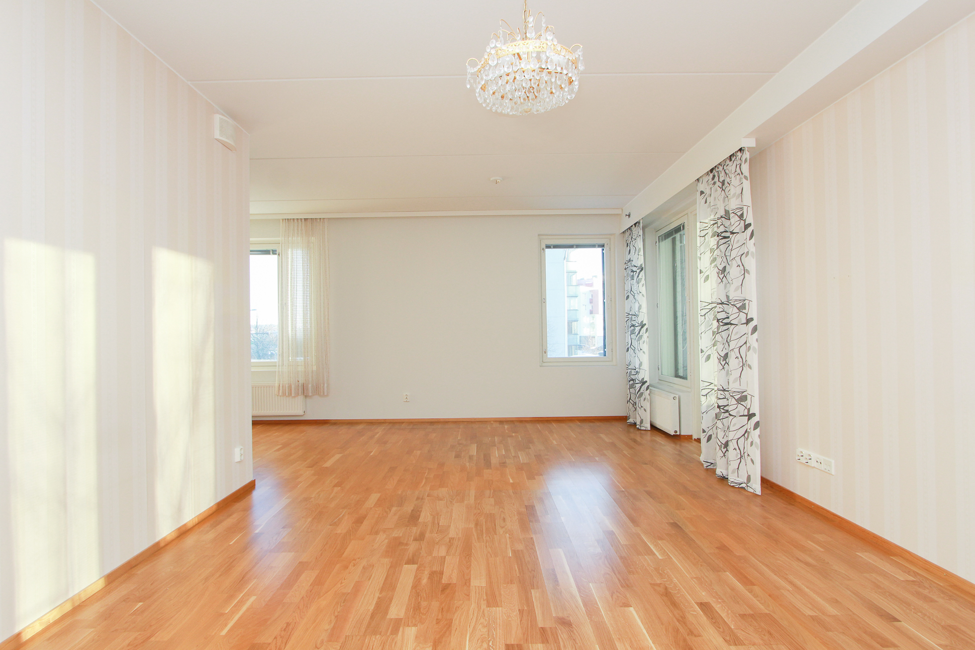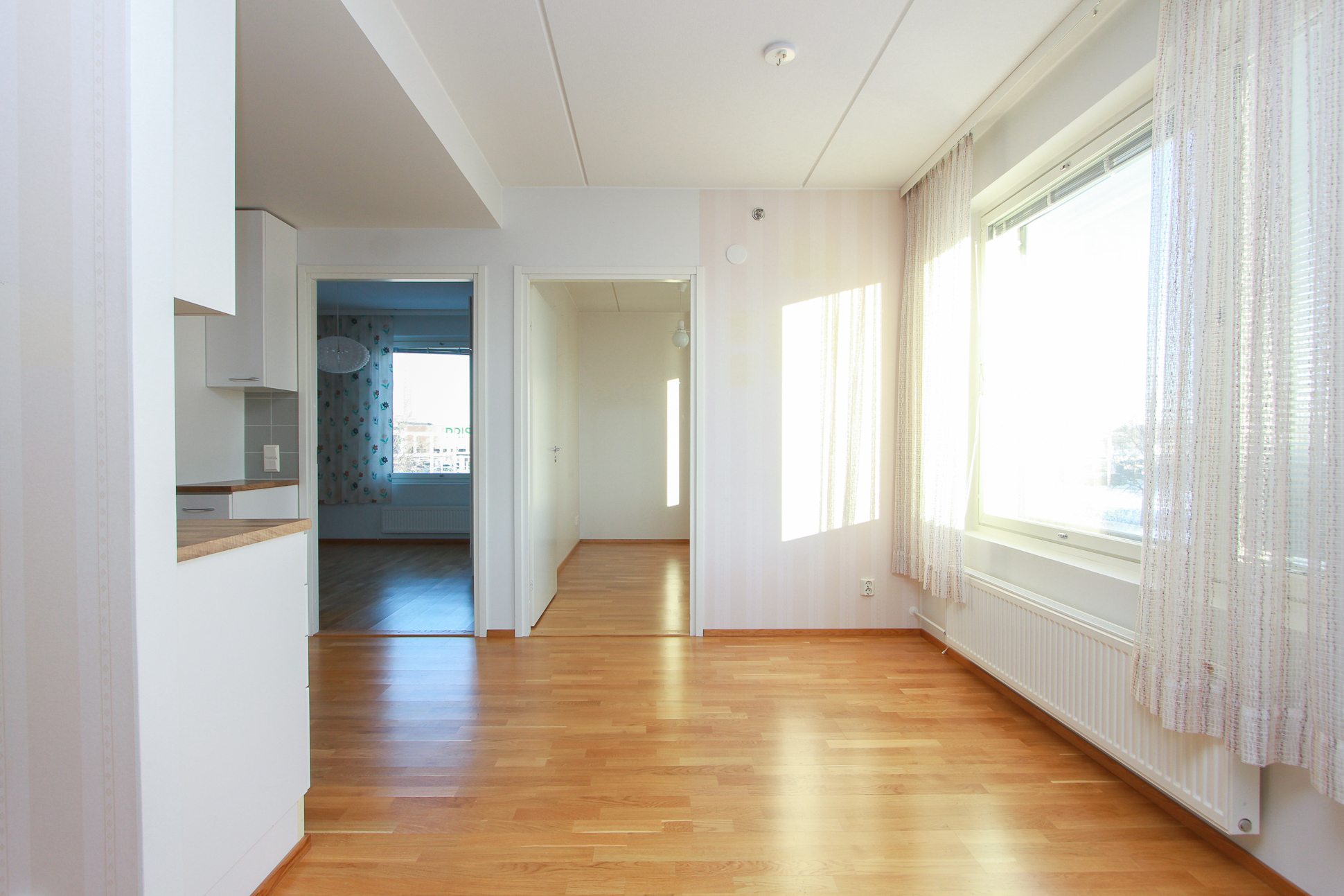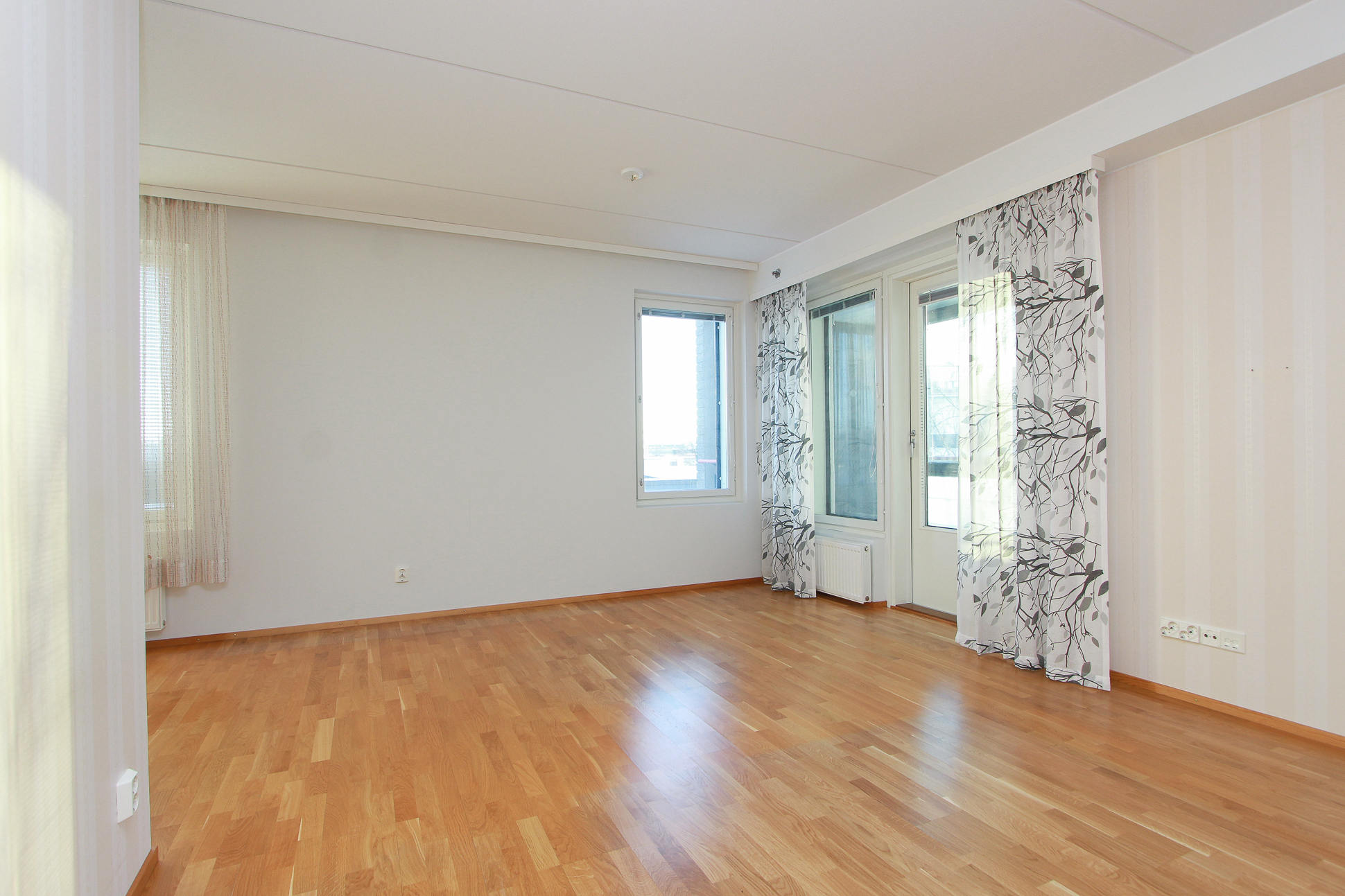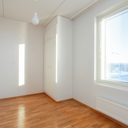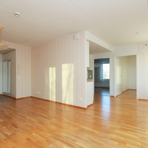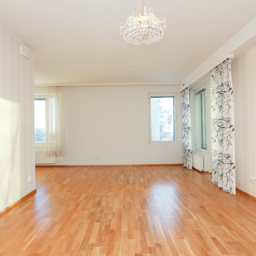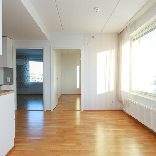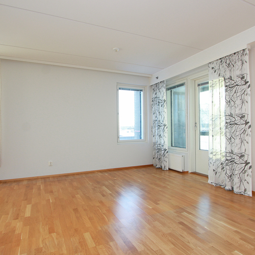 Asunnossa on avara olohuone, johon suuret ikkunat tuovat runsaasti luonnonvaloa. Lasitettu parveke avautuu kahteen suuntaan.