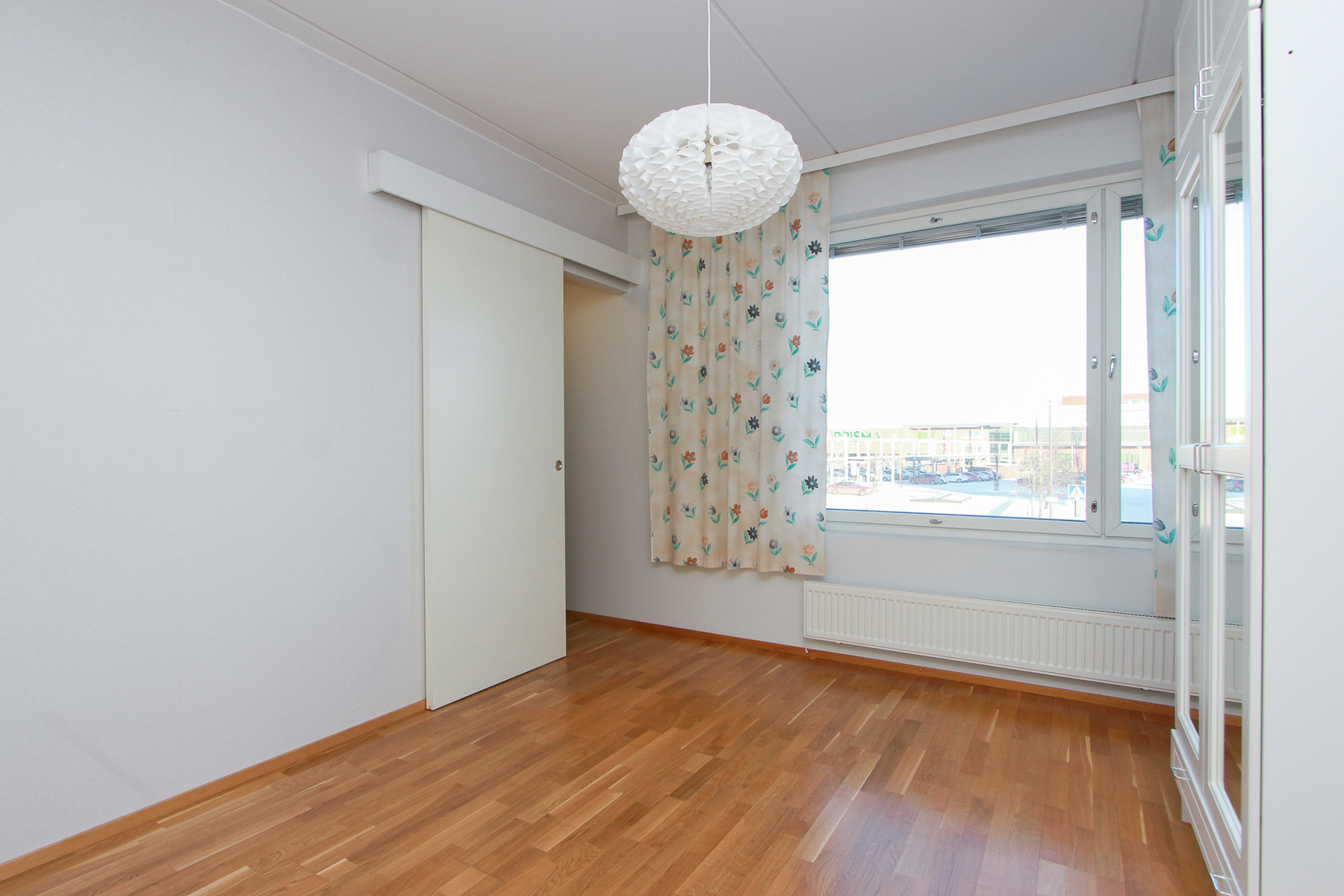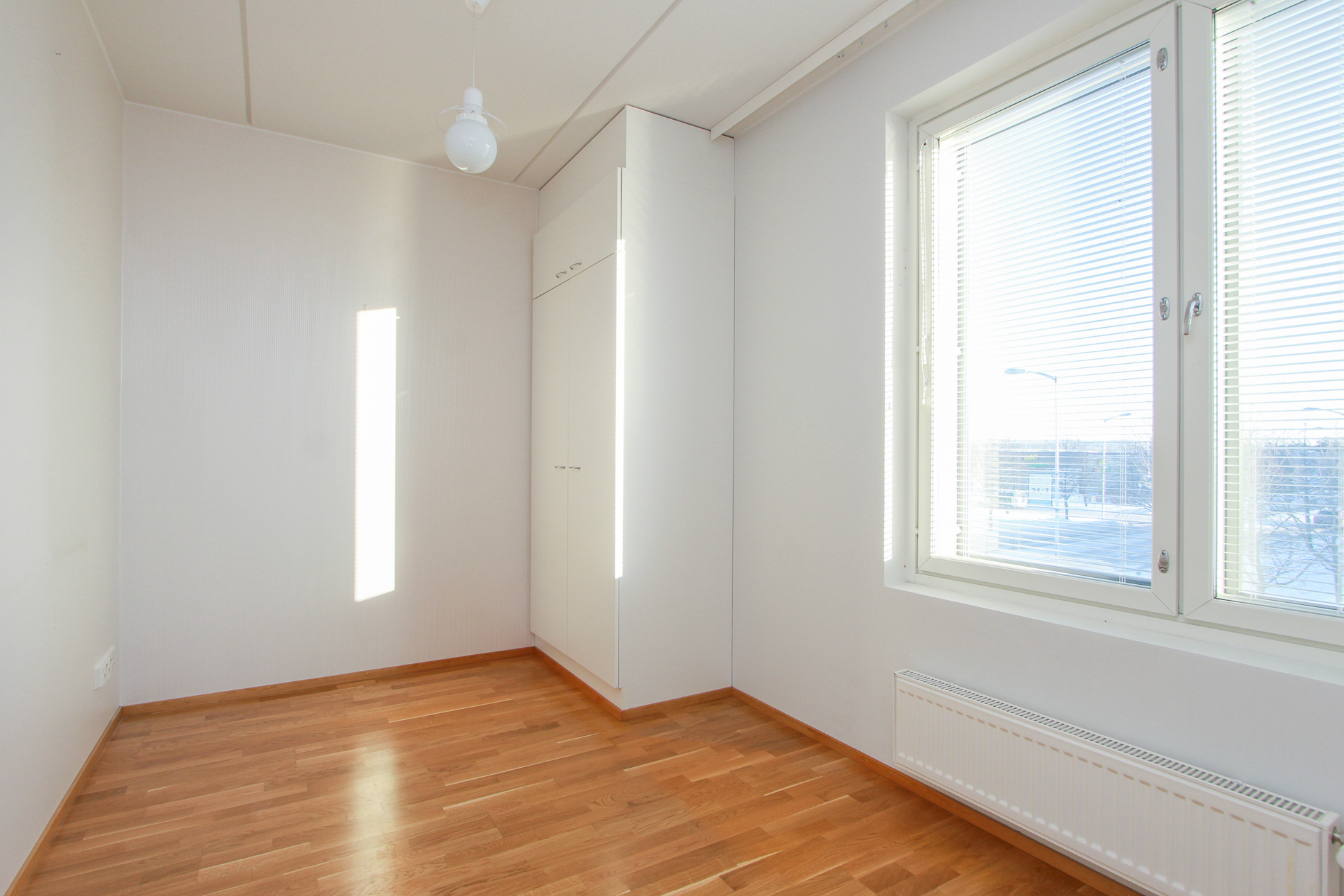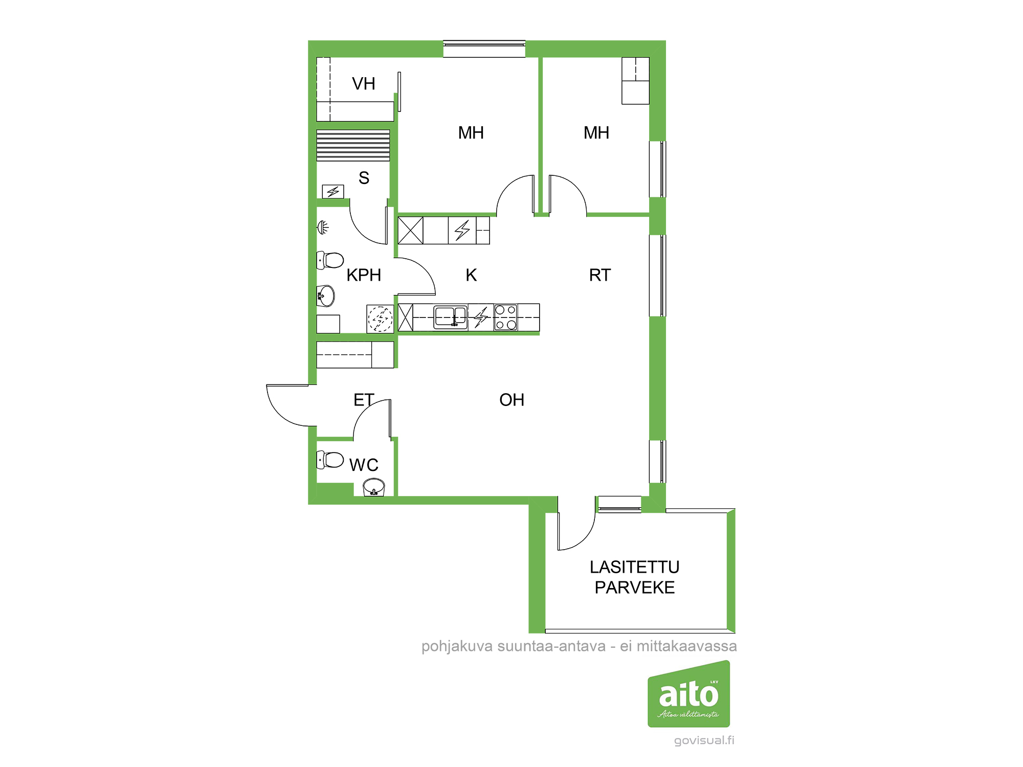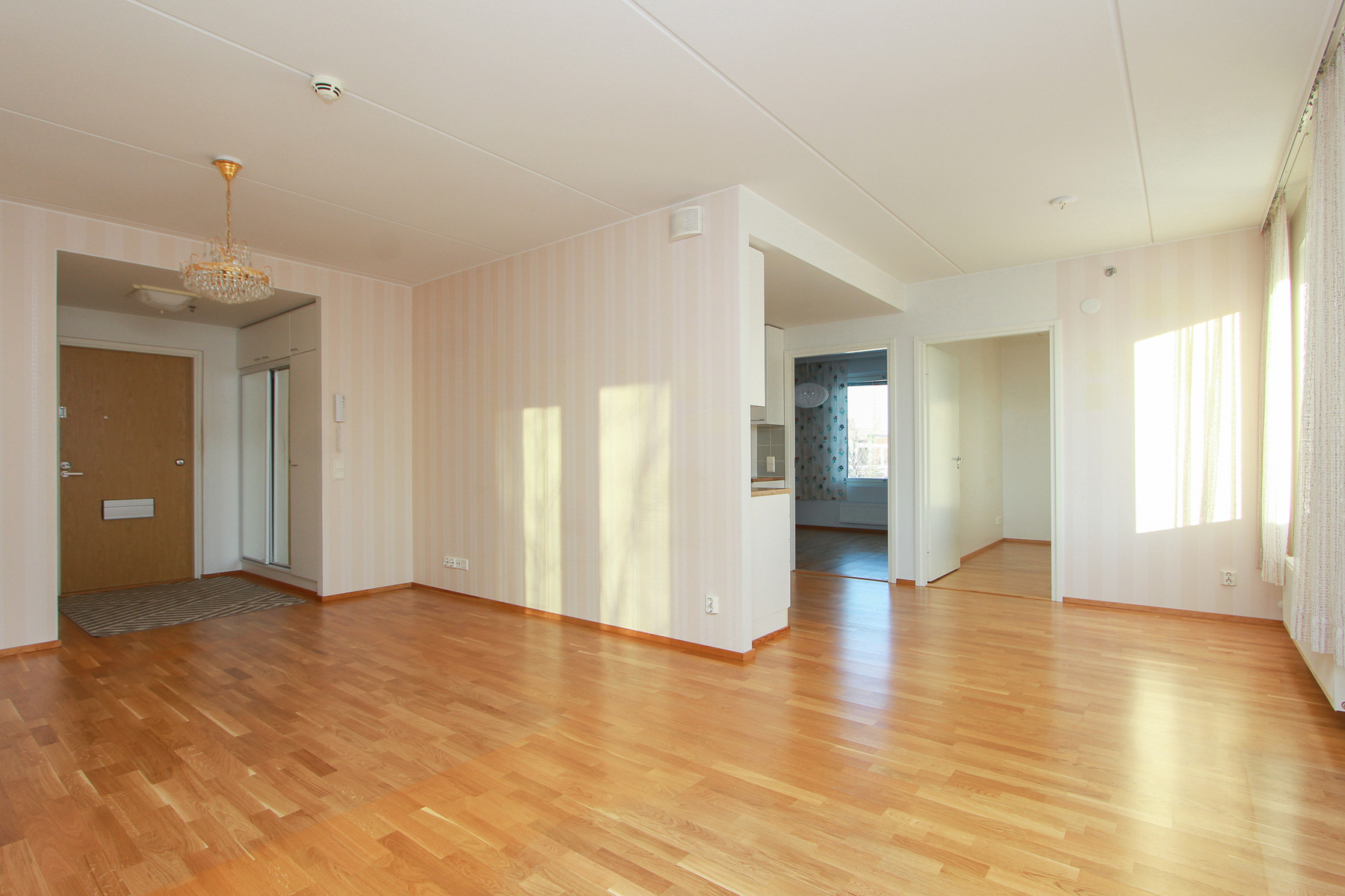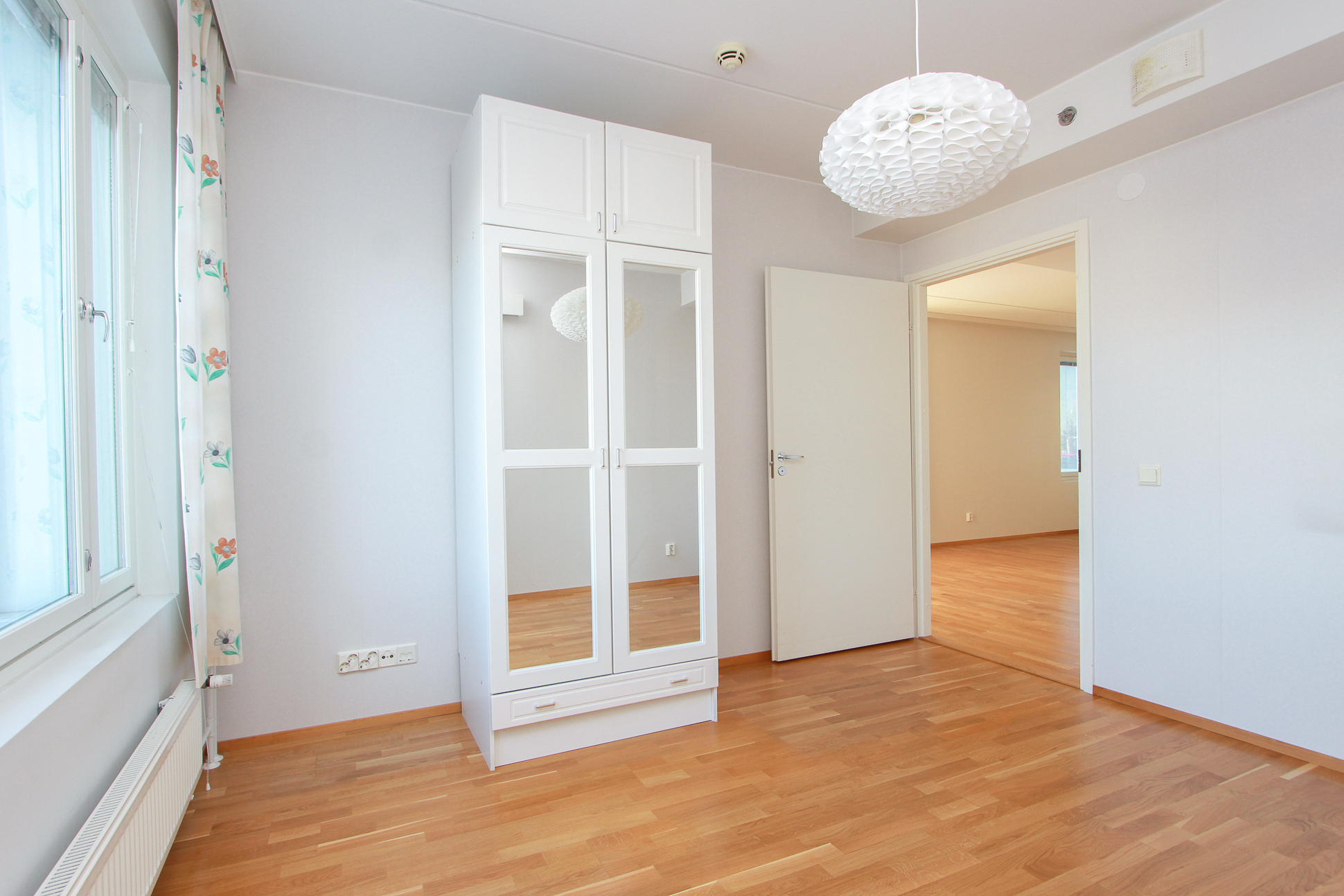Asunnossa on avara olohuone, johon suuret ikkunat tuovat runsaasti luonnonvaloa. Lasitettu parveke avautuu kahteen suuntaan.