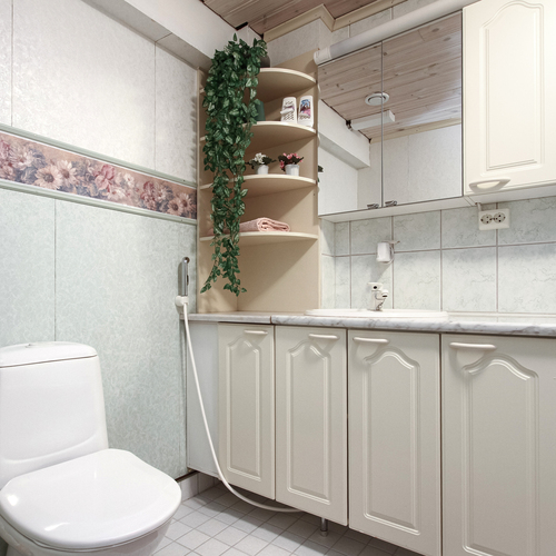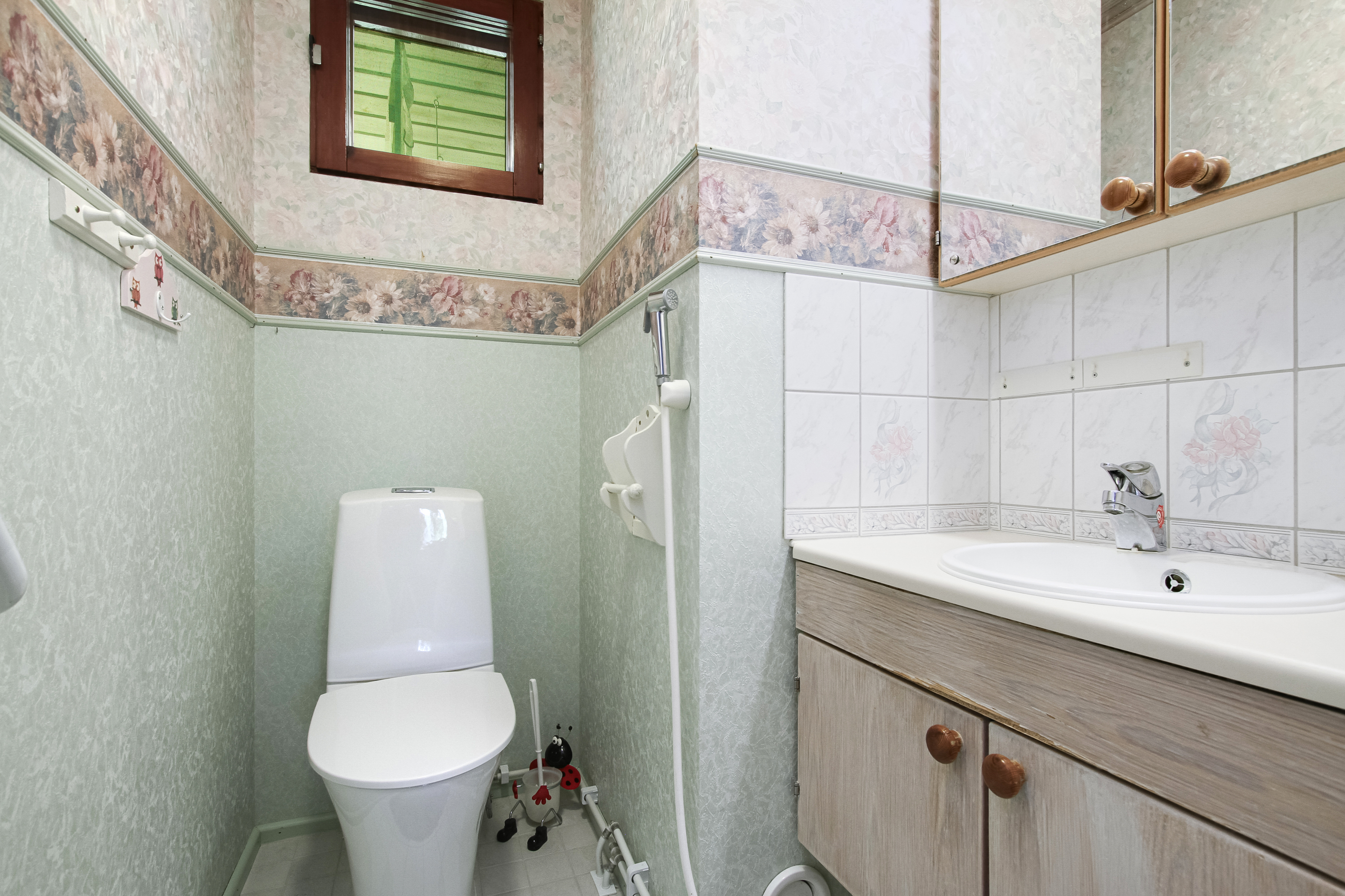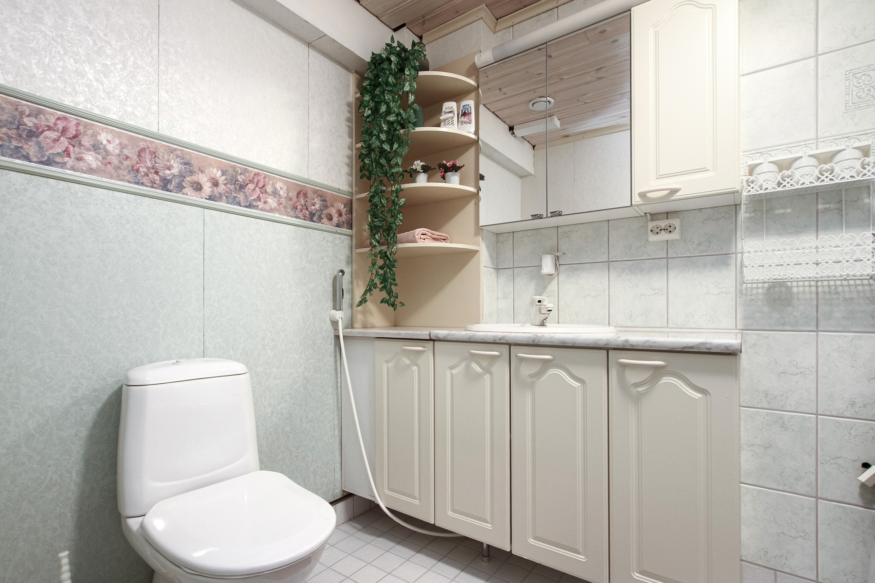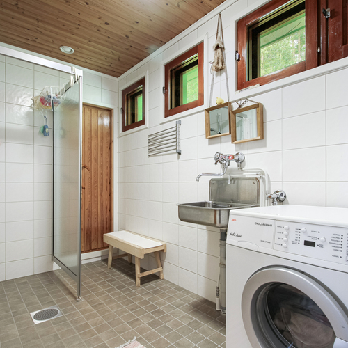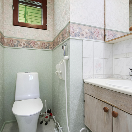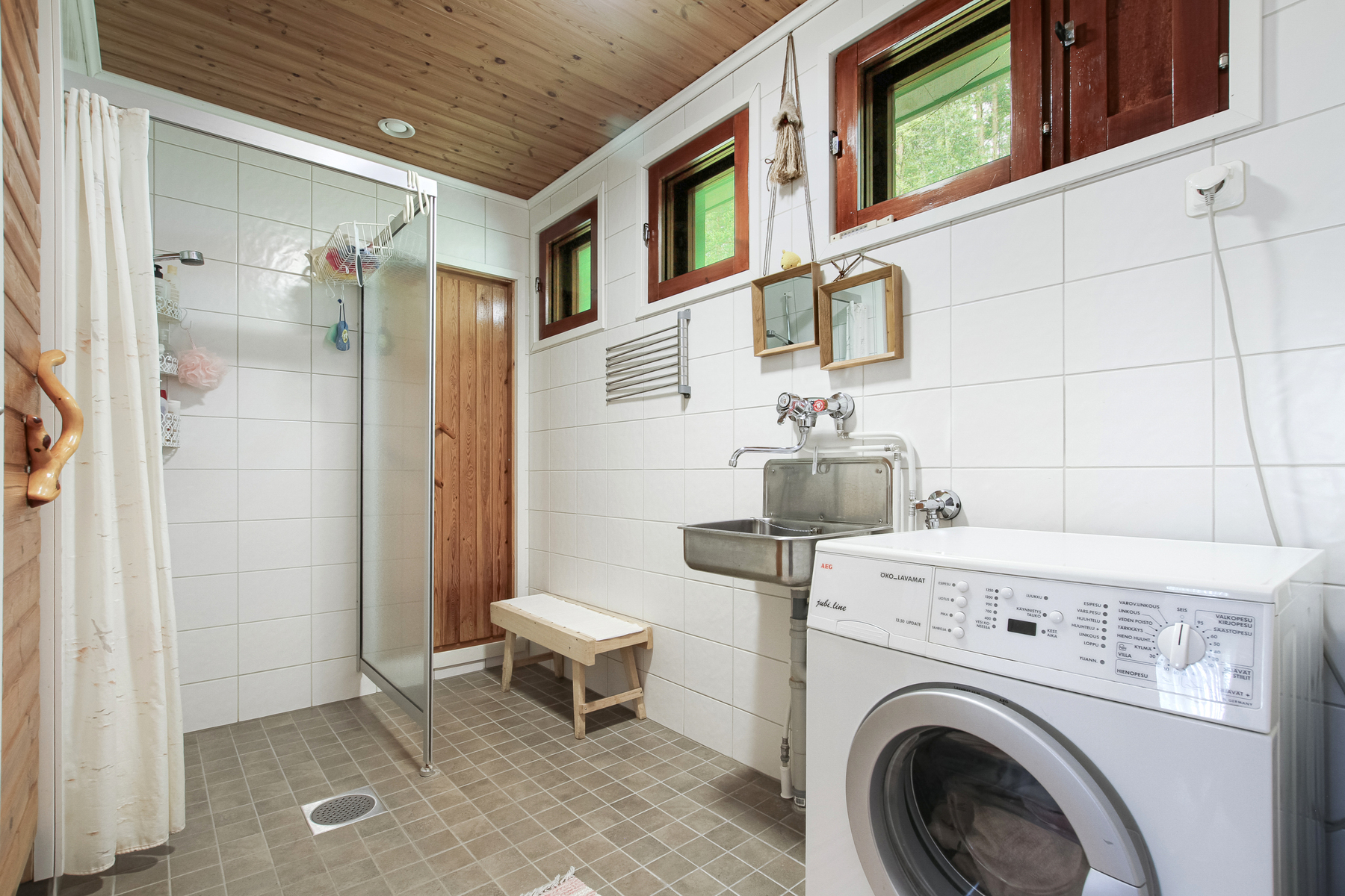Varusteet: pesukoneliitäntä, suihkuseinä, allaskaappi, peilikaappi, lattialämmitys