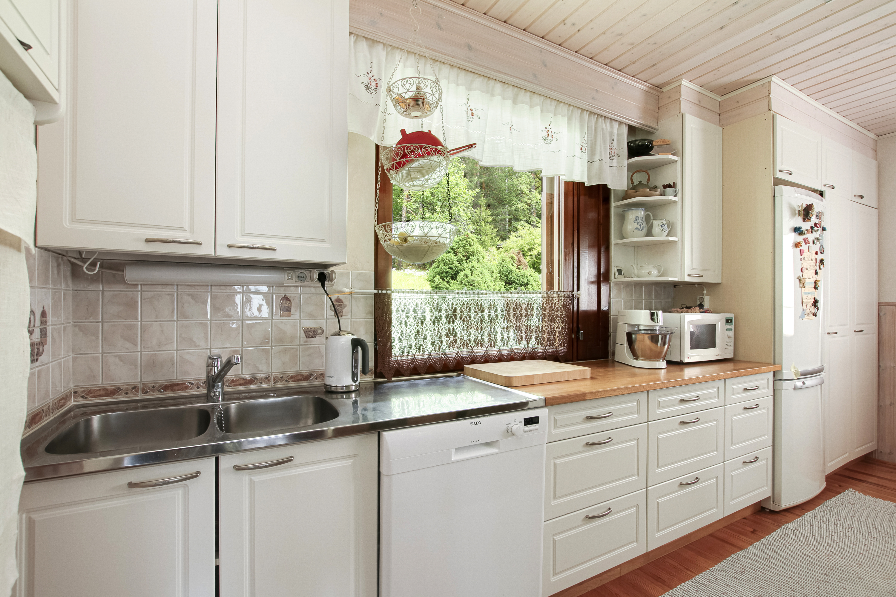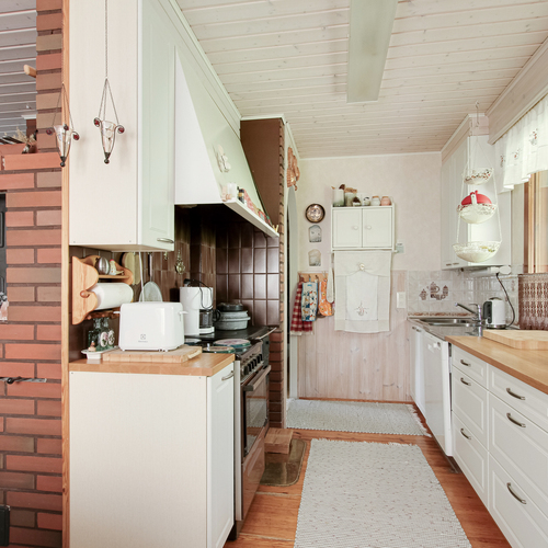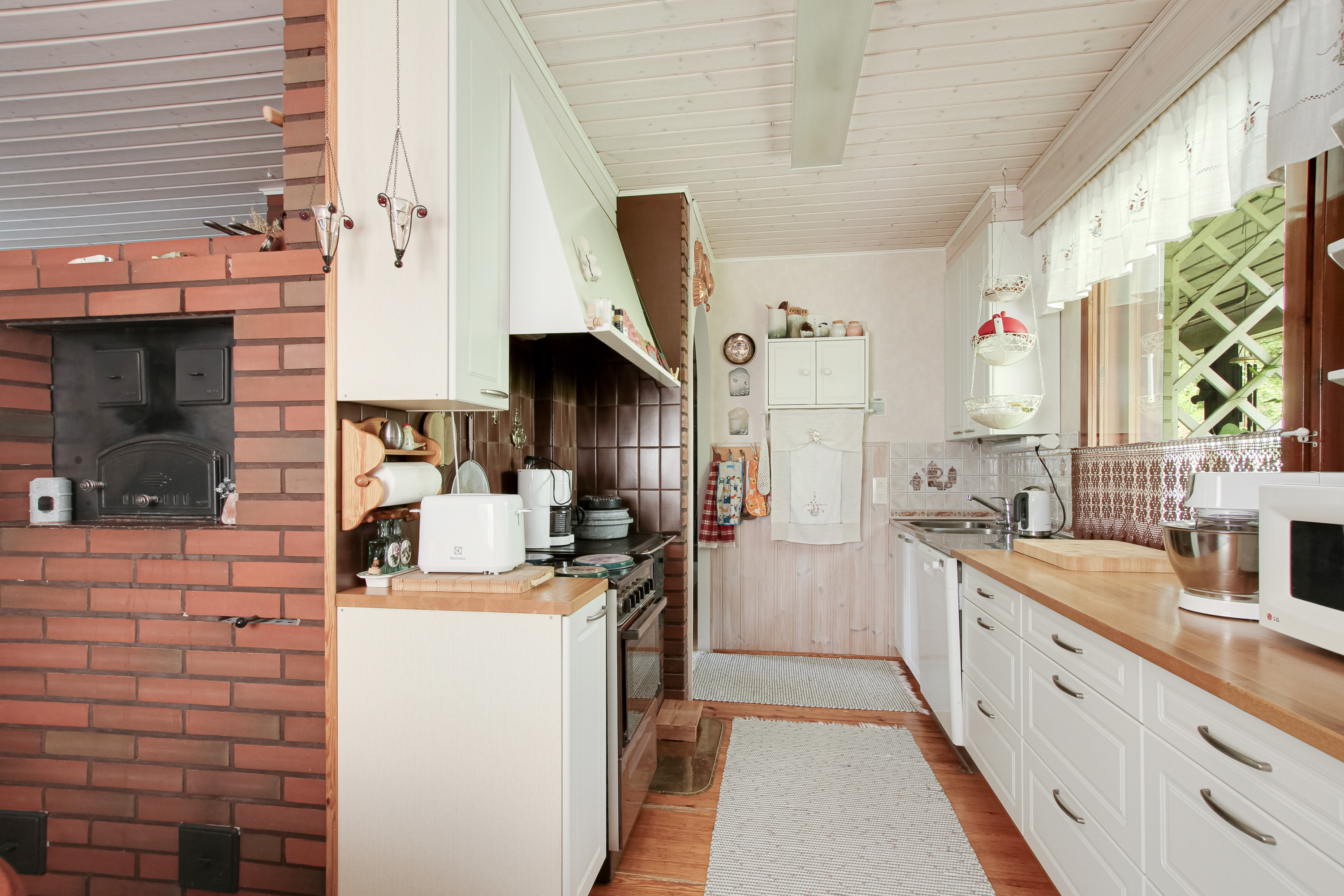 Varusteet: jääkaappipakastin, astianpesukone, astianpesukoneliitäntä, sähköliesi, leivinuuni, puuhella