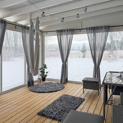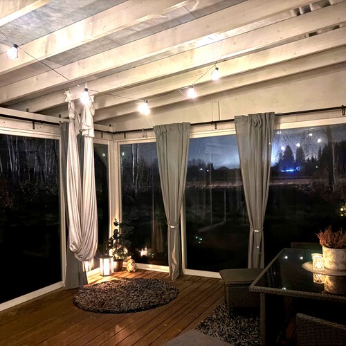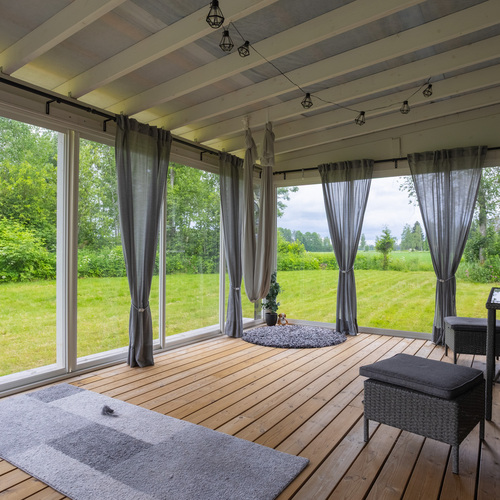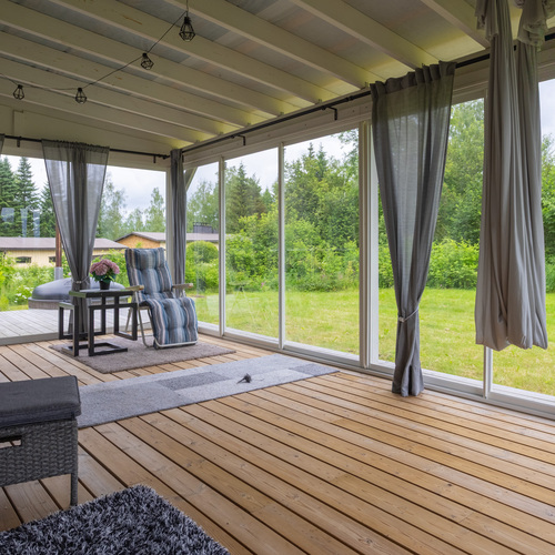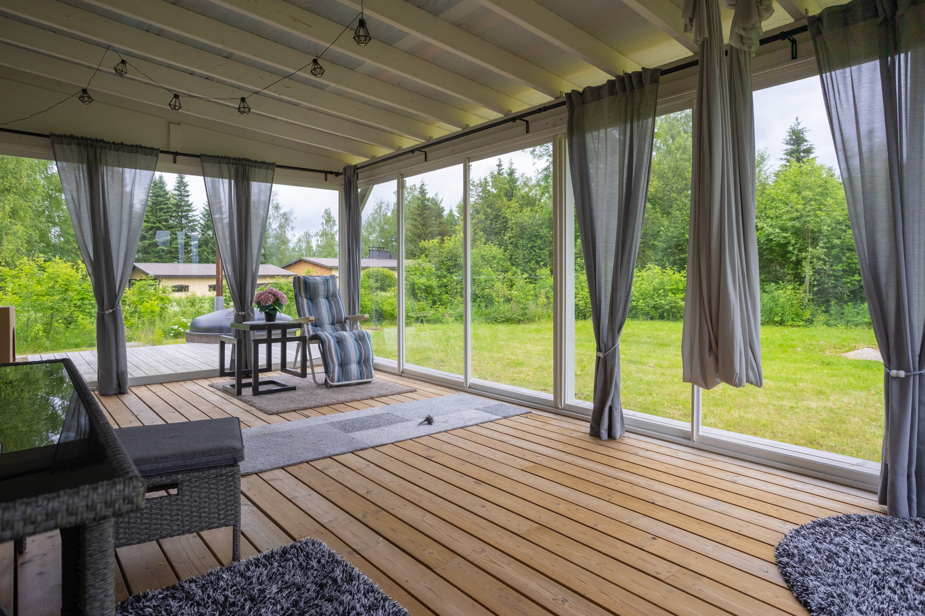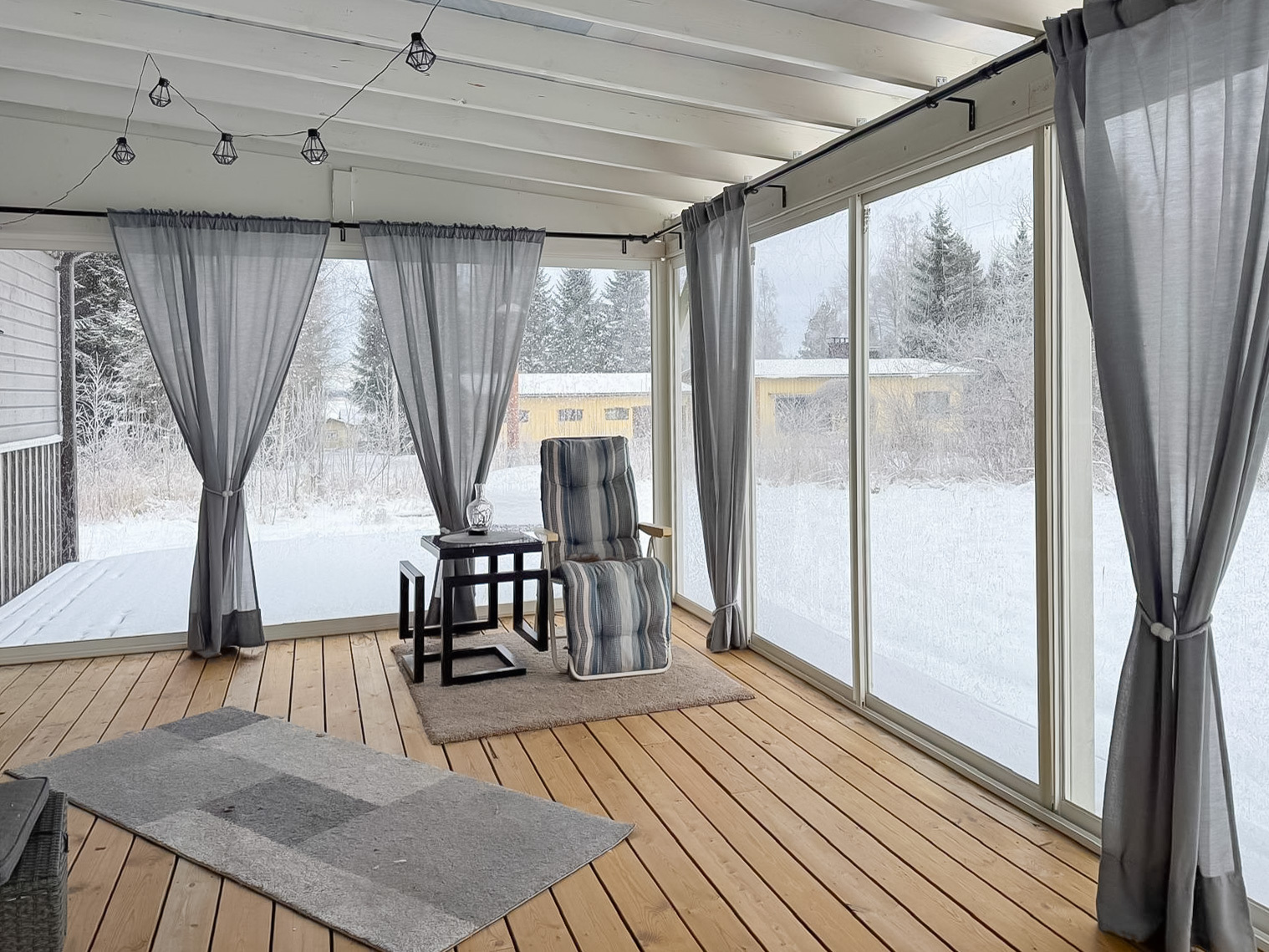 Tilava lasitettu terassi, lisäksi avoterassi, jolla lämmitettävä palju.