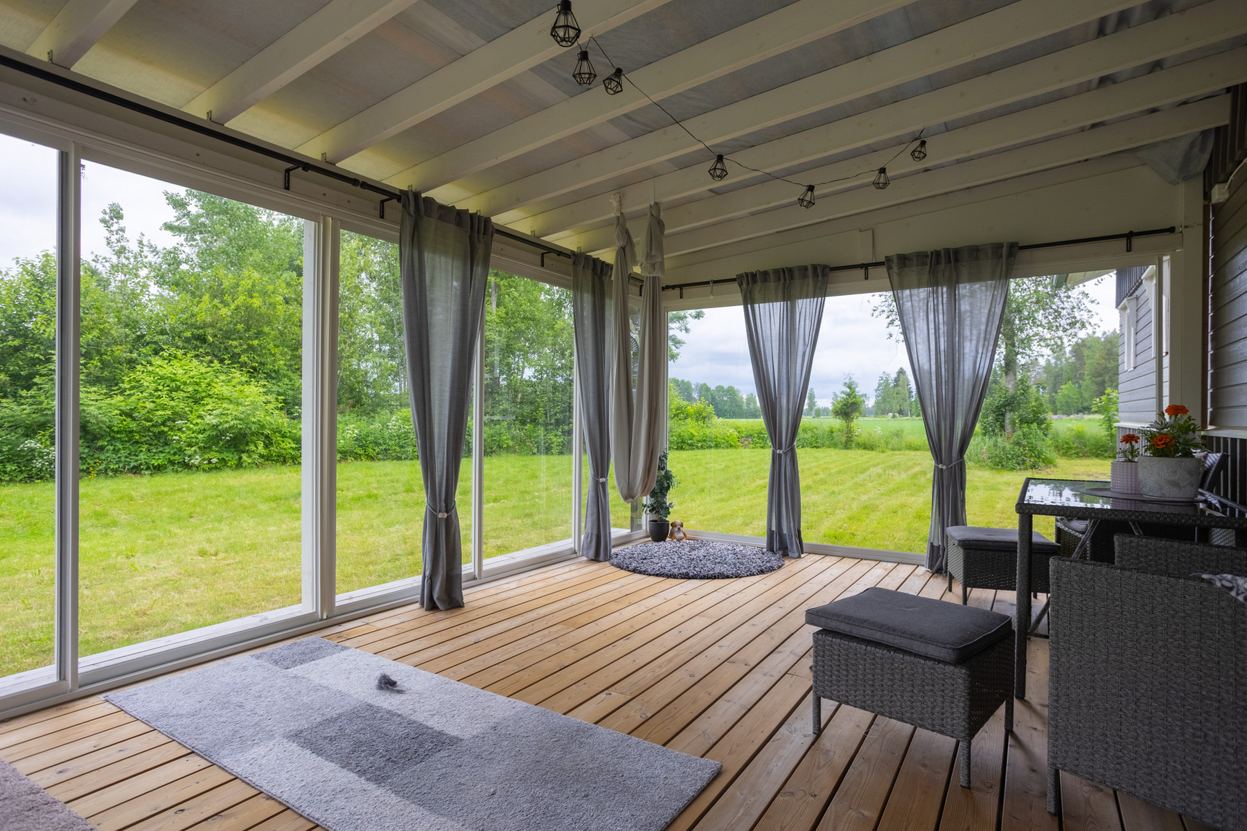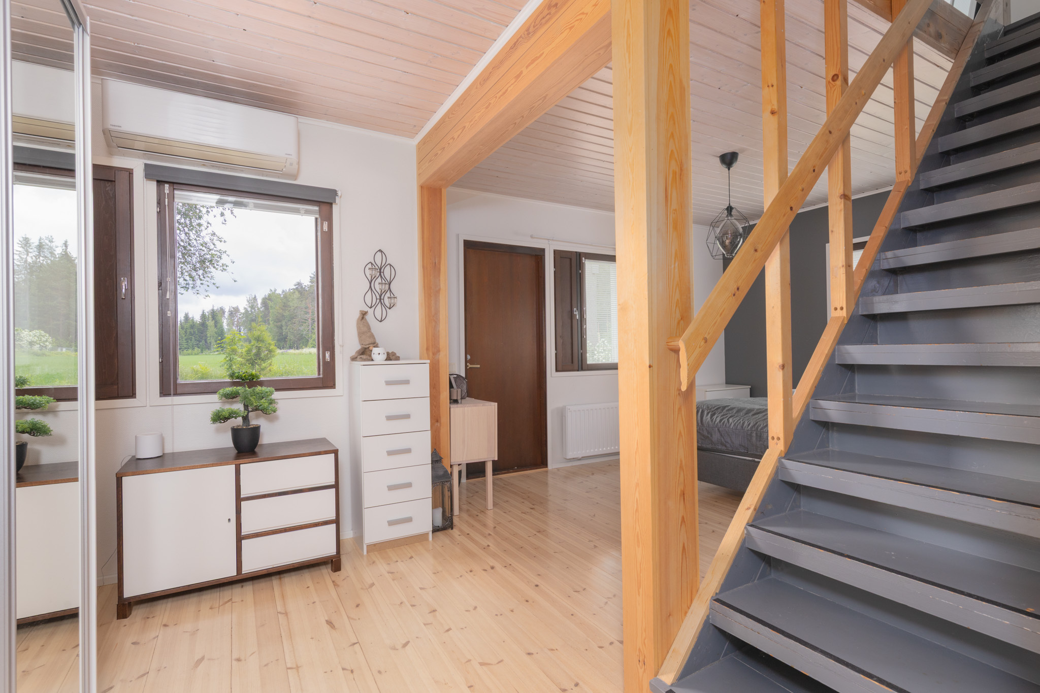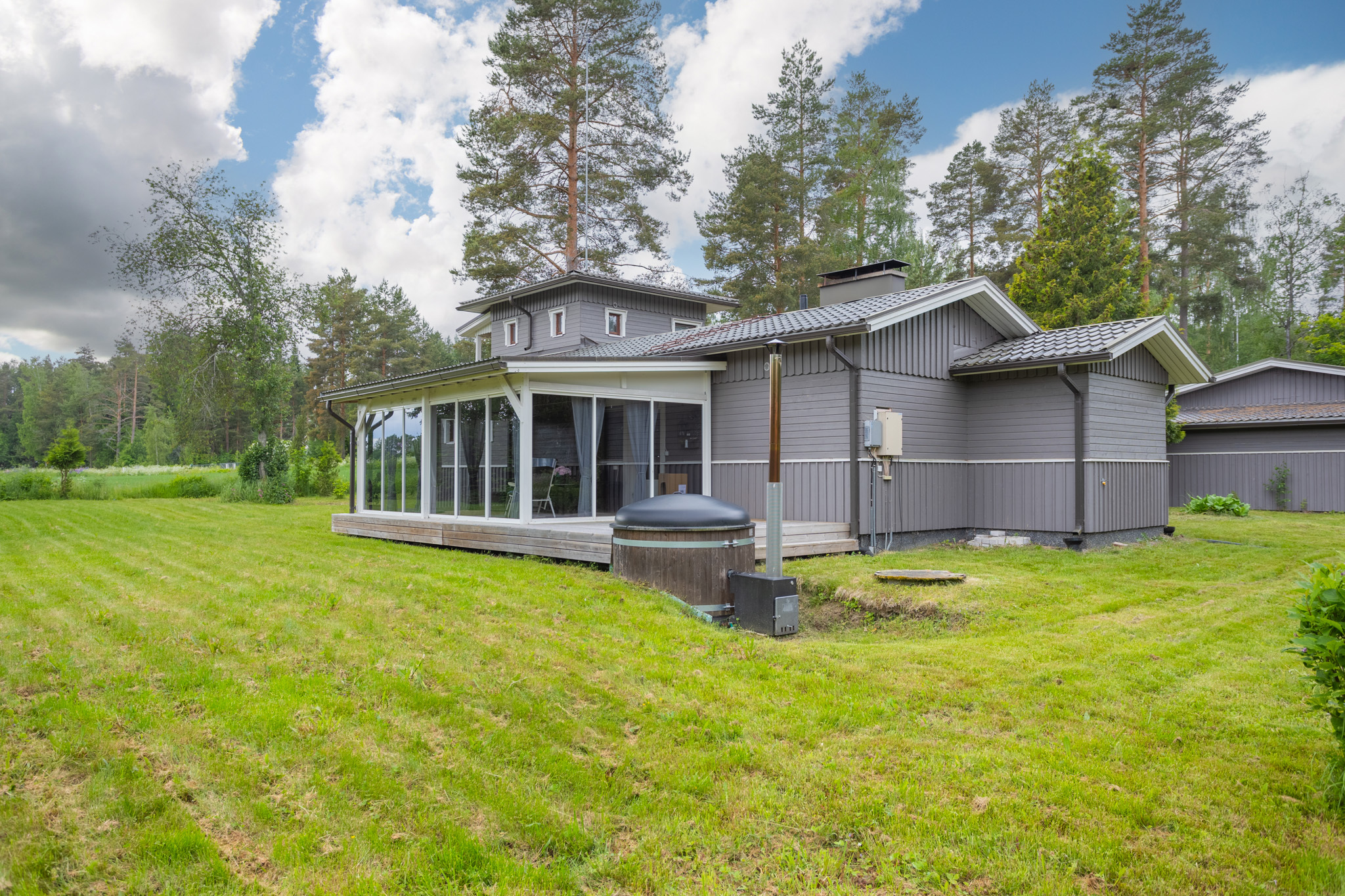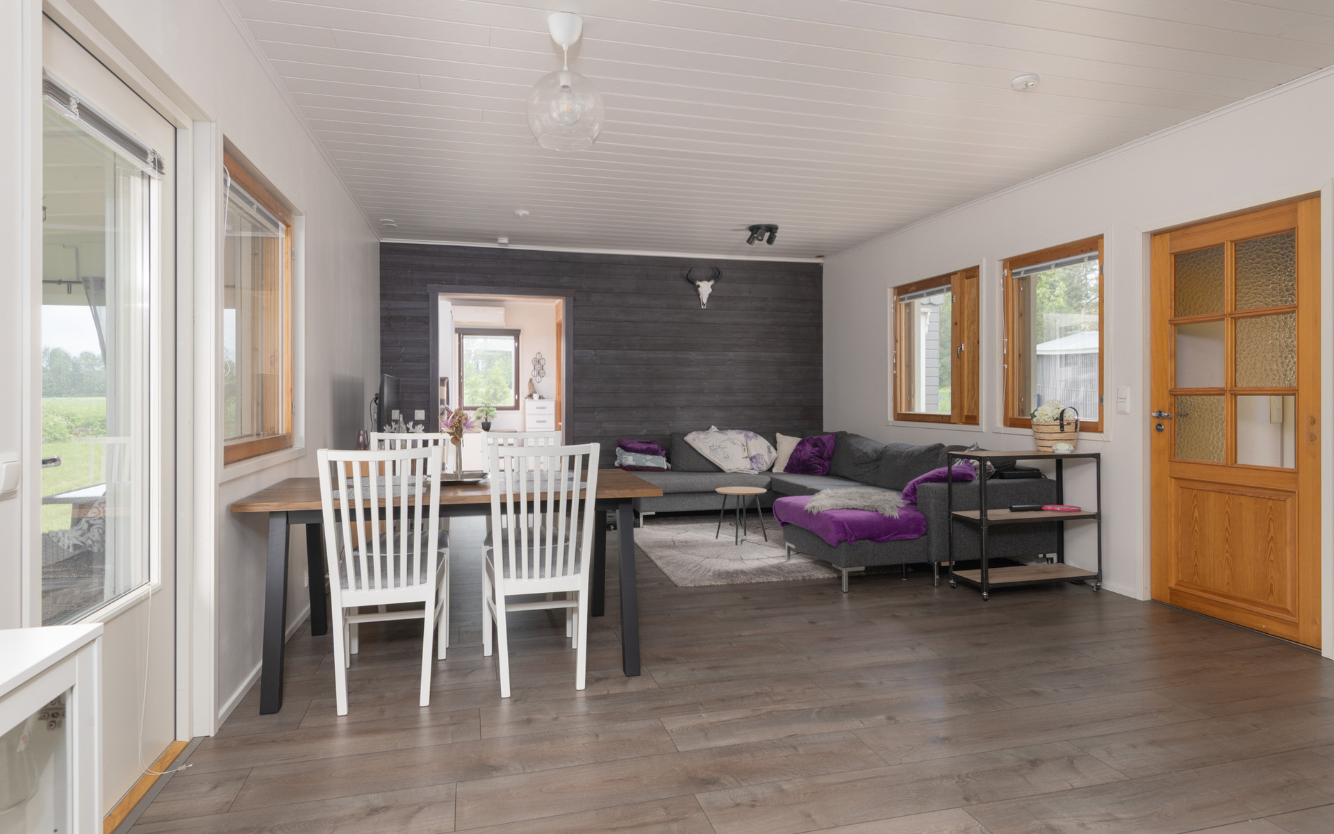 Sisällä tunnelma on lämmin ja kutsuva. Tilava olohuone yhdistyy avokeittiöön ja kokonaisuus toimii arjessa erinomaisesti. Jokainen neliö on käytetty fiksusti. Yläkerran parvekkeelta avautuvat vehreät pelto- ja luontonäkymät. Yksi paikan ehdottomista helmistä on takapihan puolelle avautuva iso lasitettu terassi, joka jatkuu avoterassina. Täällä vietät pitkät kesäillat, syksyn sateiset kahvihetket ja näet talven tähtitaivaan – ja kun haluat kruunata tunnelman, pihalla odottaa lämmitettävä palju.