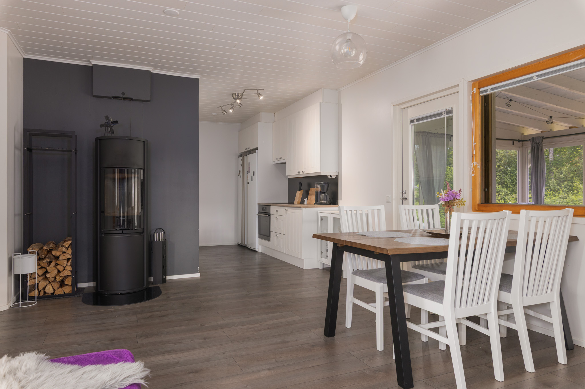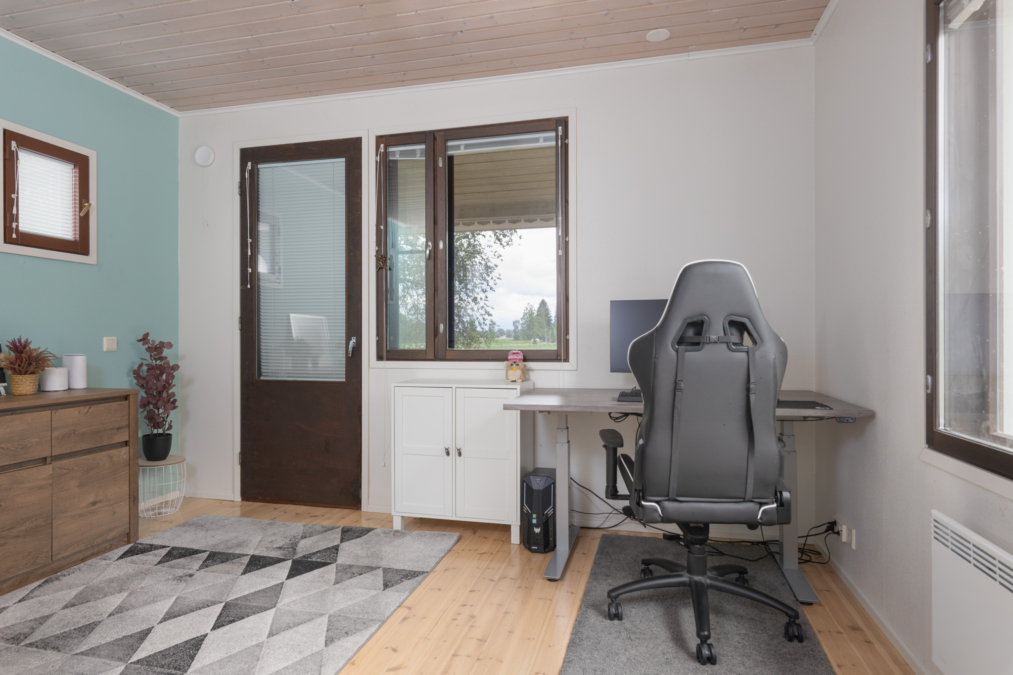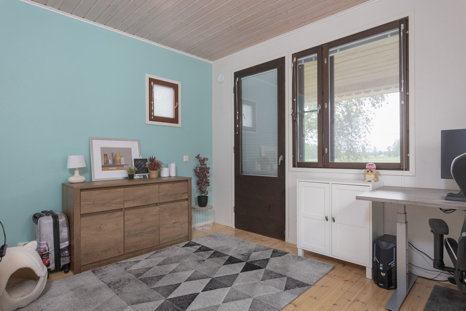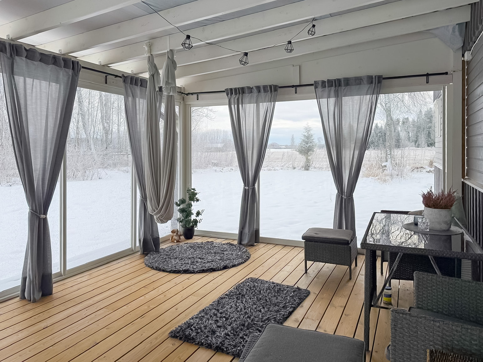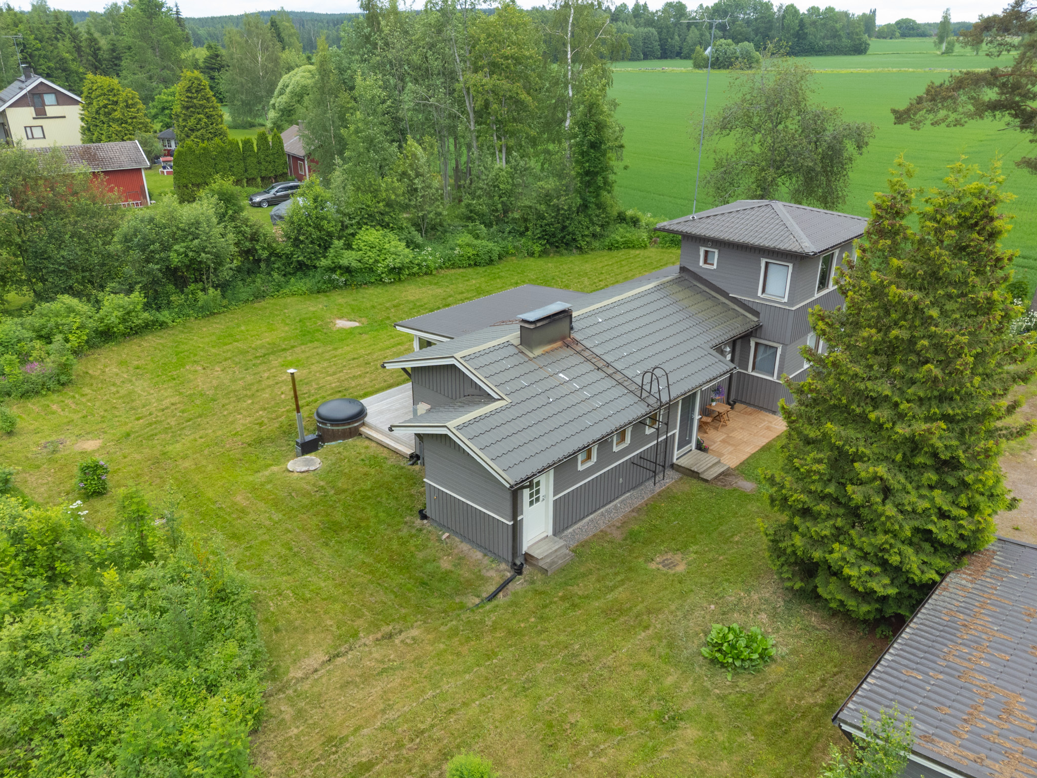 Sisällä tunnelma on lämmin ja kutsuva. Tilava olohuone yhdistyy avokeittiöön ja kokonaisuus toimii arjessa erinomaisesti. Jokainen neliö on käytetty fiksusti. Yläkerran parvekkeelta avautuvat vehreät pelto- ja luontonäkymät. Yksi paikan ehdottomista helmistä on takapihan puolelle avautuva iso lasitettu terassi, joka jatkuu avoterassina. Täällä vietät pitkät kesäillat, syksyn sateiset kahvihetket ja näet talven tähtitaivaan – ja kun haluat kruunata tunnelman, pihalla odottaa lämmitettävä palju.