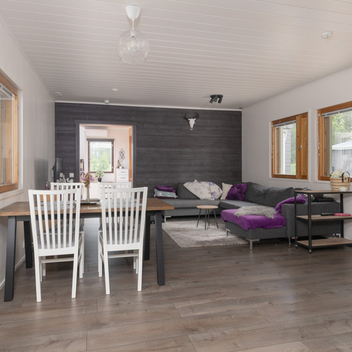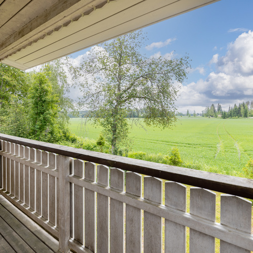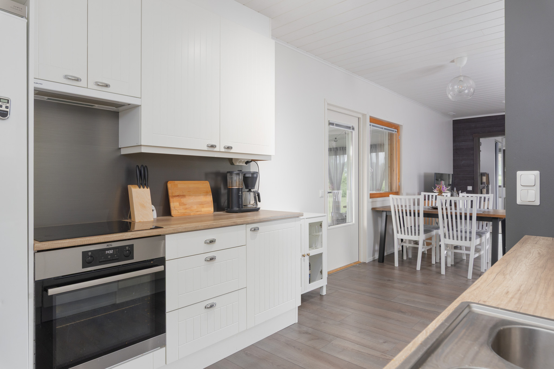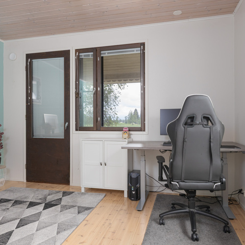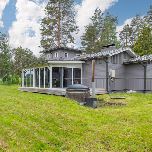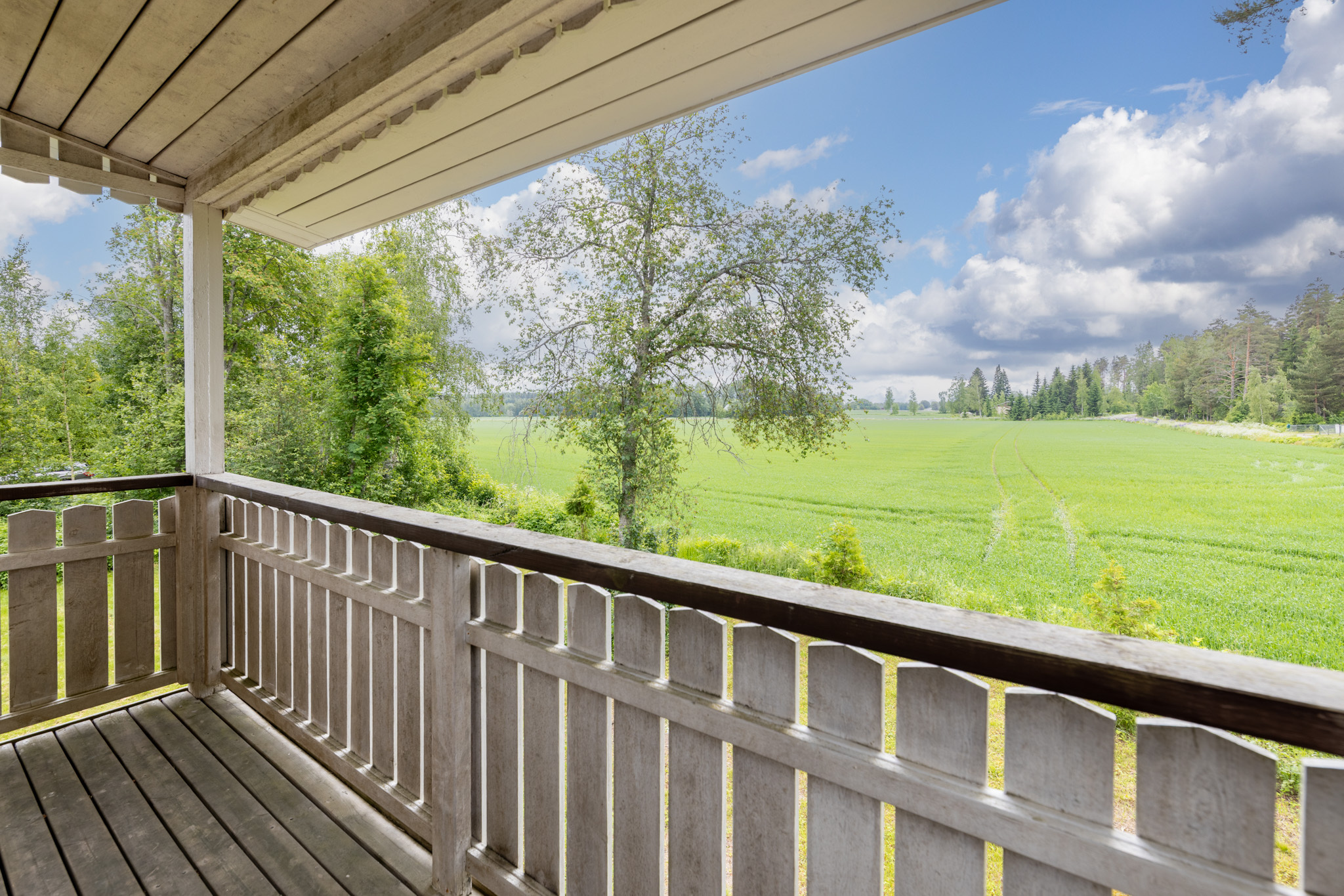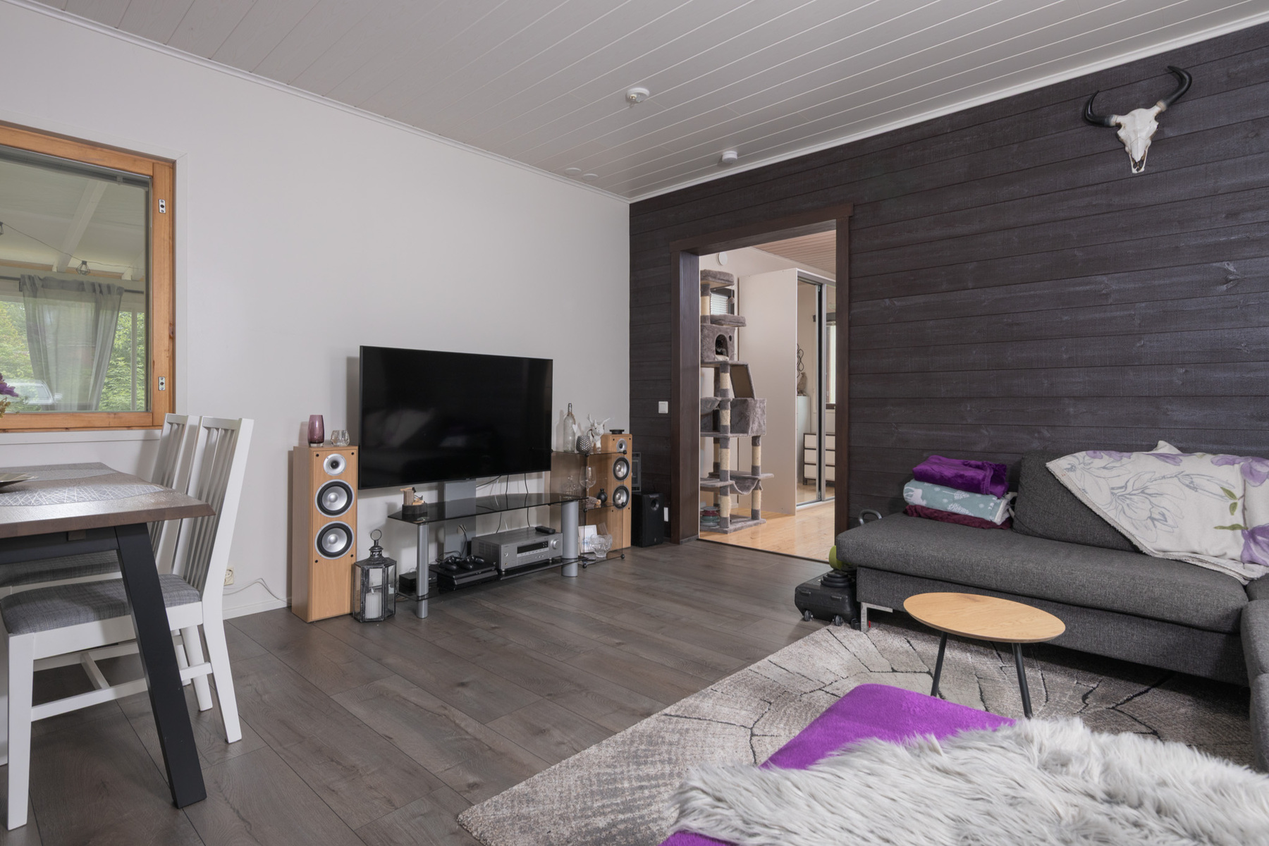 Sisällä tunnelma on lämmin ja kutsuva. Tilava olohuone yhdistyy avokeittiöön ja kokonaisuus toimii arjessa erinomaisesti. Jokainen neliö on käytetty fiksusti. Yläkerran parvekkeelta avautuvat vehreät pelto- ja luontonäkymät. Yksi paikan ehdottomista helmistä on takapihan puolelle avautuva iso lasitettu terassi, joka jatkuu avoterassina. Täällä vietät pitkät kesäillat, syksyn sateiset kahvihetket ja näet talven tähtitaivaan – ja kun haluat kruunata tunnelman, pihalla odottaa lämmitettävä palju.