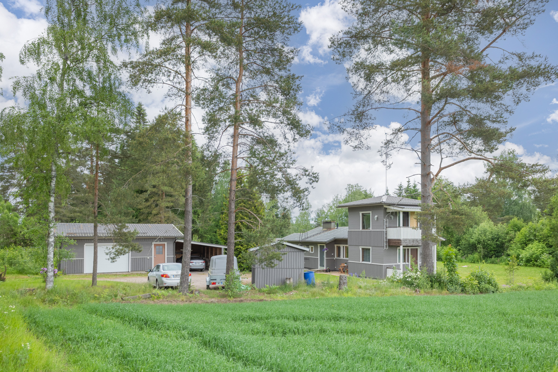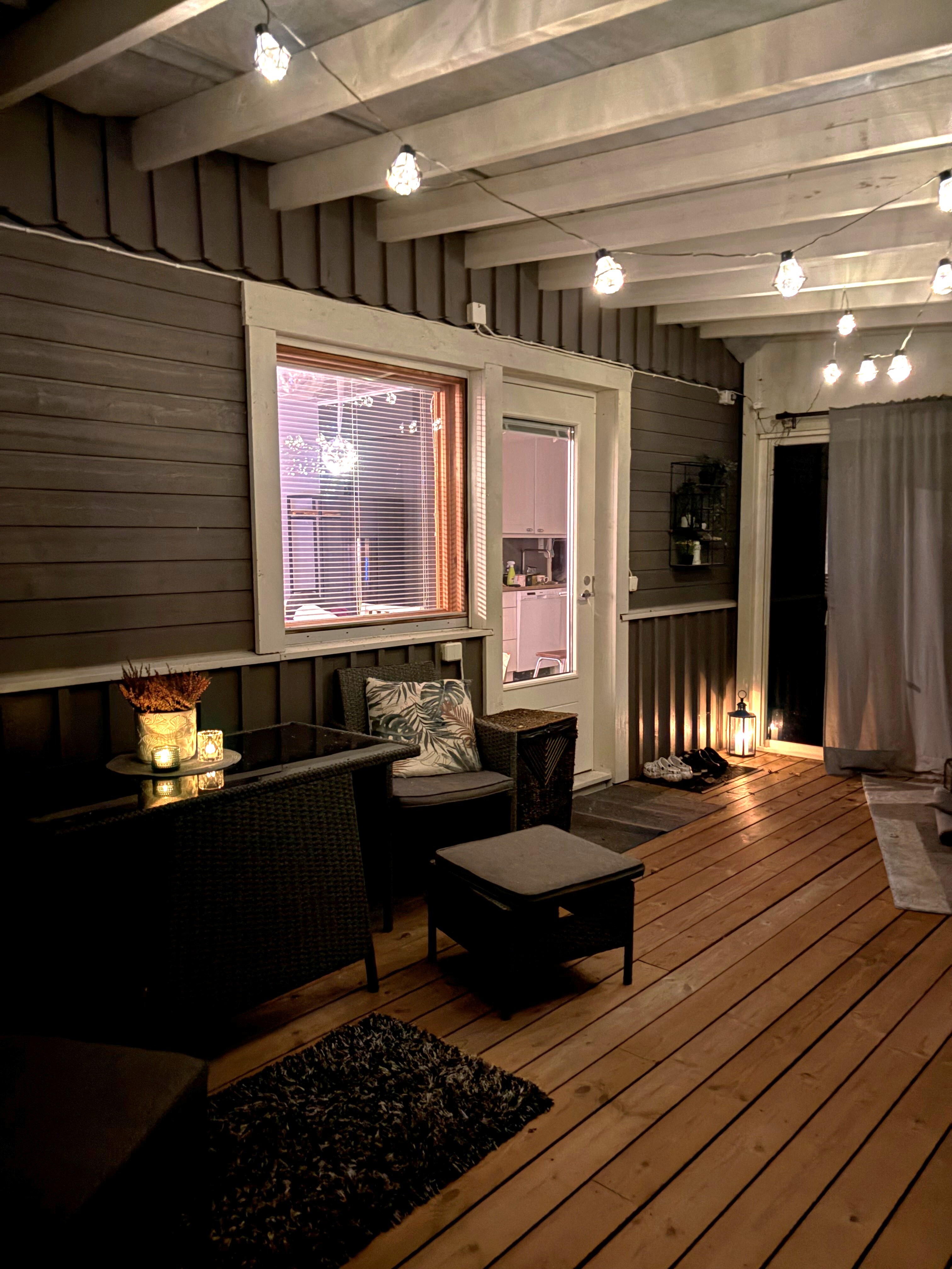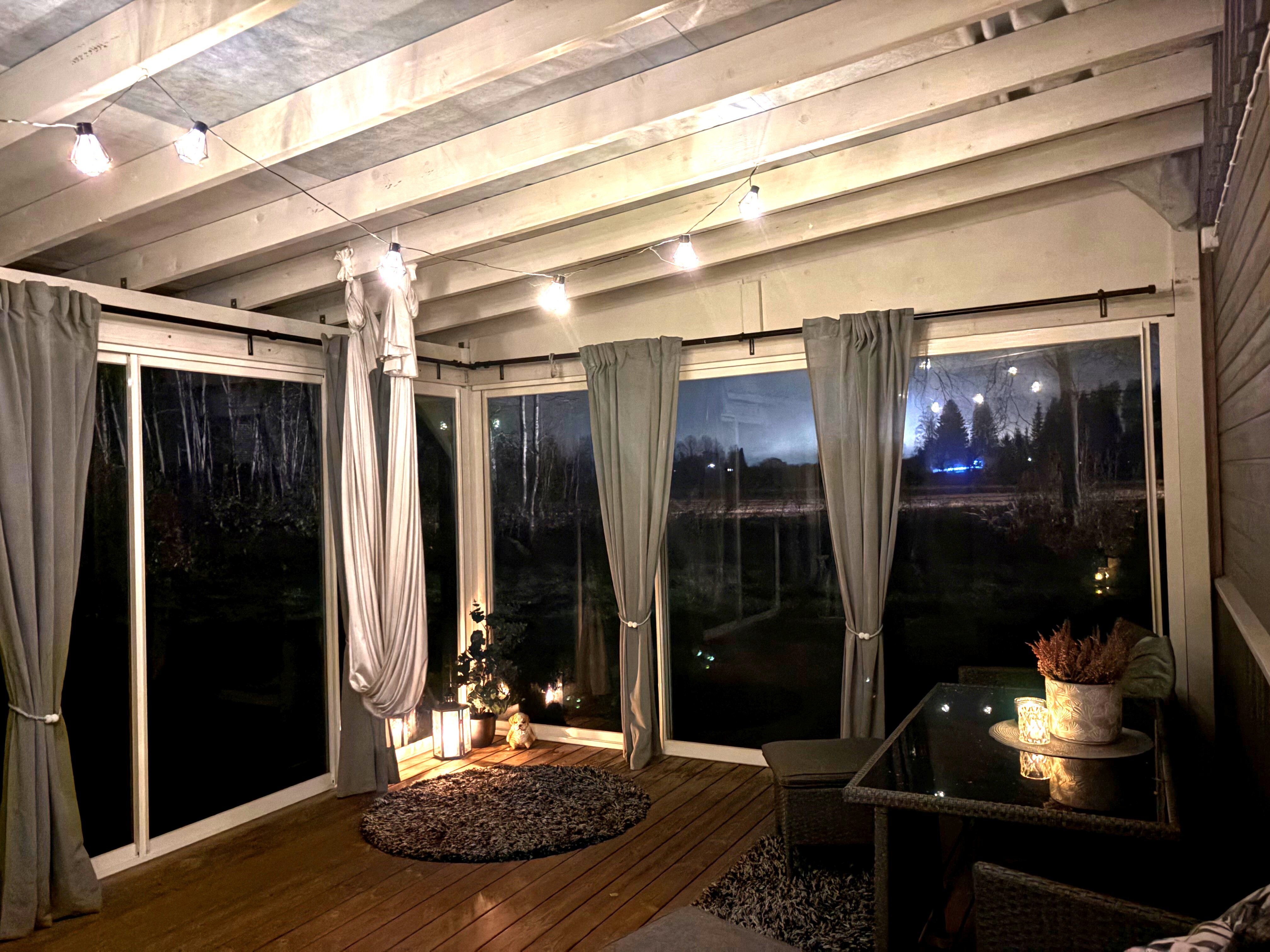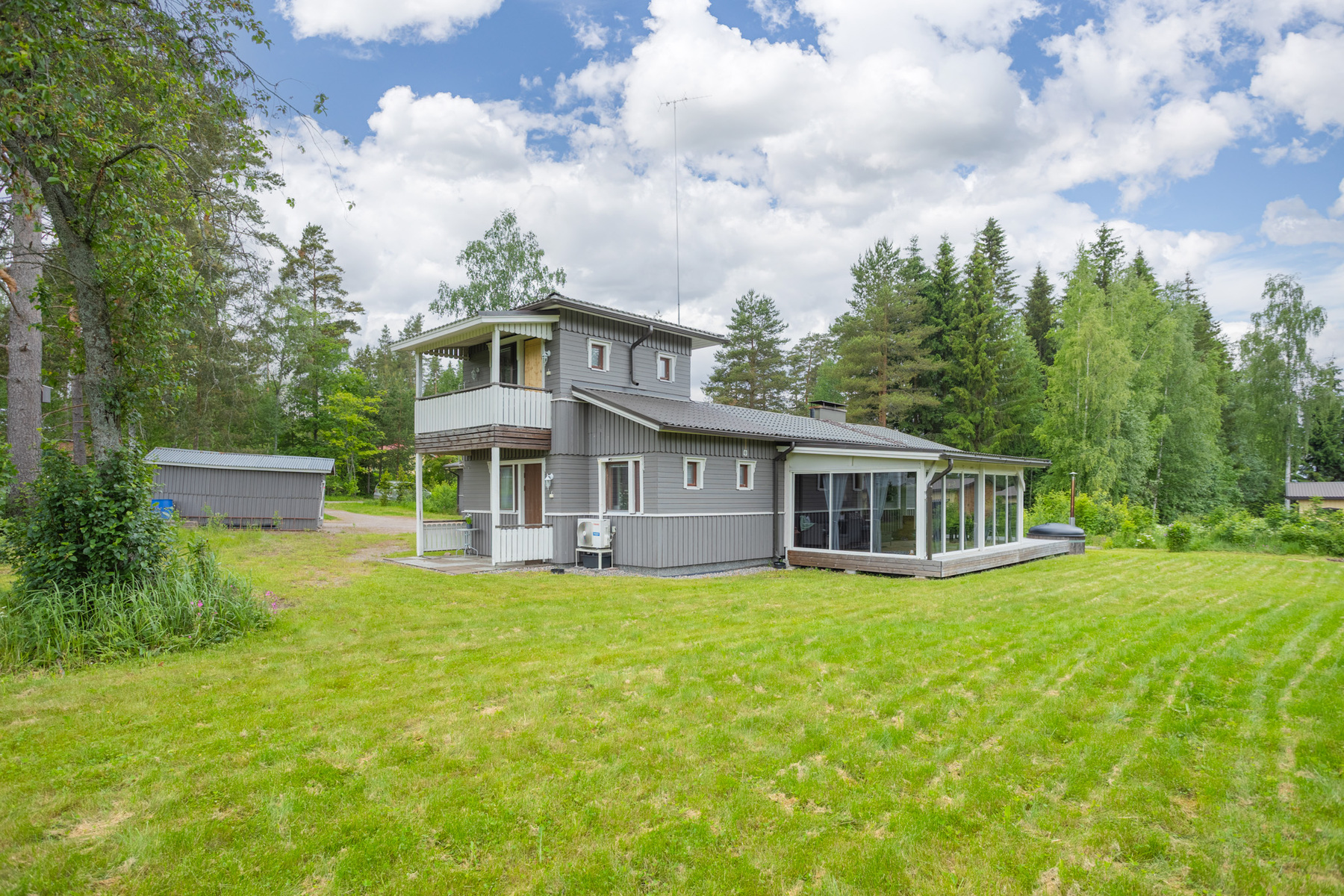Sisällä tunnelma on lämmin ja kutsuva. Tilava olohuone yhdistyy avokeittiöön ja kokonaisuus toimii arjessa erinomaisesti. Jokainen neliö on käytetty fiksusti. Yläkerran parvekkeelta avautuvat vehreät pelto- ja luontonäkymät. Yksi paikan ehdottomista helmistä on takapihan puolelle avautuva iso lasitettu terassi, joka jatkuu avoterassina. Täällä vietät pitkät kesäillat, syksyn sateiset kahvihetket ja näet talven tähtitaivaan – ja kun haluat kruunata tunnelman, pihalla odottaa lämmitettävä palju.