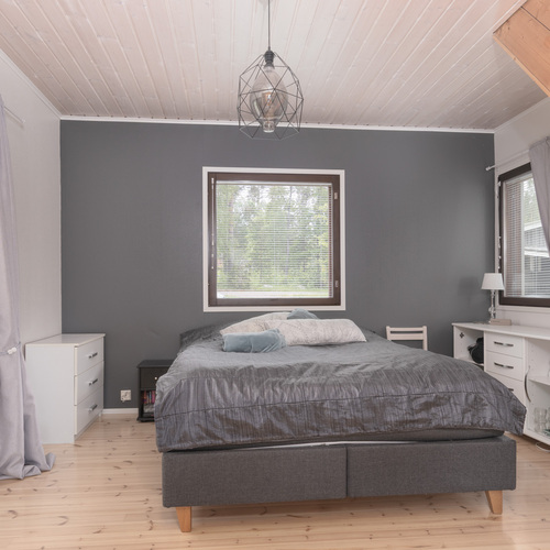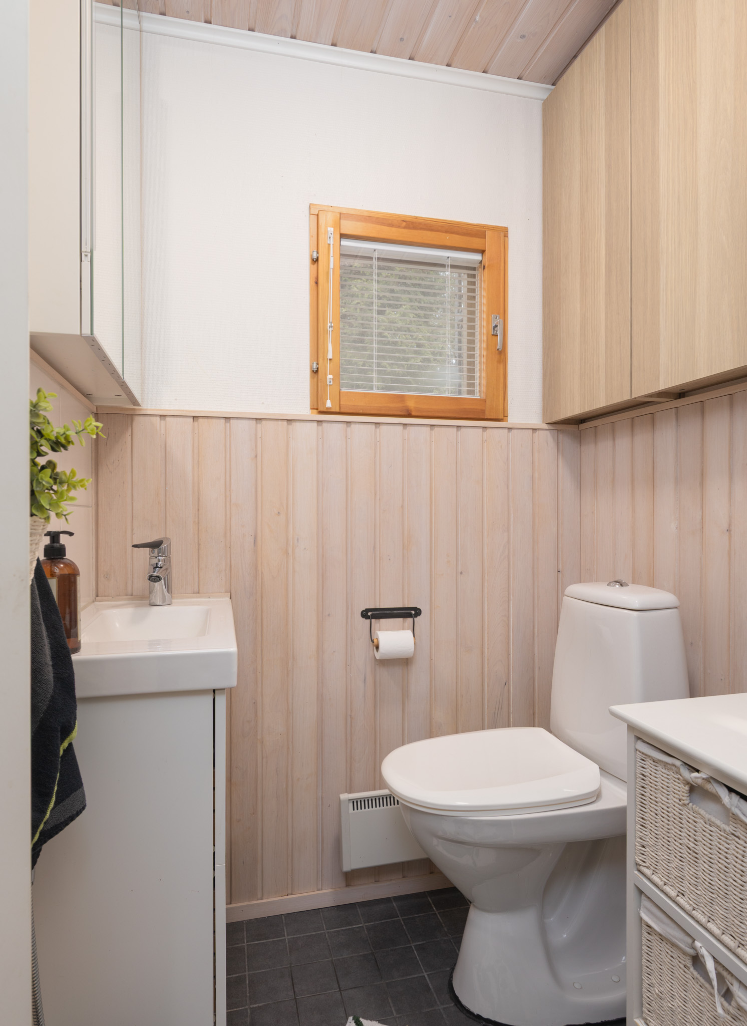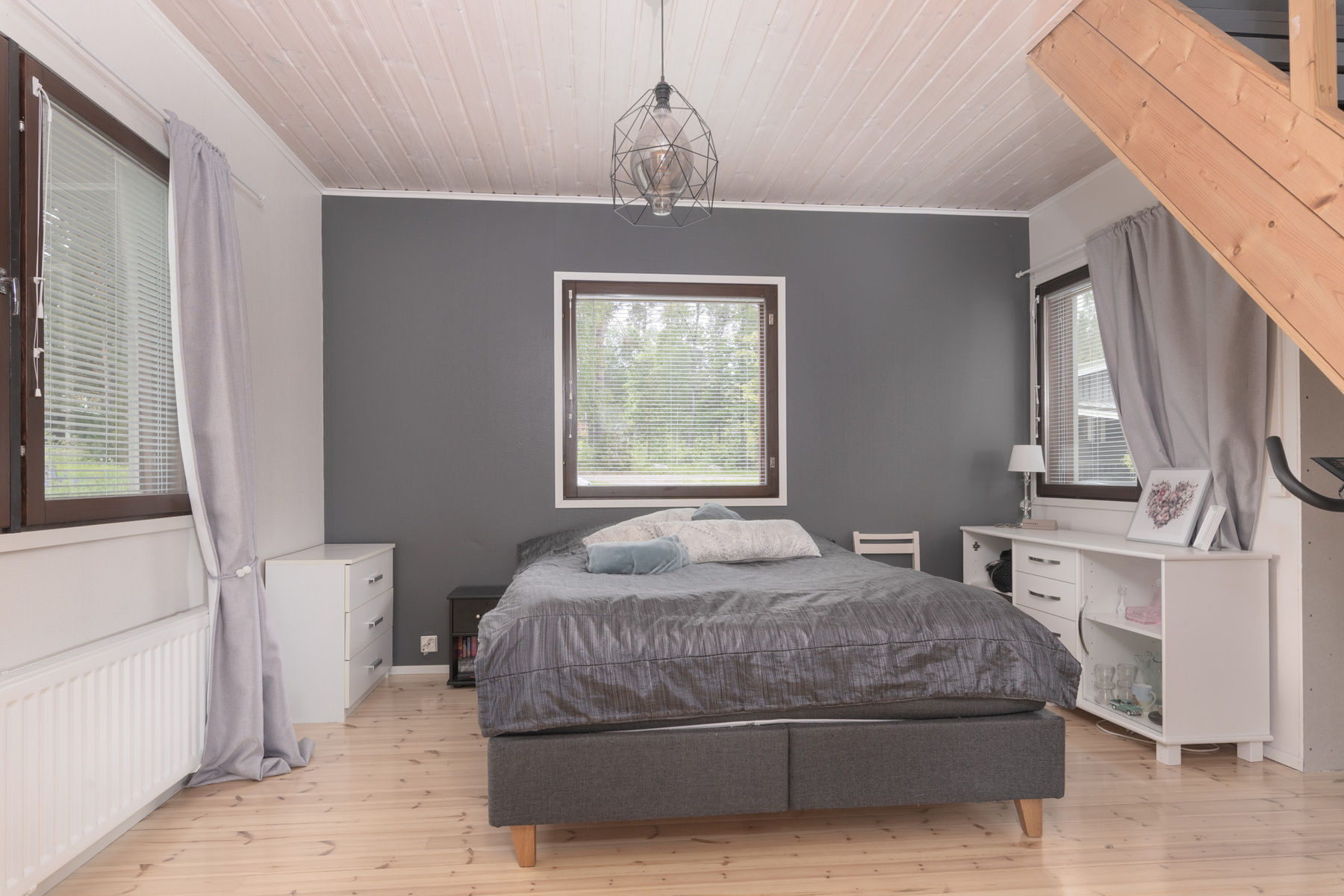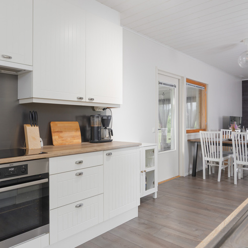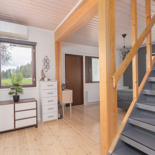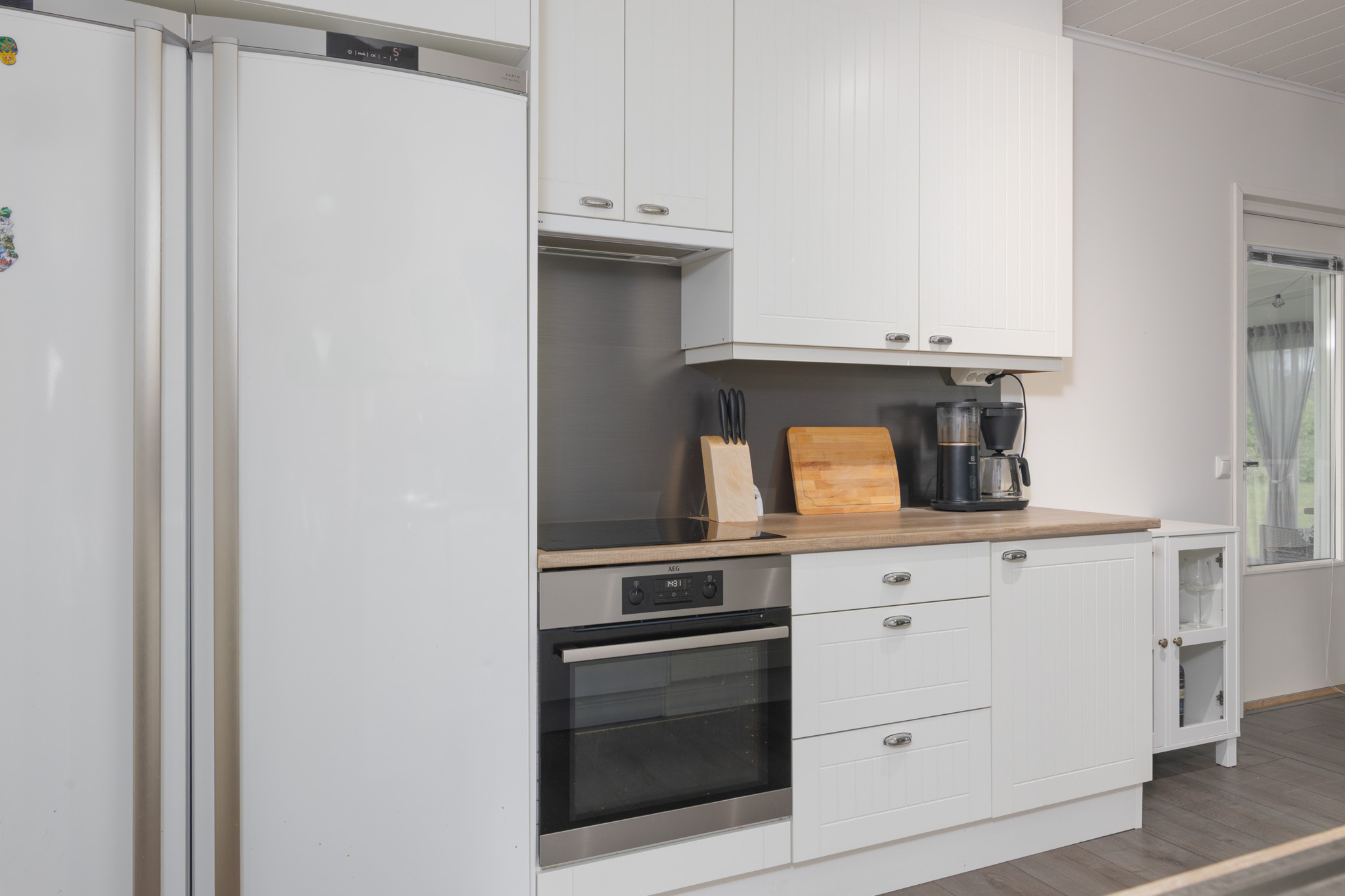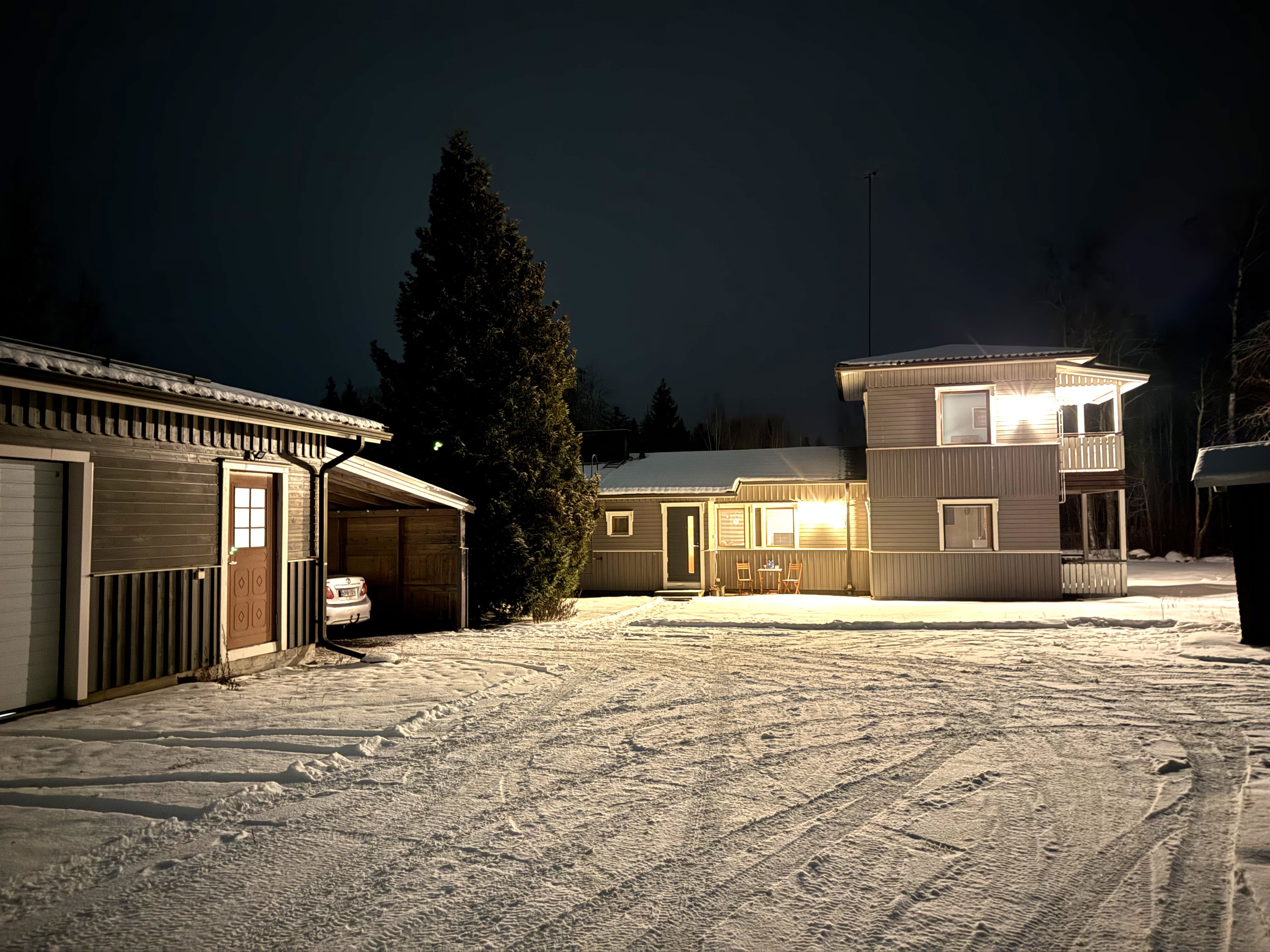 Sisällä tunnelma on lämmin ja kutsuva. Tilava olohuone yhdistyy avokeittiöön ja kokonaisuus toimii arjessa erinomaisesti. Jokainen neliö on käytetty fiksusti. Yläkerran parvekkeelta avautuvat vehreät pelto- ja luontonäkymät. Yksi paikan ehdottomista helmistä on takapihan puolelle avautuva iso lasitettu terassi, joka jatkuu avoterassina. Täällä vietät pitkät kesäillat, syksyn sateiset kahvihetket ja näet talven tähtitaivaan – ja kun haluat kruunata tunnelman, pihalla odottaa lämmitettävä palju.