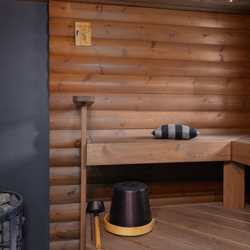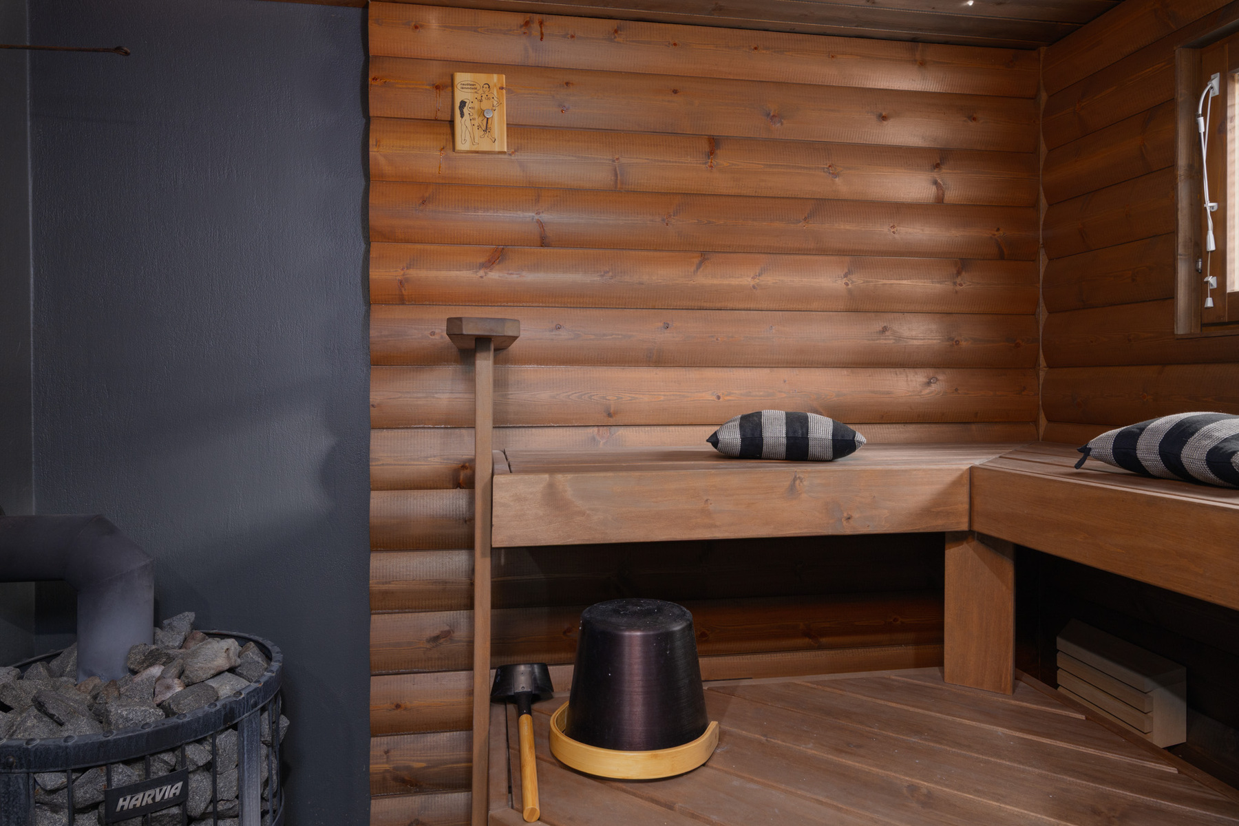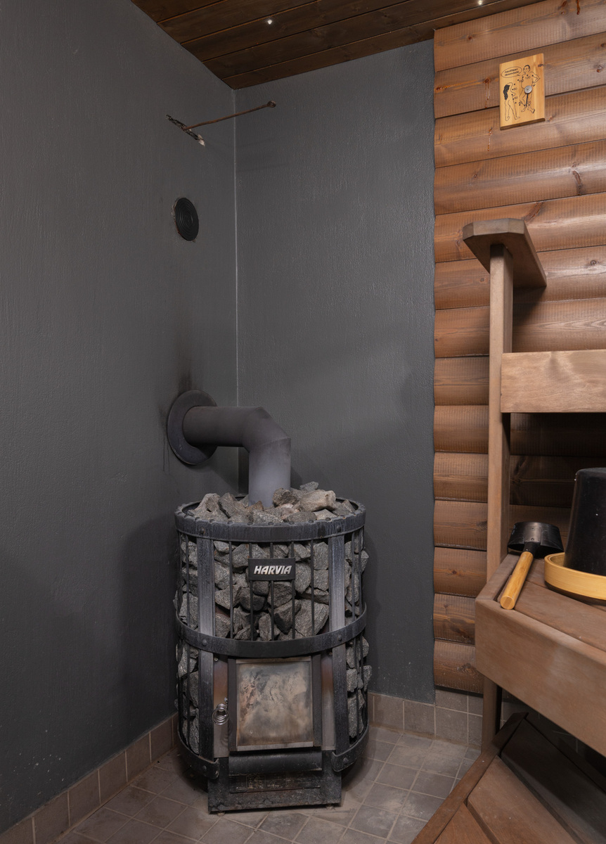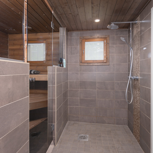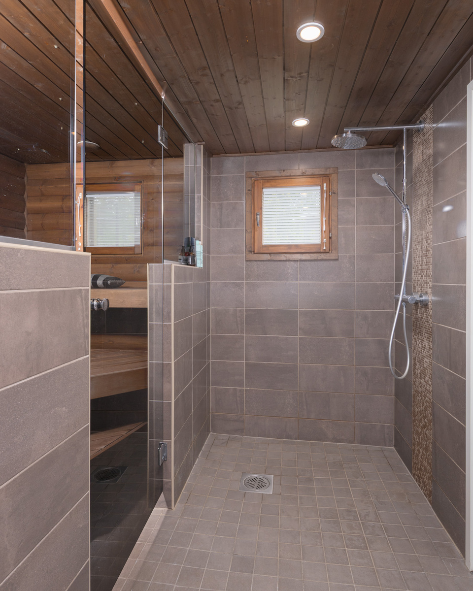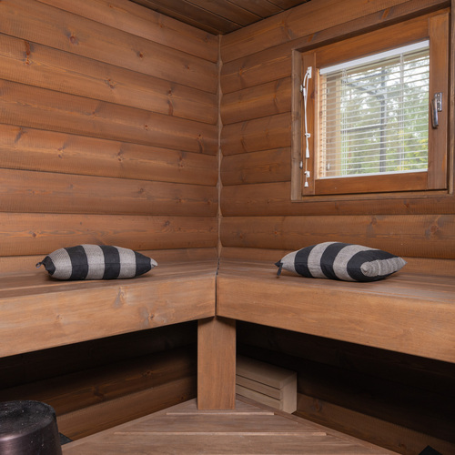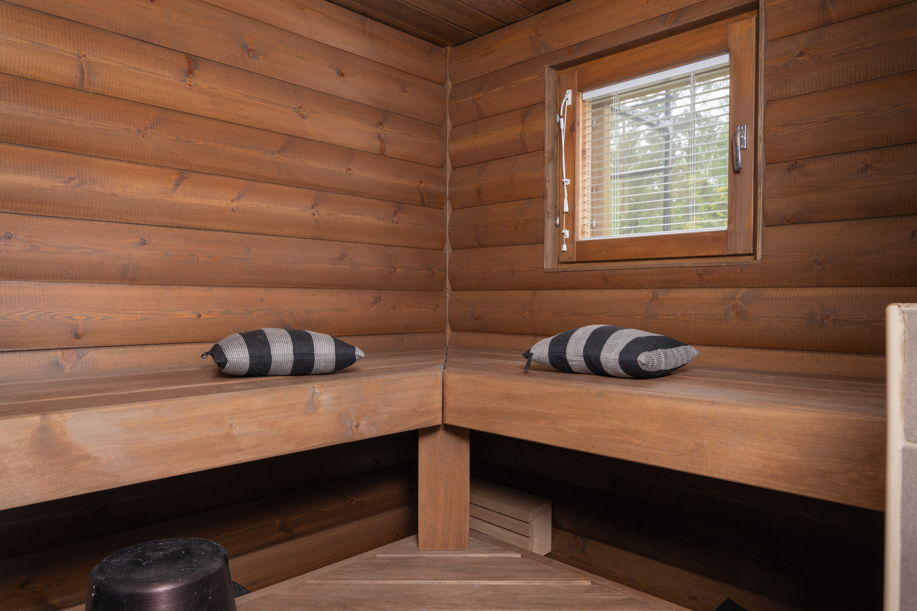 Lattiassa laatta, seinät paneloitu, lauteet, lasiovi, puukiuas. Ikkuna.