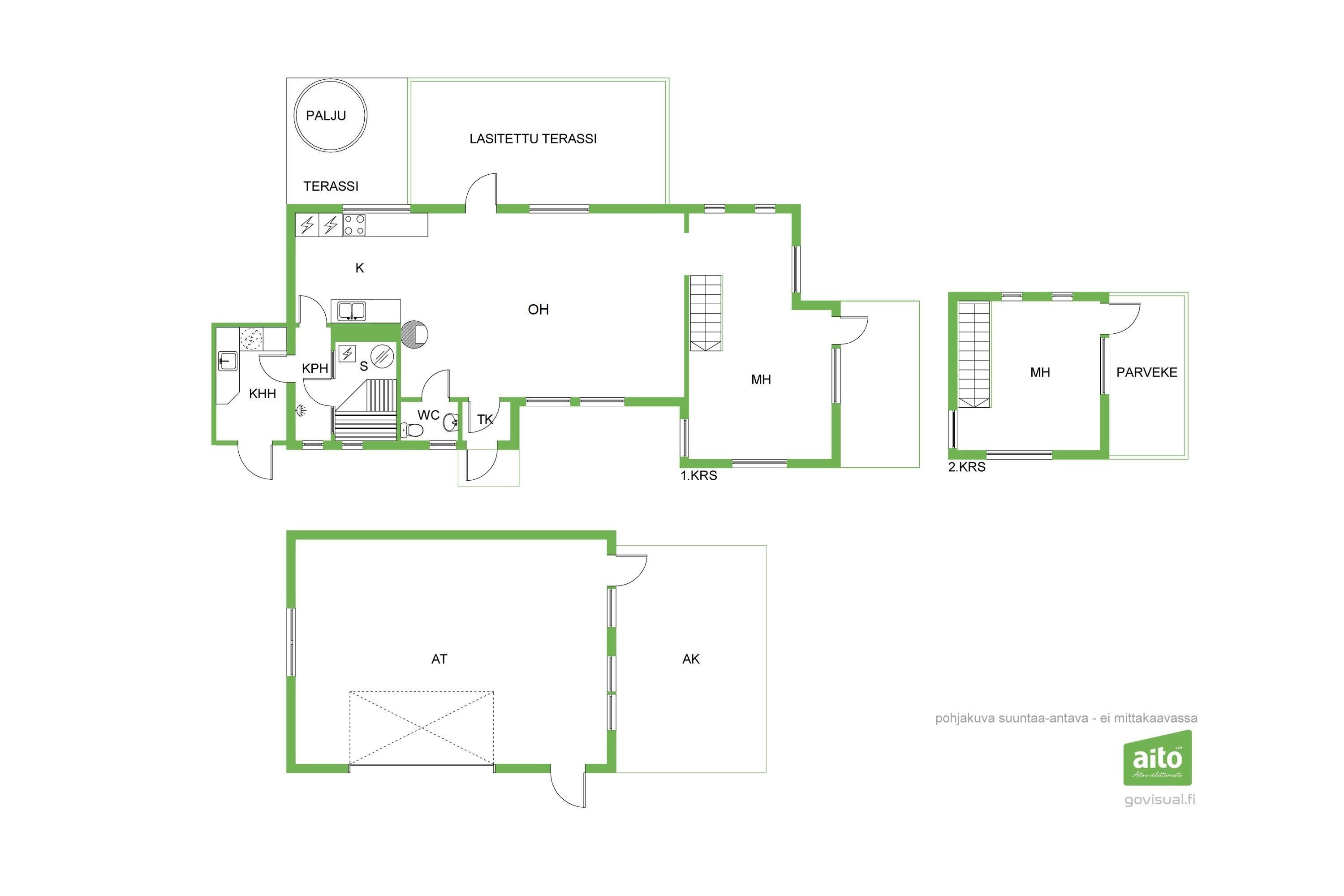 Asuinrakennus 95/110 m² ja autotalli 60 m² (kerrosala).