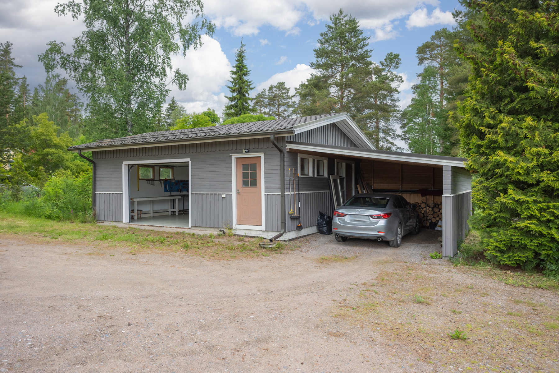 Pihapiiri on suojaisa ja viihtyisä – ja bonuksena löytyy tilava 2001 rakennettu sekä nosto-ovella että erillisellä kulkuovella varustettu autotalli, joka toimii loistavasti myös harrastetilana. Tallissa on oma ilmalämpöpumppu ja tallin päädyssä on autokatos. Pihalla on myös erillinen puuvaja.
