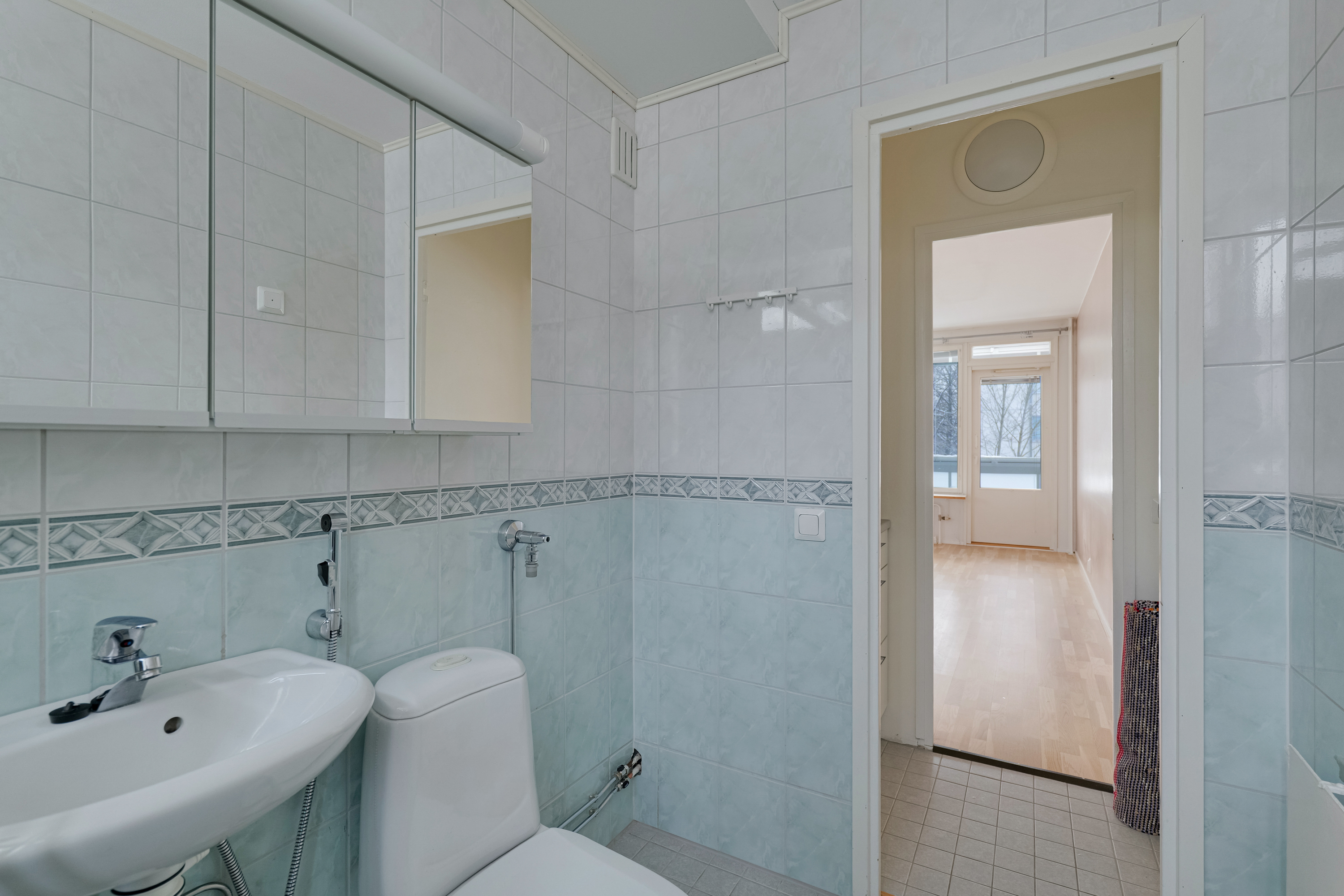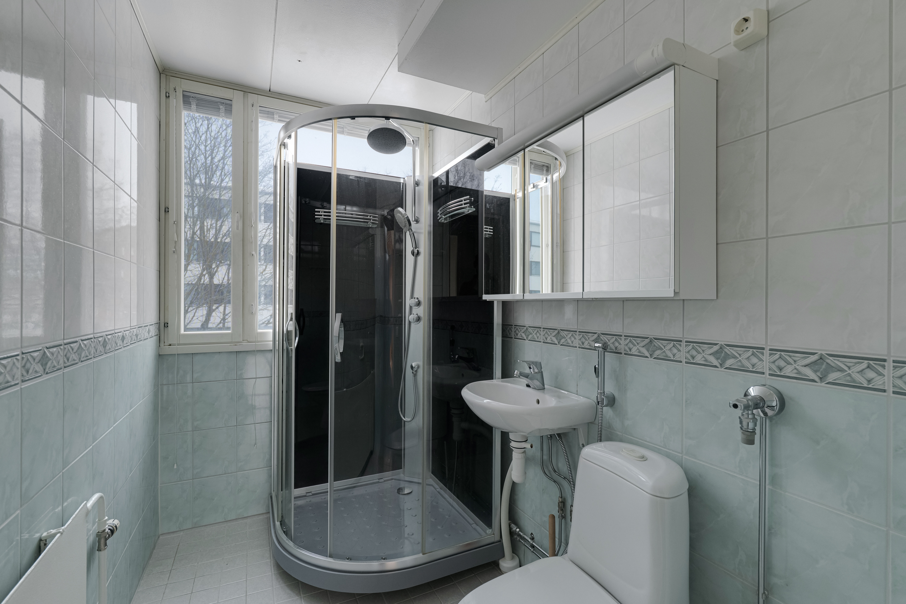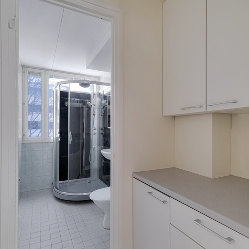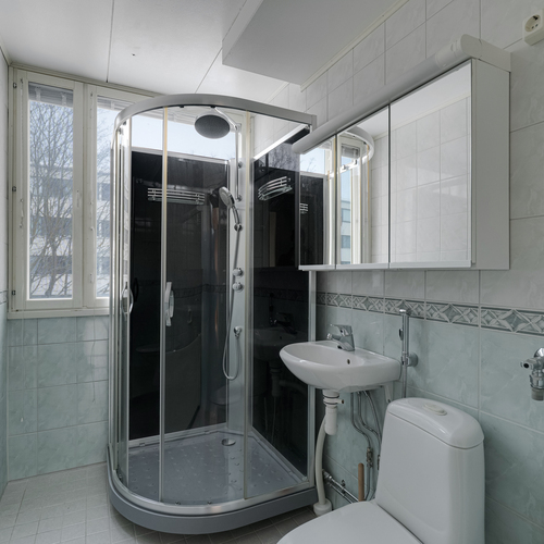 Varusteet: suihku, suihkukaappi, pesukoneliitäntä, peilikaappi