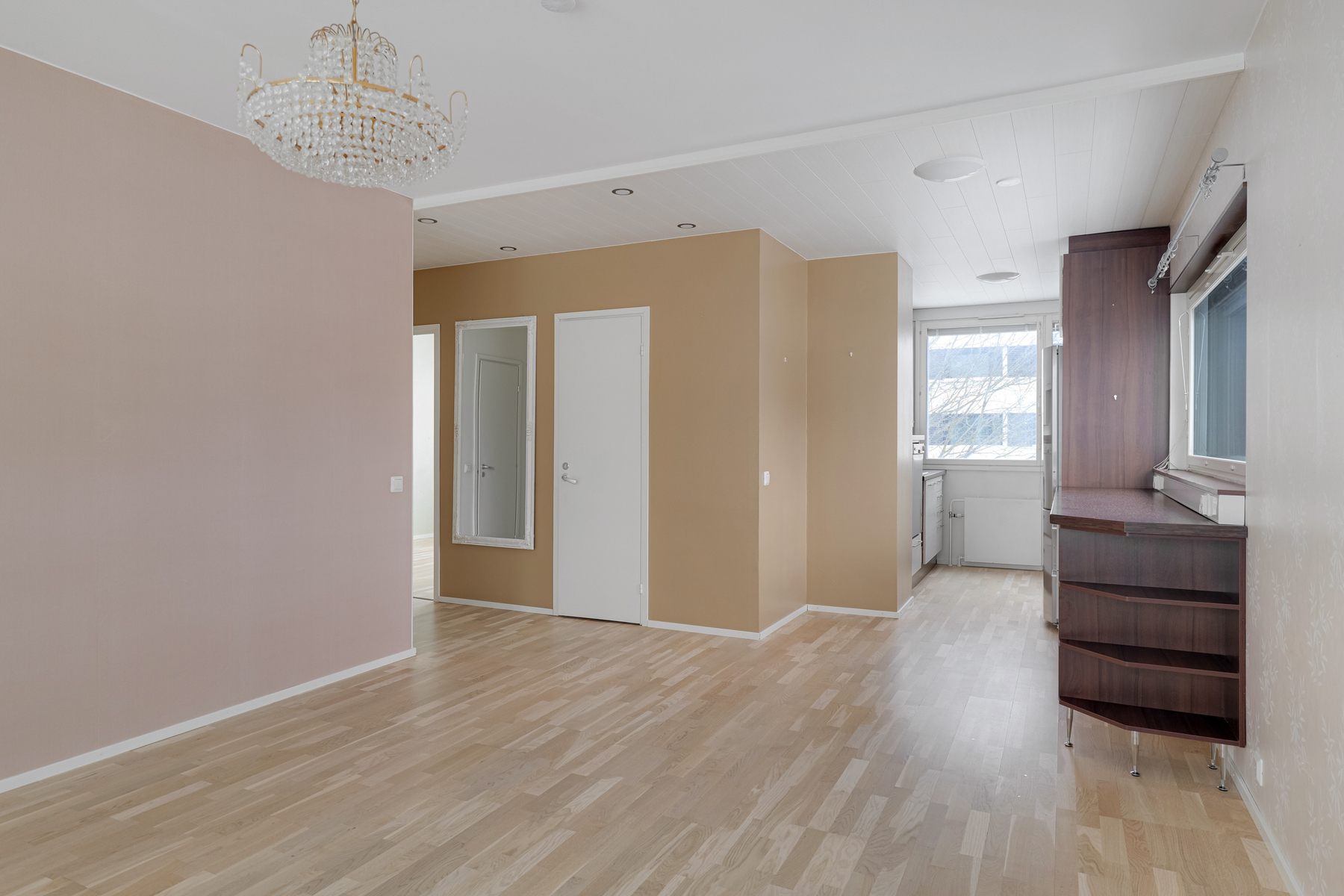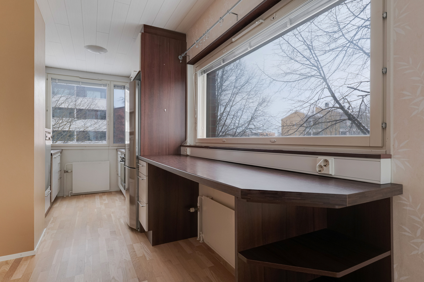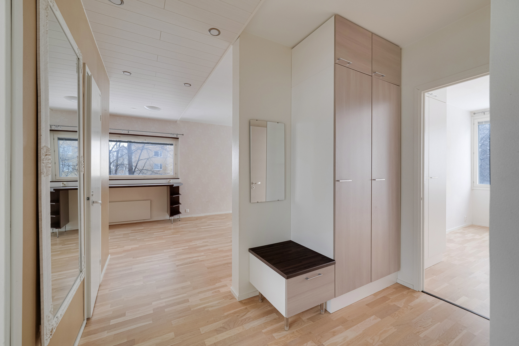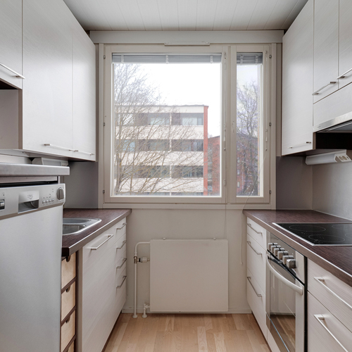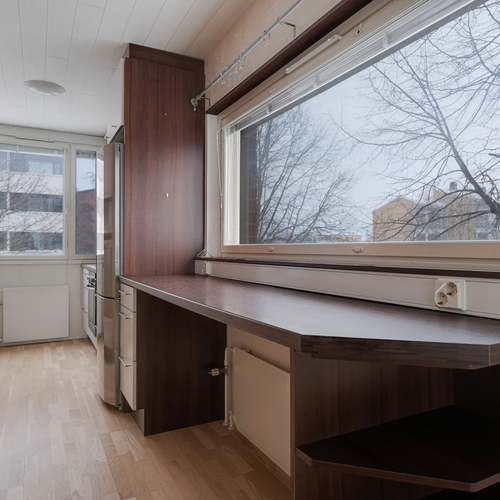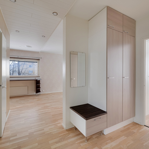 Pohjaratkaisu on toimiva ja säilytystilaa on runsaasti: käytössäsi on iso vaatehuone, erillinen pieni kodinhoitohuone sekä useita kaapistoja. Keittokomerossa on poikkeuksellisen hyvin kaappi- ja laskutilaa, mikä tekee ruoanlaitosta helppoa myös arjessa.