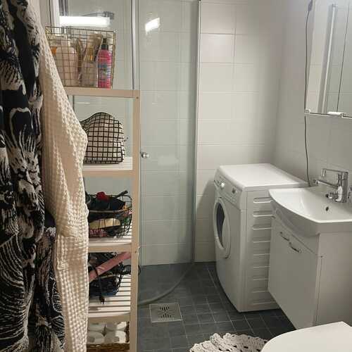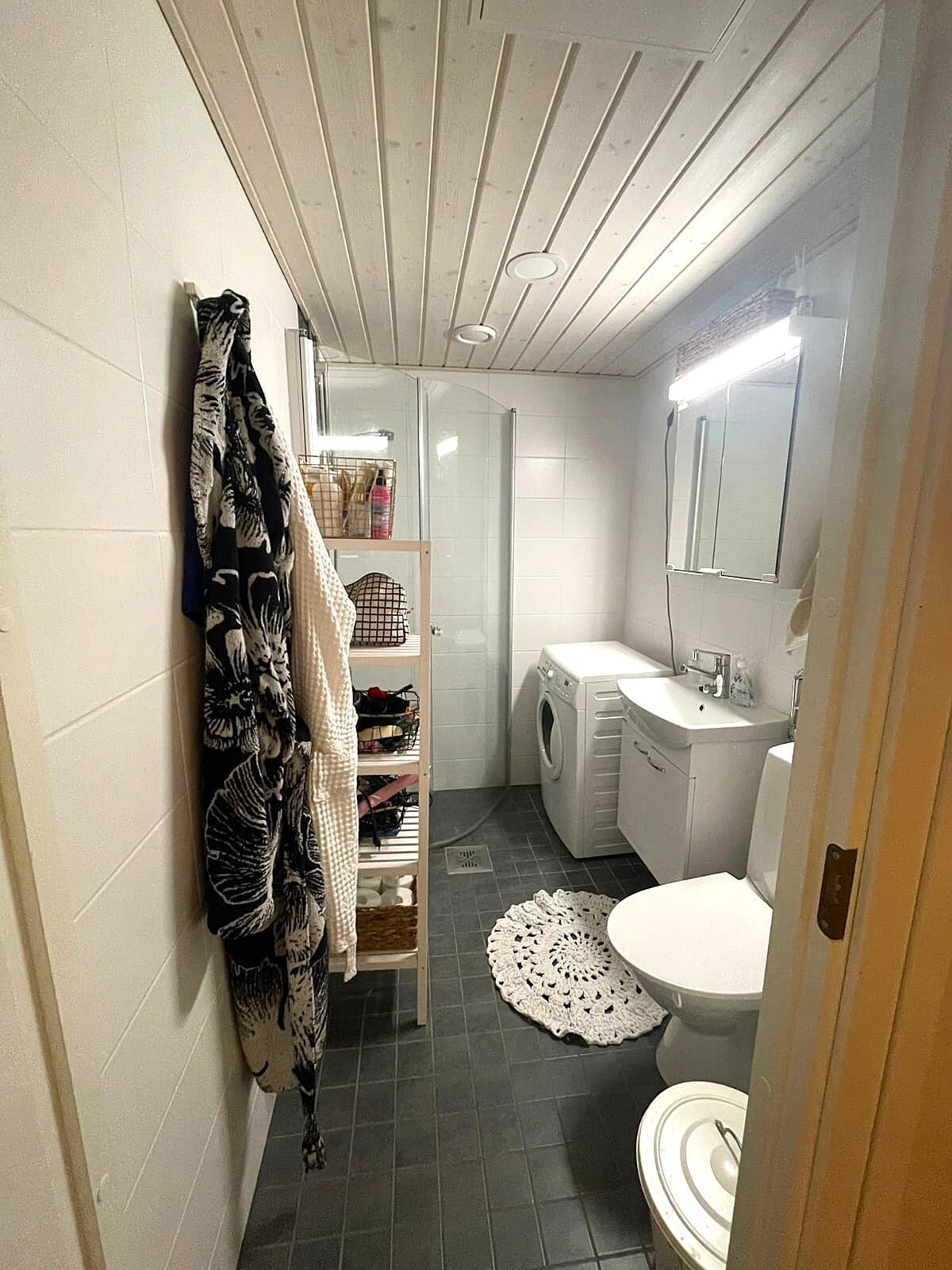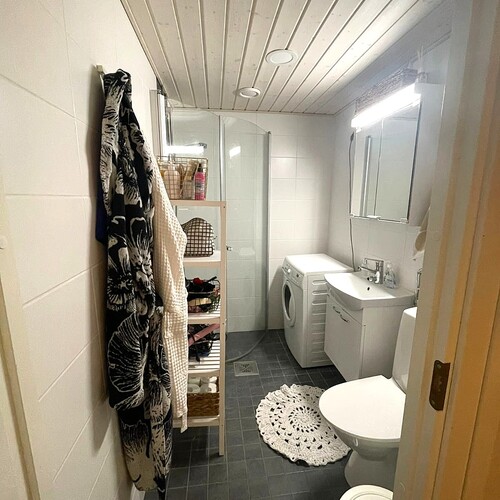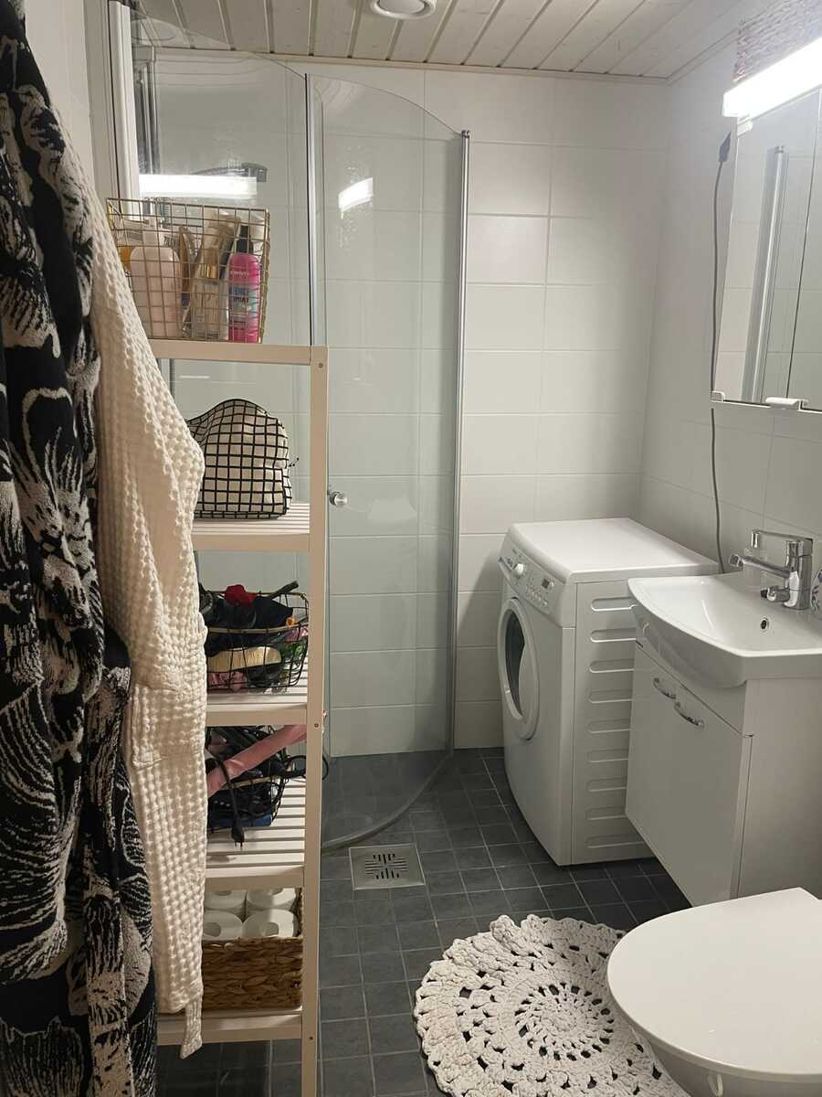 Varusteet: suihku, suihkuseinä, pesukoneliitäntä, allaskaappi, peilikaappi