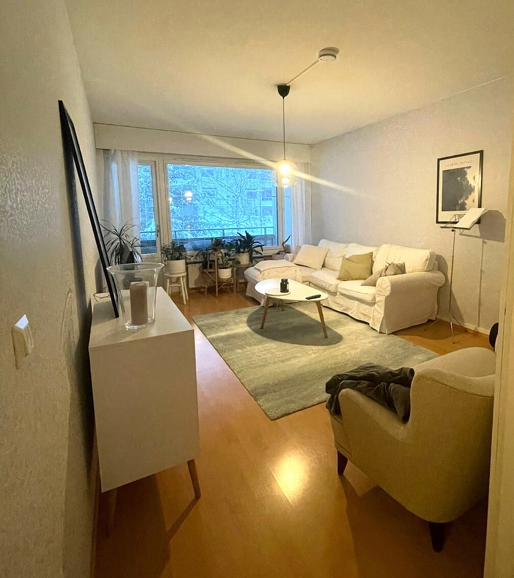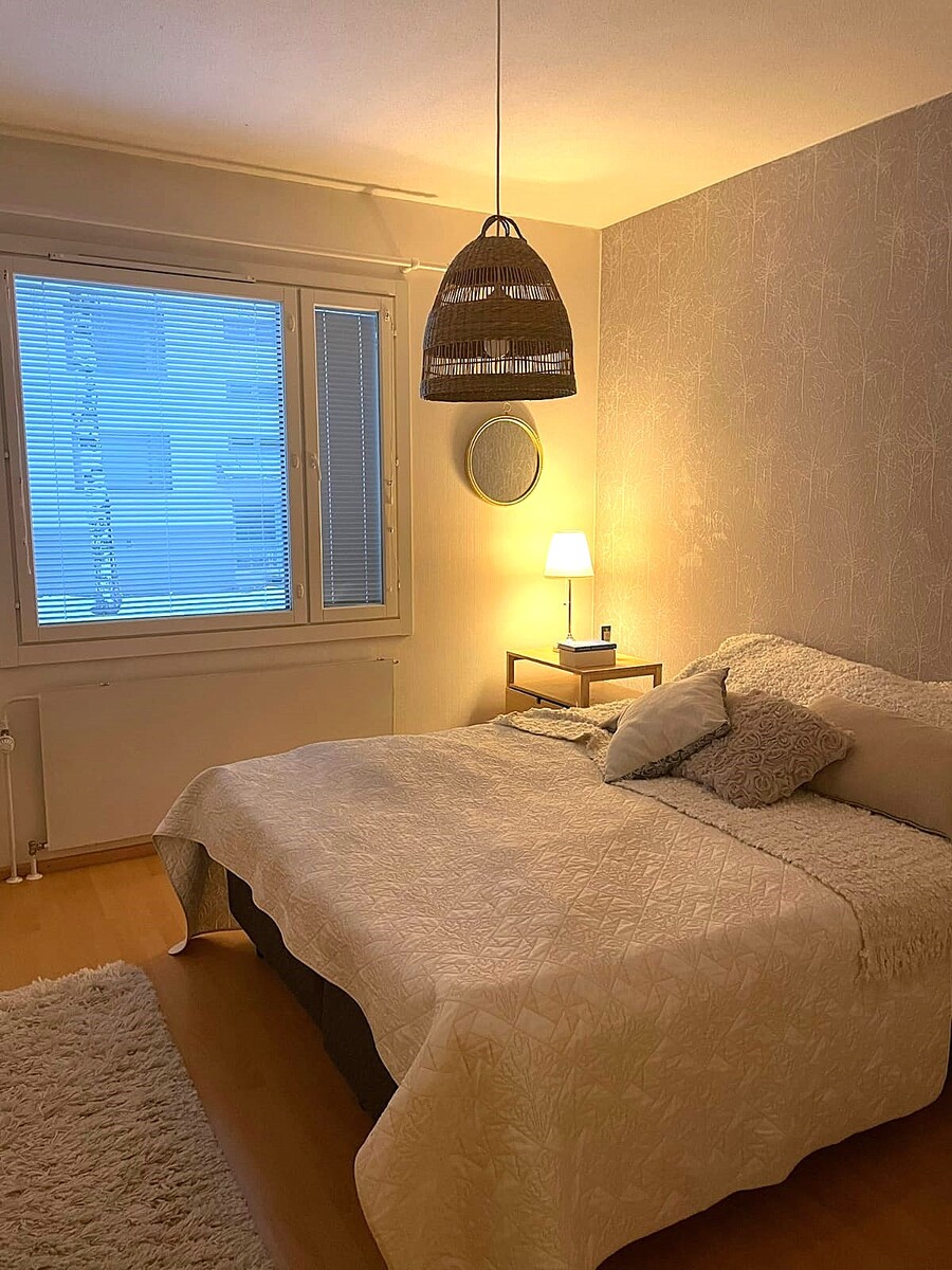 Asunnon pohjaratkaisu on käytännöllinen: kaksi makuuhuonetta, tilava olohuone sekä keittiö, johon mahtuu suurempikin ruokailuryhmä. Olohuoneesta on käynti itäiselle lasitetulle parvekkeelle, joka tuo lisätilaa asumiseen aikaisesta keväästä pitkälle syksyyn – ilman kesähelteiden kuumuutta.
