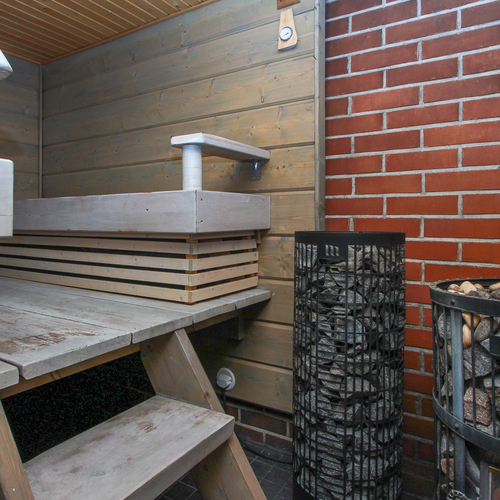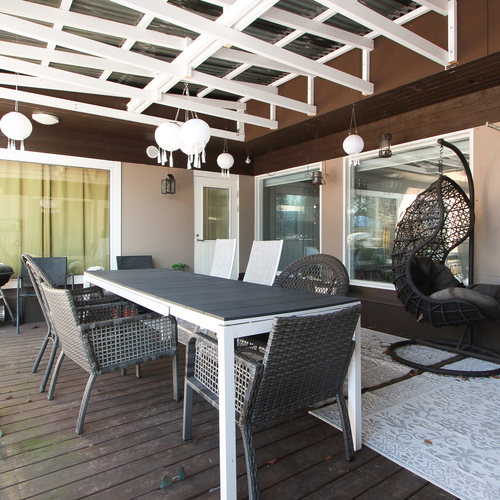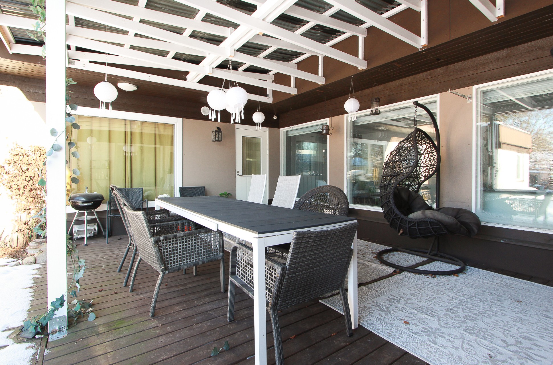 Katettu patio paljuineen tarjoaa suojaisan paikan oleskeluun ja illanviettoon.