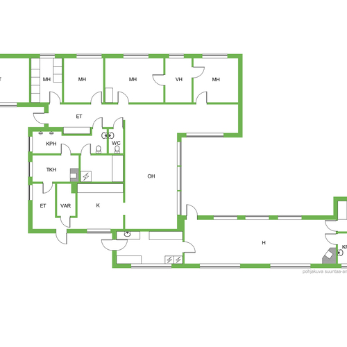 Talo on yksitasoinen, mikä tekee arjesta sujuvaa ja esteettömämpää. Rakennus on jaettu kahteen erilliseen huoneistoon, mikä mahdollistaa joustavan asumisen tai vuokratulon. Suuremmassa huoneistossa on viisi huonetta, toimiva Noblessa keittiö, tilava ja valoisa olohuone yhdistettynä ruokailutilaan, pesutilat, kaksi wc:tä, vaatehuone sekä takkahuone.