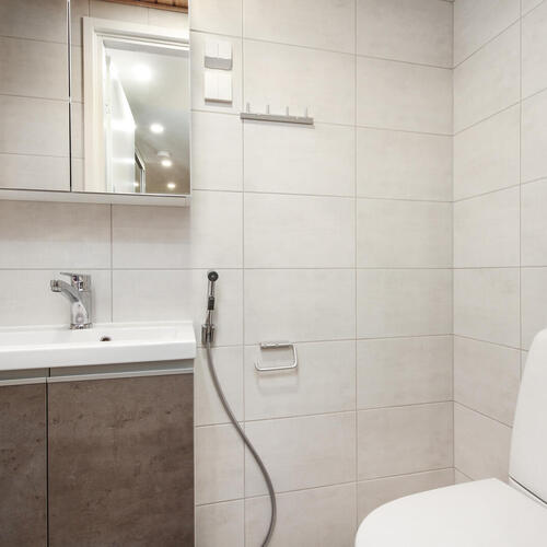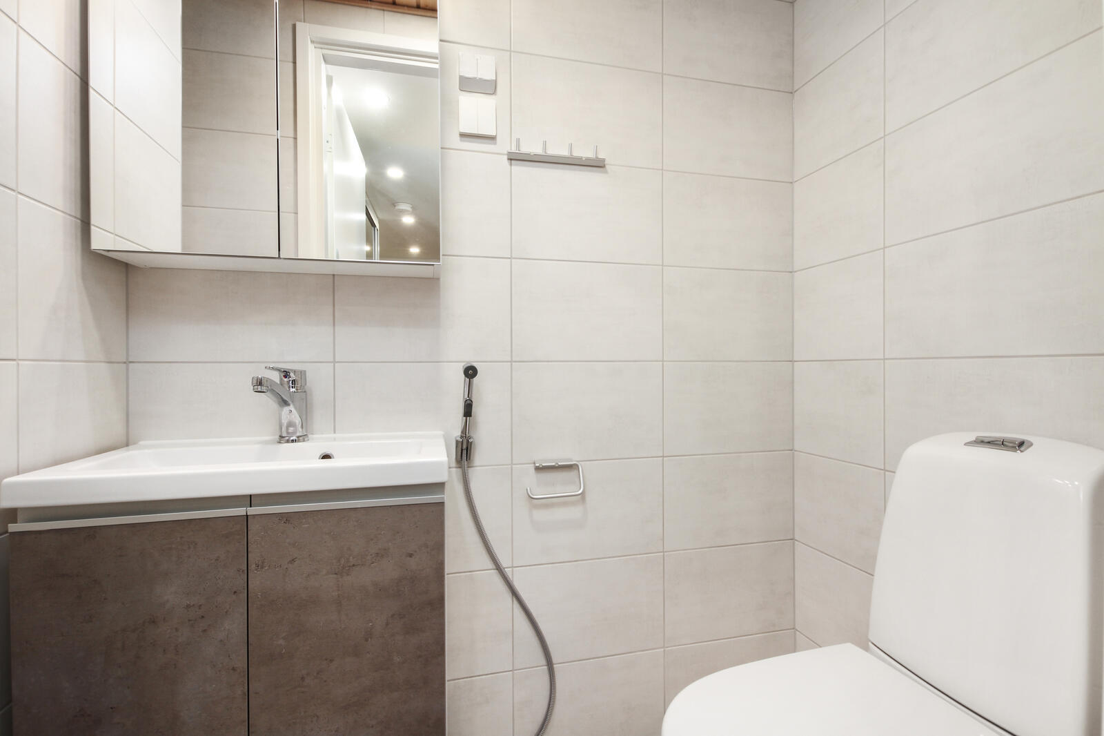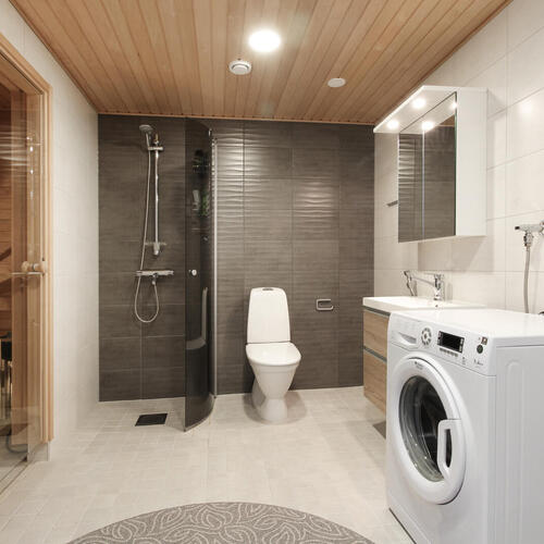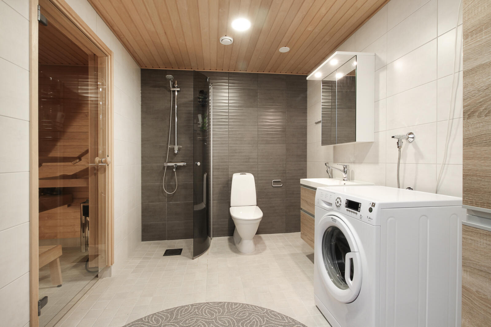 Varusteet: suihku, lattialämmitys, pesukoneliitäntä, peili, allaskaappi
