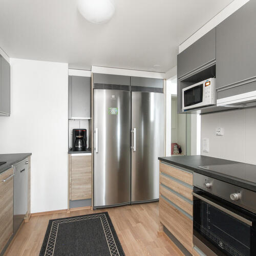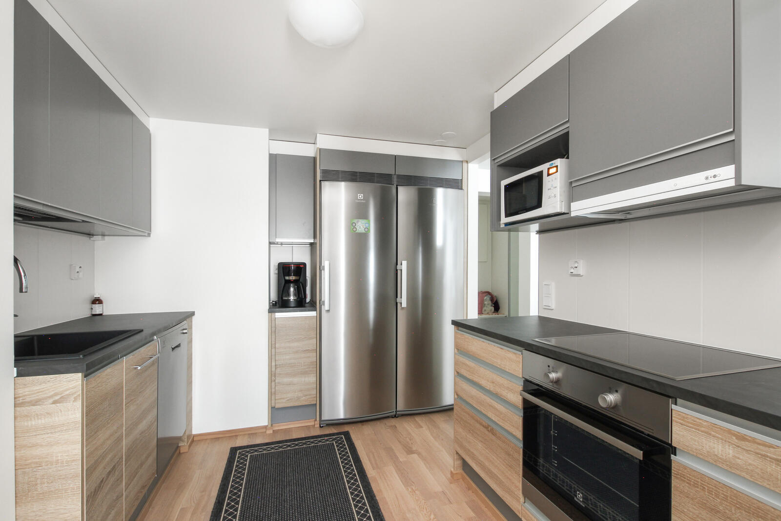Varusteet: jääkaappi, pakastin, astianpesukone, astianpesukoneliitäntä, keraaminen liesi, liesituuletin