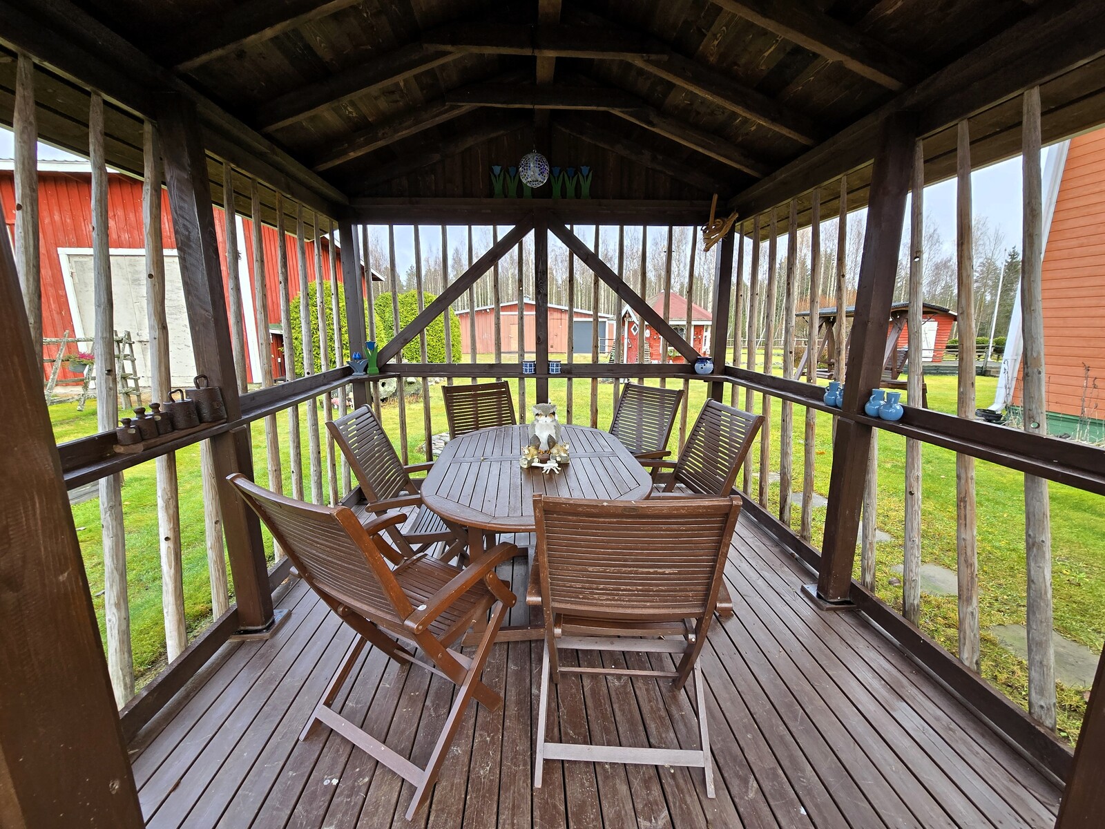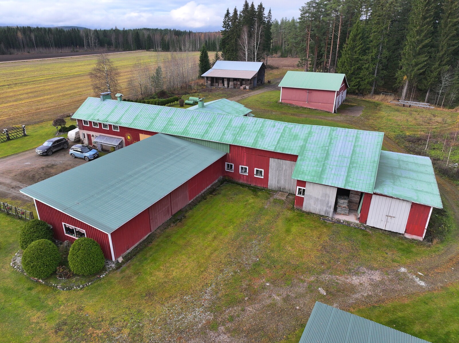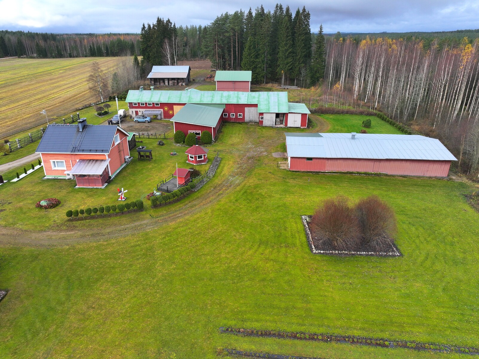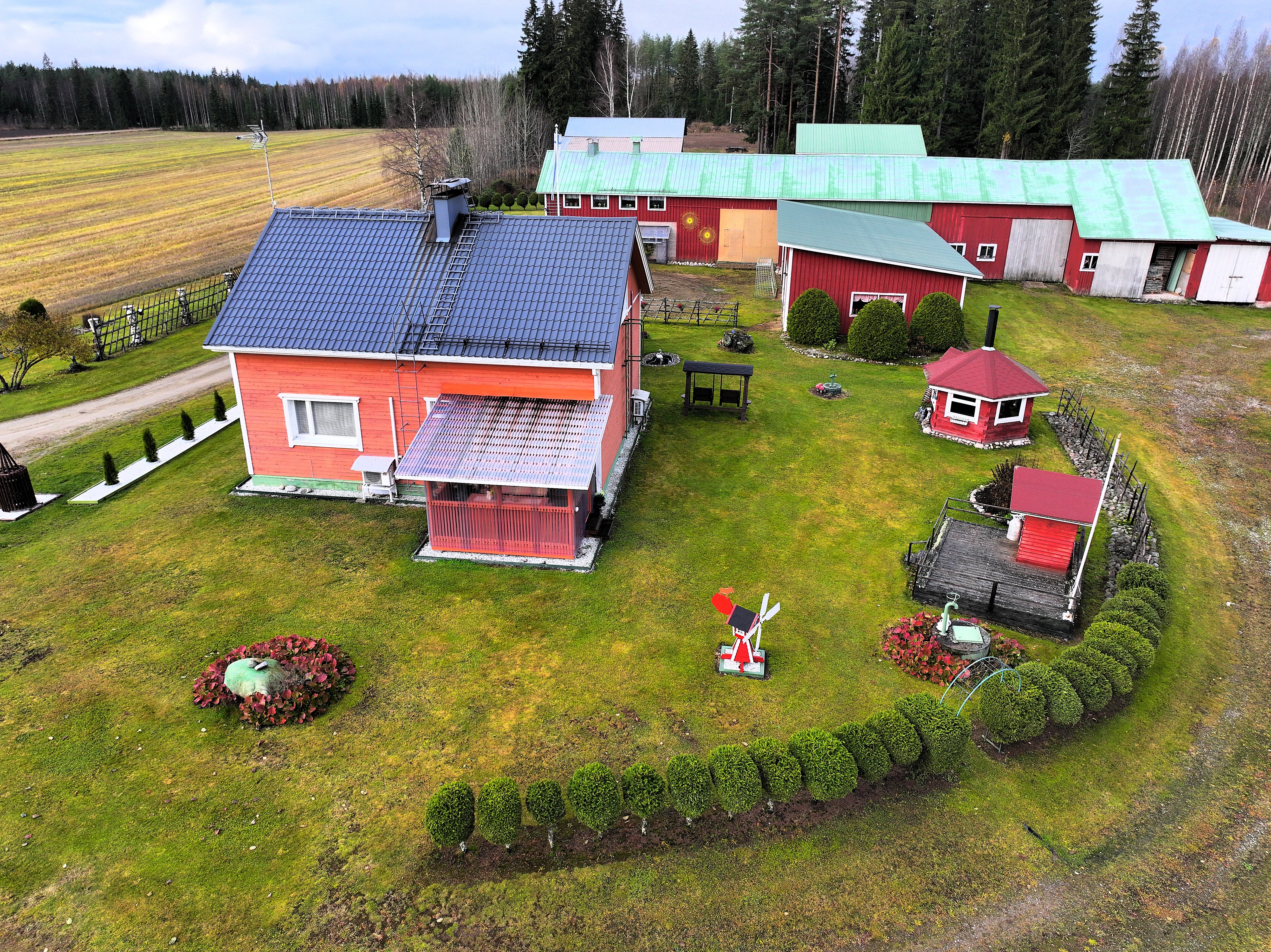 Tilava, yli kuuden hehtaarin tontti tarjoaa monipuoliset käyttömahdollisuudet. Osa maasta on peltoa, osa metsäistä maastoa. Pihapiirin ympärillä sijaitsee useita hyväkuntoisia lisärakennuksia, kuten varastoja, autotalli, navettarakennus, paja ja suuri varastohalli. Nämä tilat sopivat erinomaisesti harrastajalle, yrittäjälle tai sinulle, joka tarvitset reilusti säilytys- ja työtilaa. Lisäksi pihassa on grillikota, jossa voi nauttia yhteisistä hetkistä vuodenajasta riippumatta.