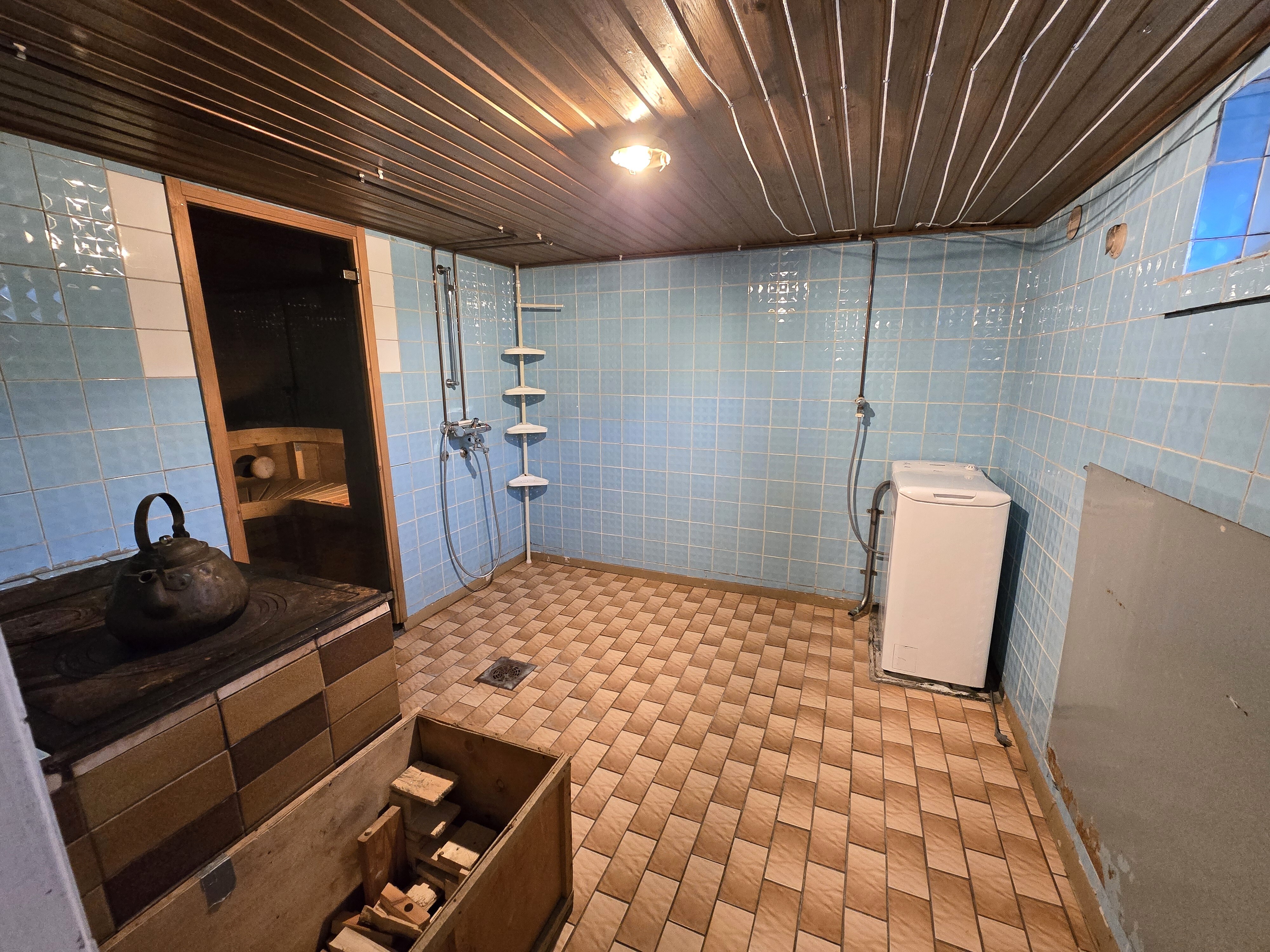 Sauna alakerrassa, sauna paneloitu. Lattiassa laatta.