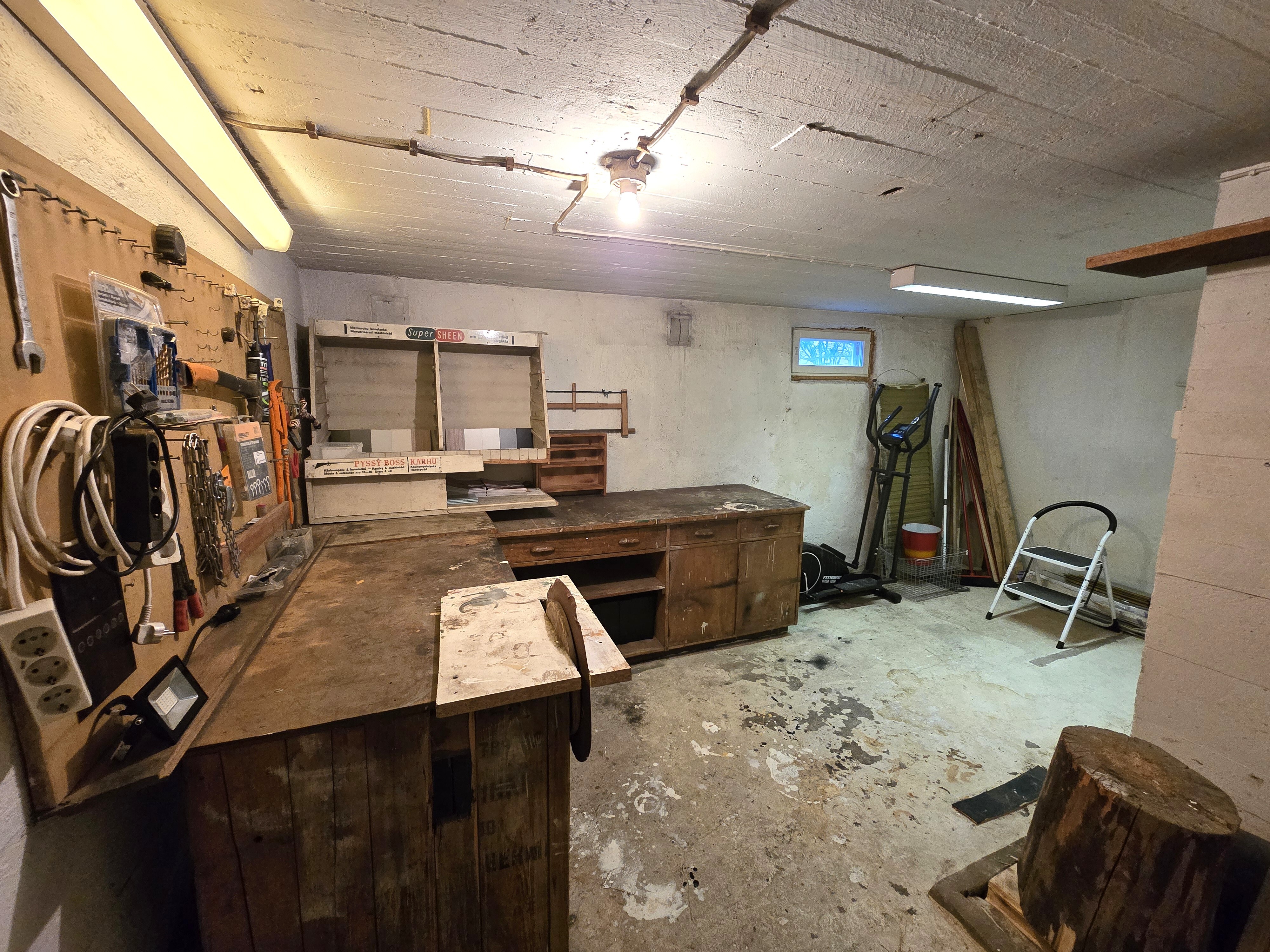 Kellaritiloissa erillinen työtila ja verstas.