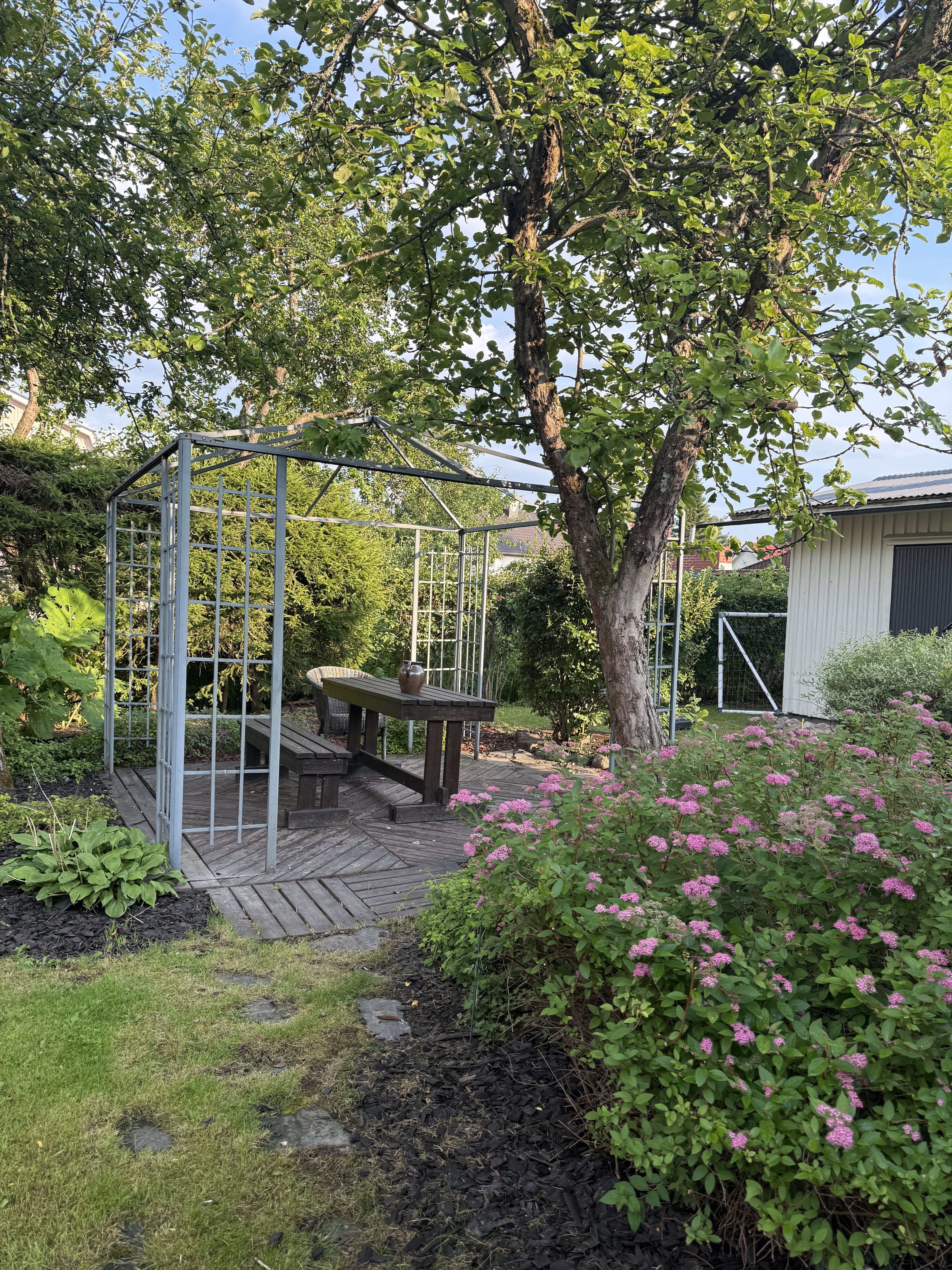 Oma vehreä tontti 855 m² on rehevä ja suojassa oleva puutarha monipuolisine istutuksineen tarjoaa loistavat puitteet oleskeluun ja lasten leikkeihin. Pensas- ja havuaidat tuovat yksityisyyttä ja idyllistä tunnelmaa.
