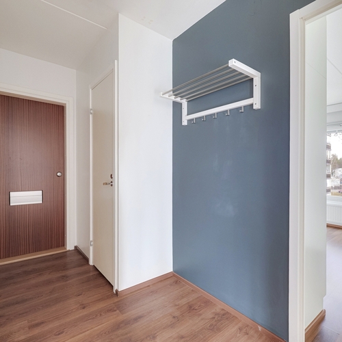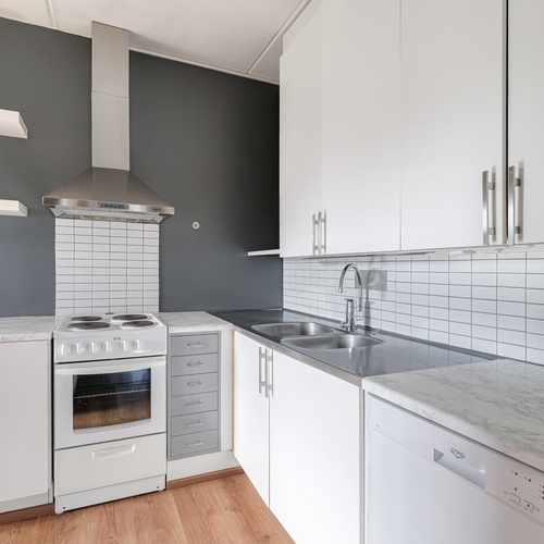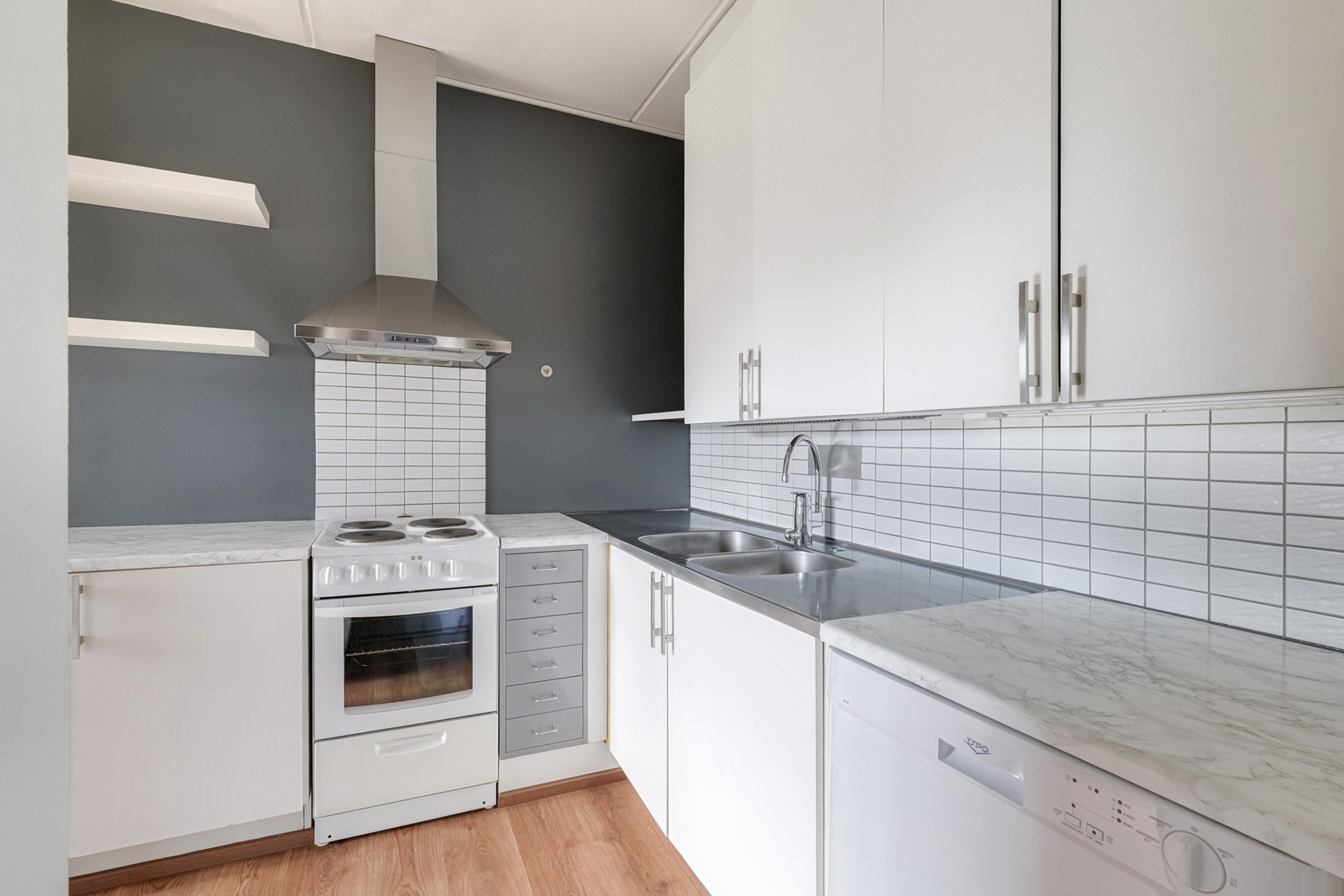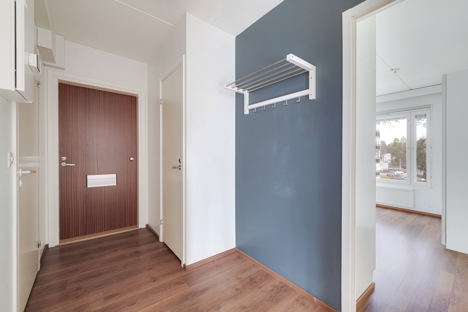 Asunnon 58,50 neliötä on käytetty toimivasti. Keittiö on varustettu astianpesukoneella ja sujuvalla pohjaratkaisulla, ja eteisestä löytyvä erillinen vaatehuone helpottaa arjen tavaroiden säilytystä.