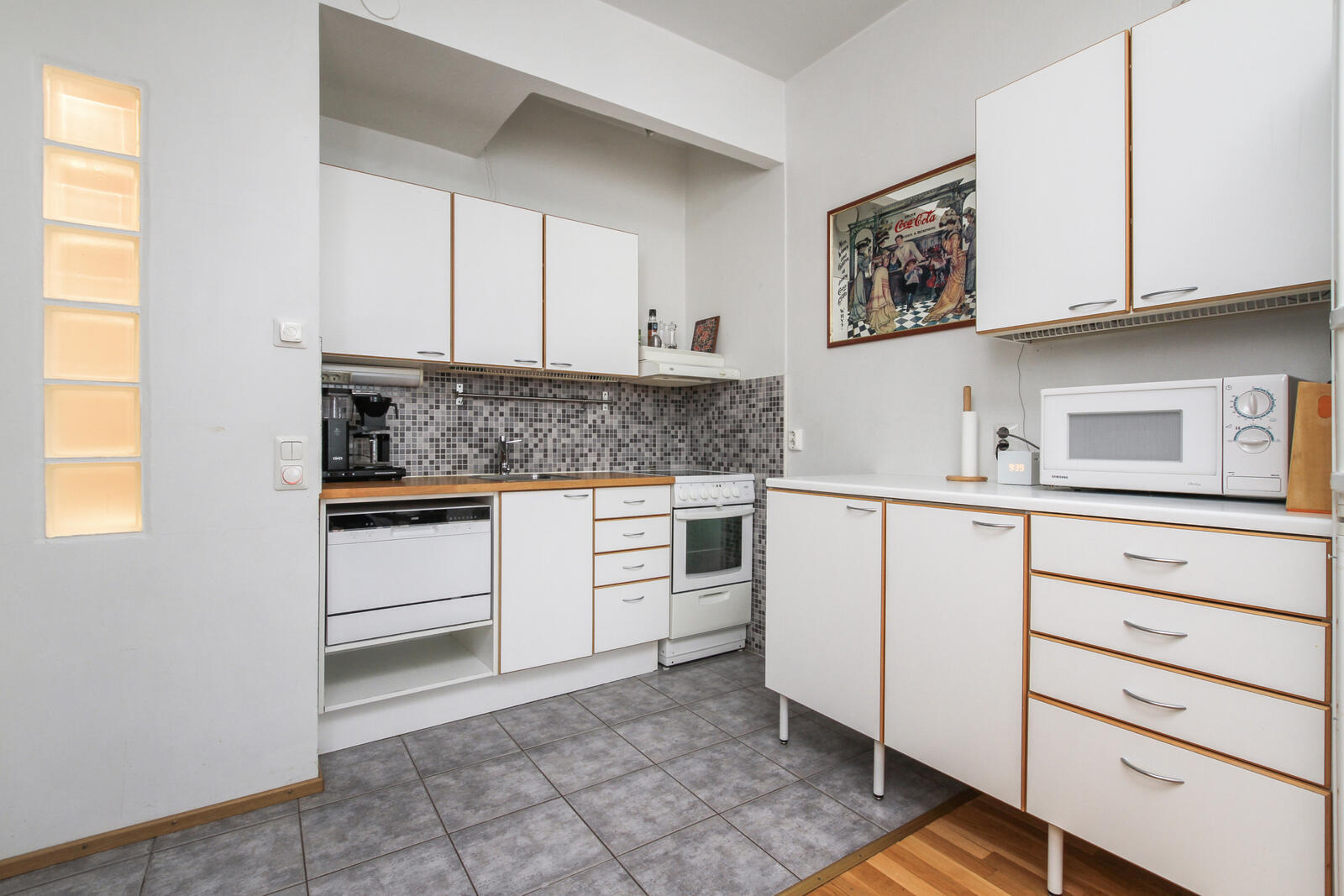Keittiön kuvaus Varusteet: jääkaappipakastin, keraaminen liesi, liesituuletin, astianpesukone, astianpesukoneliitäntä