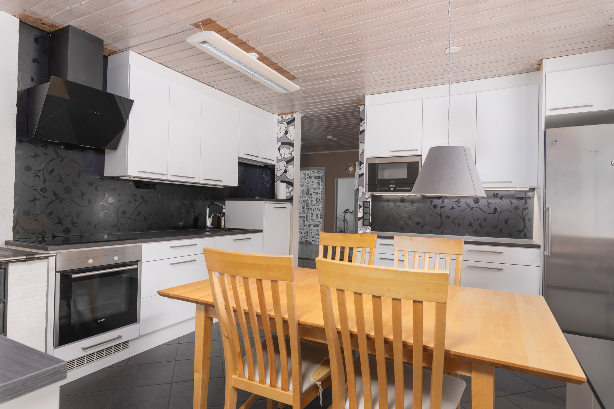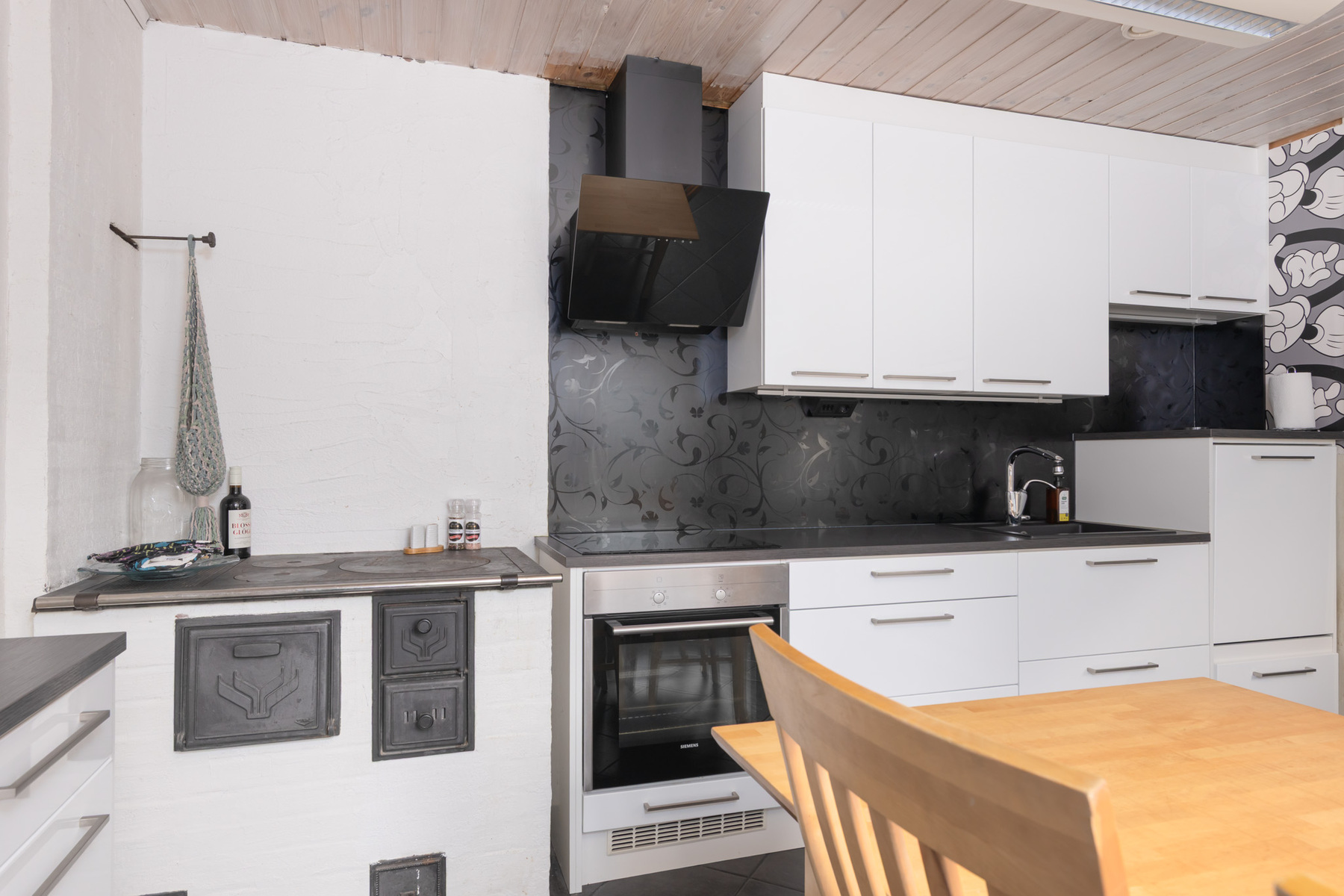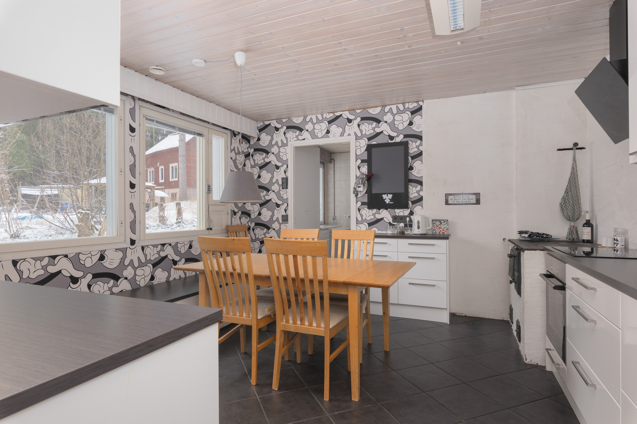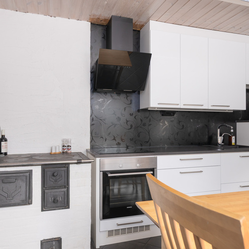 Varaava takka olohuoneessa, keittiössä puuhella.