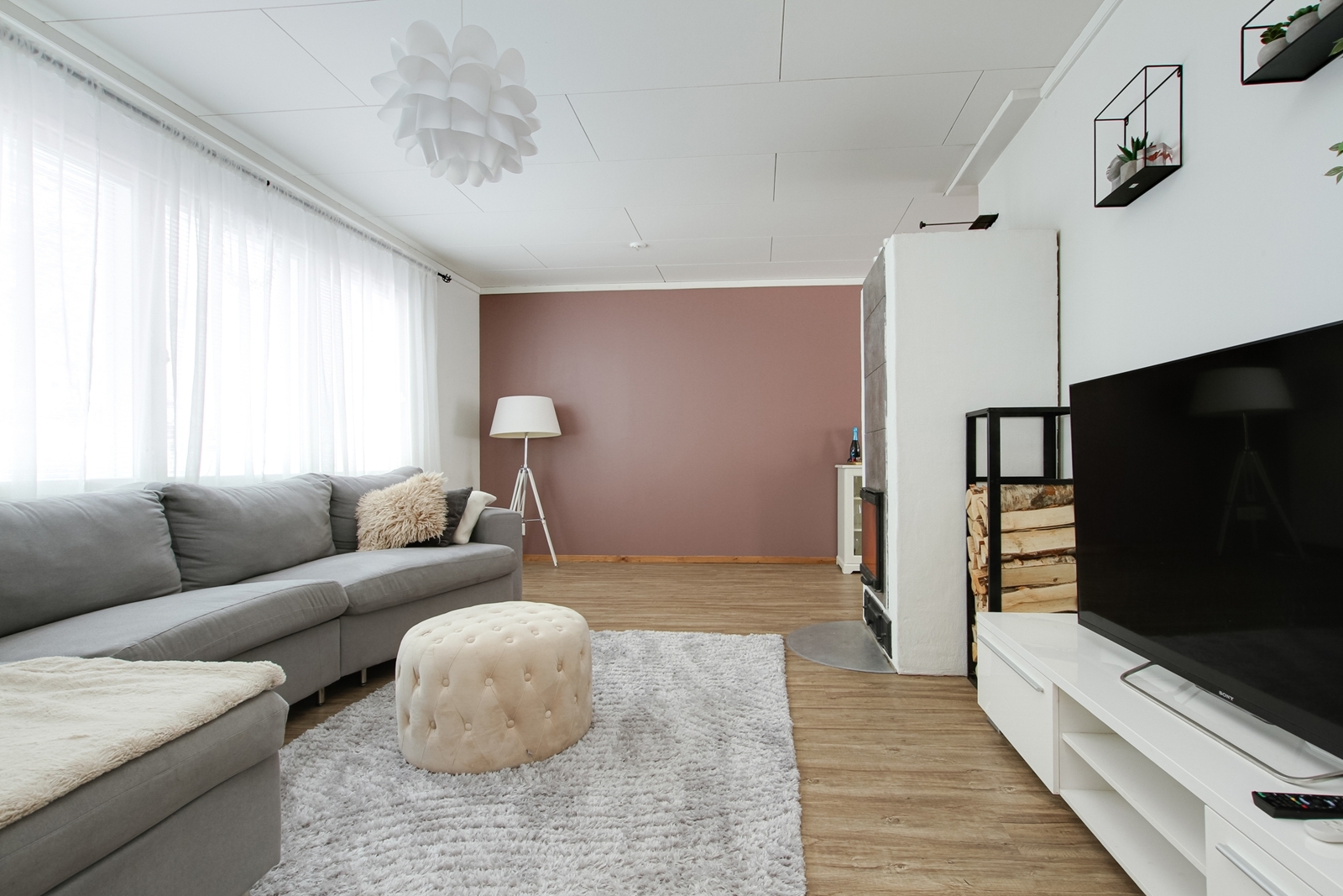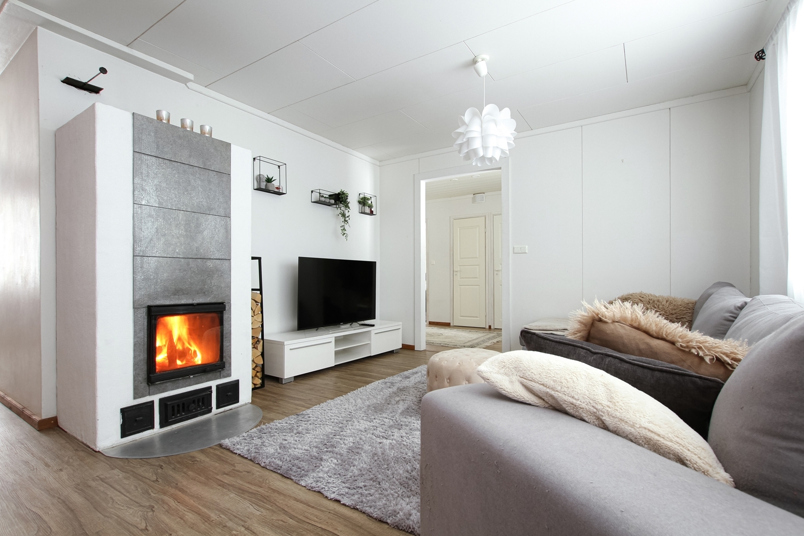Olohuoneessa varaava takka, paikalla muurattu 2022