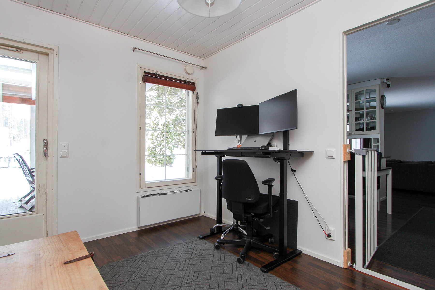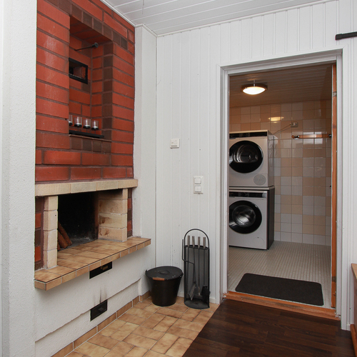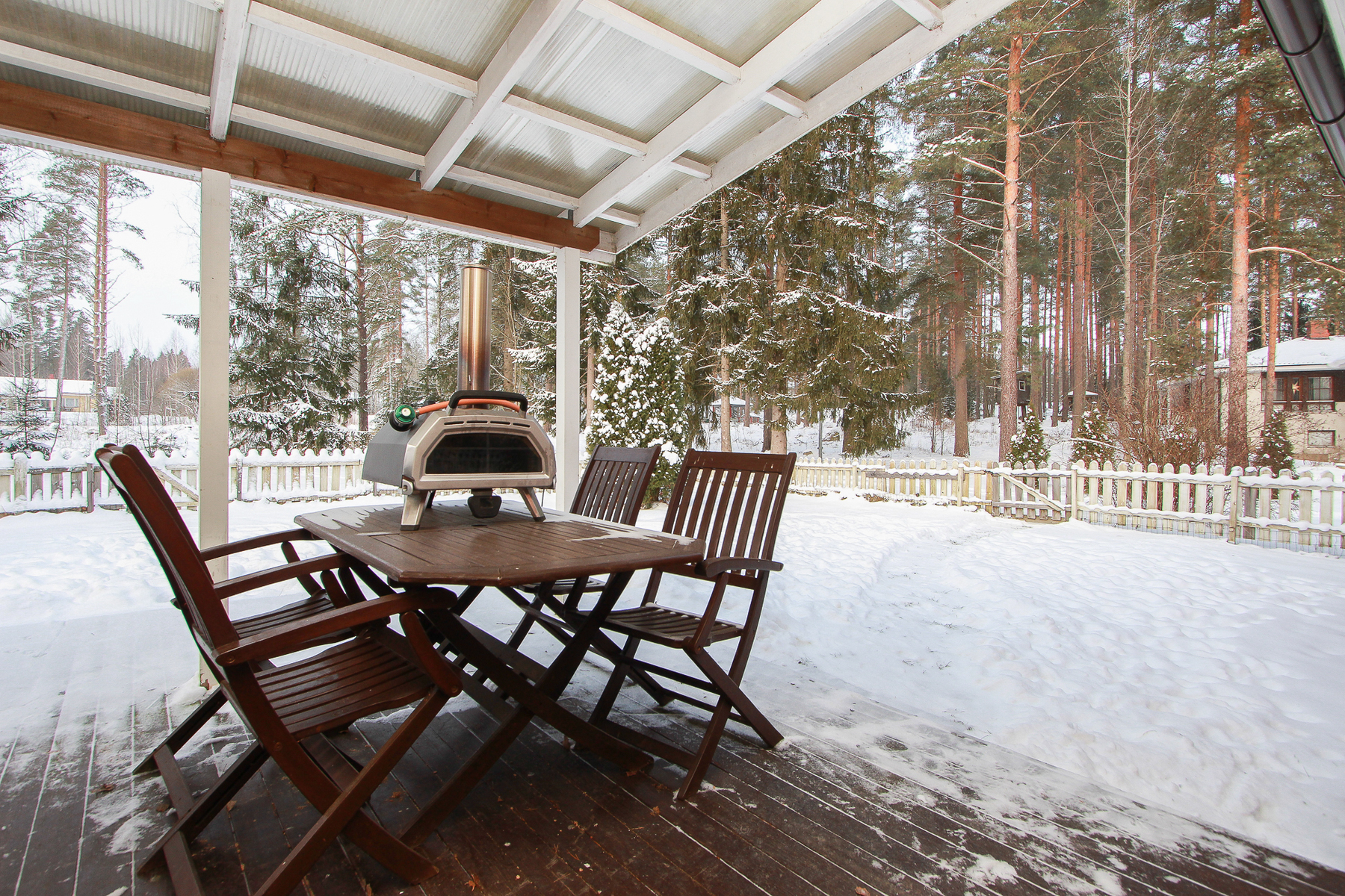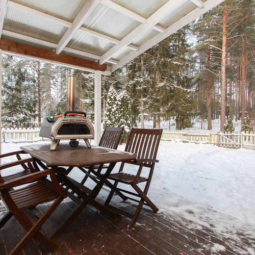 Valokatetulle terassille kulku takkahuoneesta.