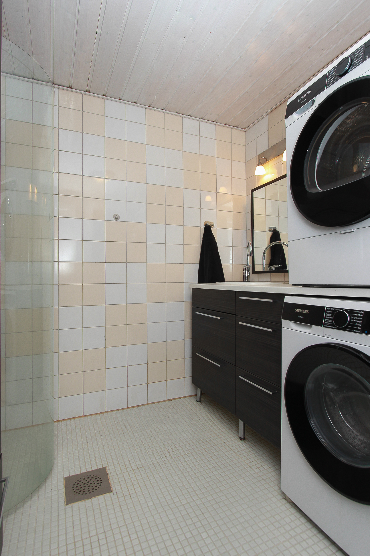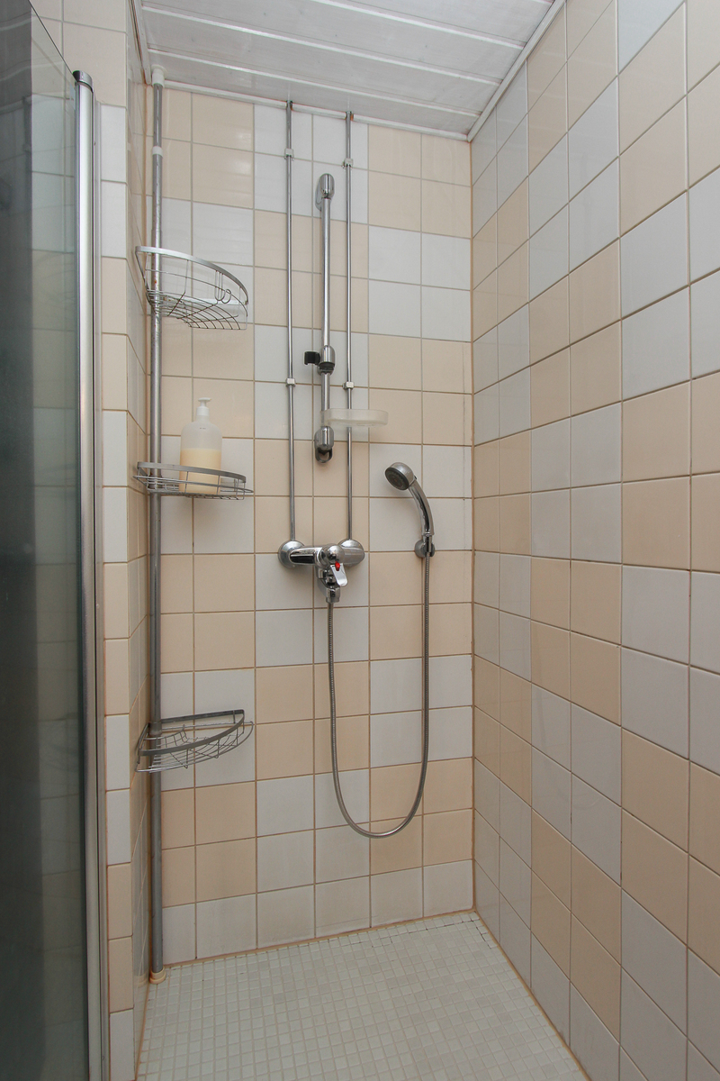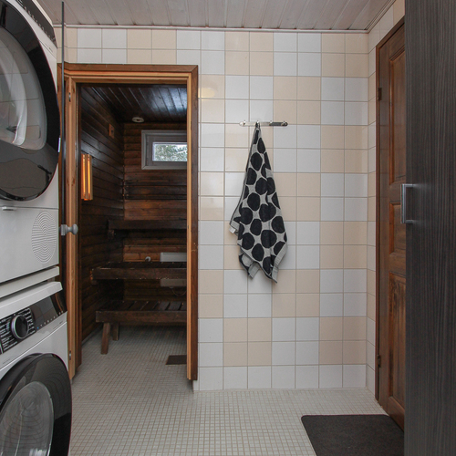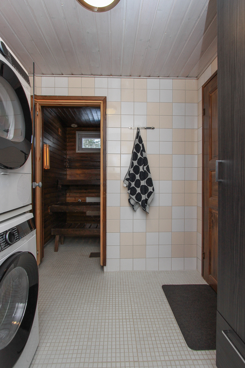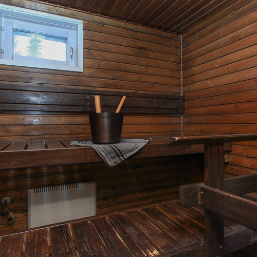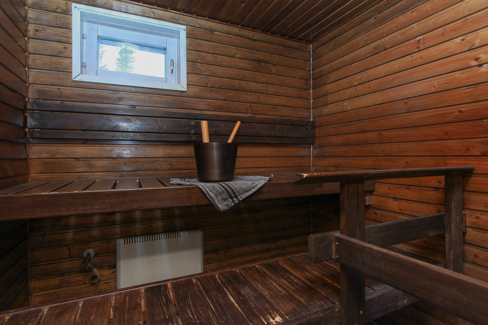 Sähkökiuas, lauteet, ikkuna. Lattiassa laatta, seinät paneloitu.