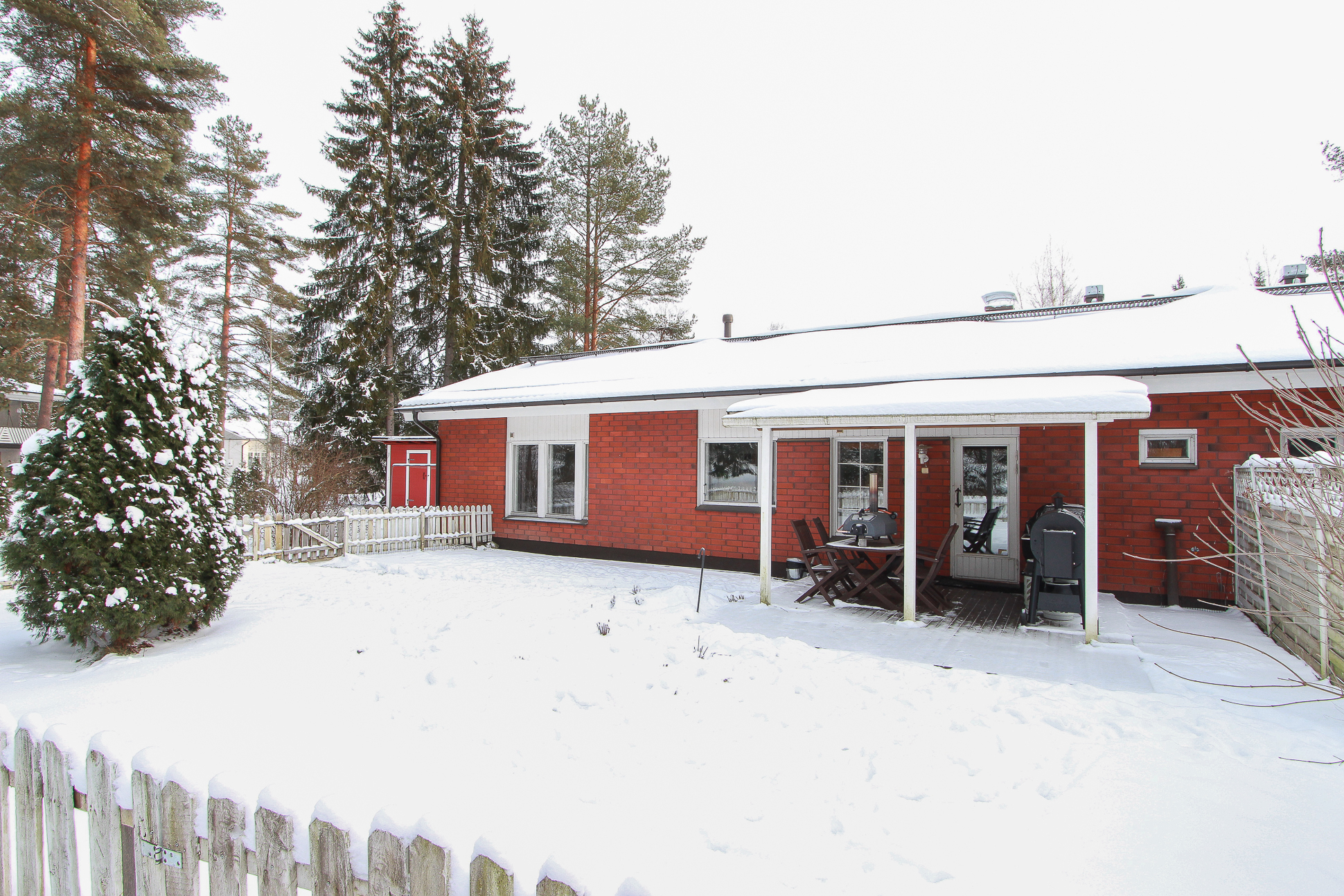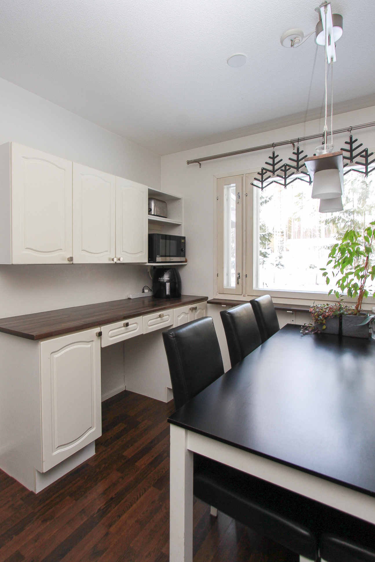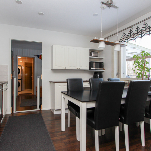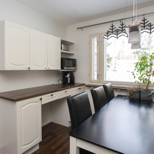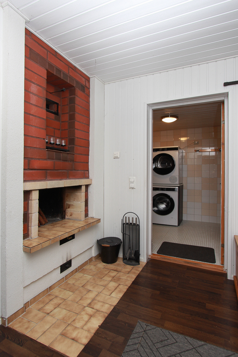 Keittiössä on riittävästi taso- ja kaappitilaa ja paikka isommallekin ruokapöydälle.Takkahuoneesta on käynti valokatetulle terassille ja pihalle. Osa takapihasta on aidattu. Avotakka tuo tunnelmaa ja ilmalämpöpumppu lisää asumismukavuutta ympäri vuoden.